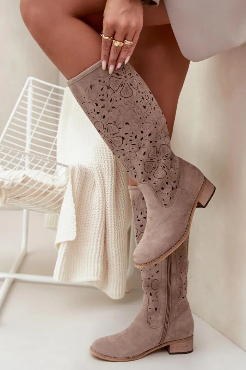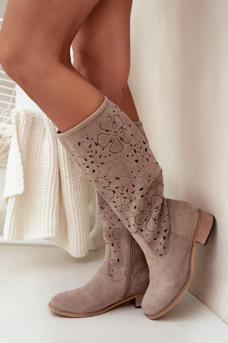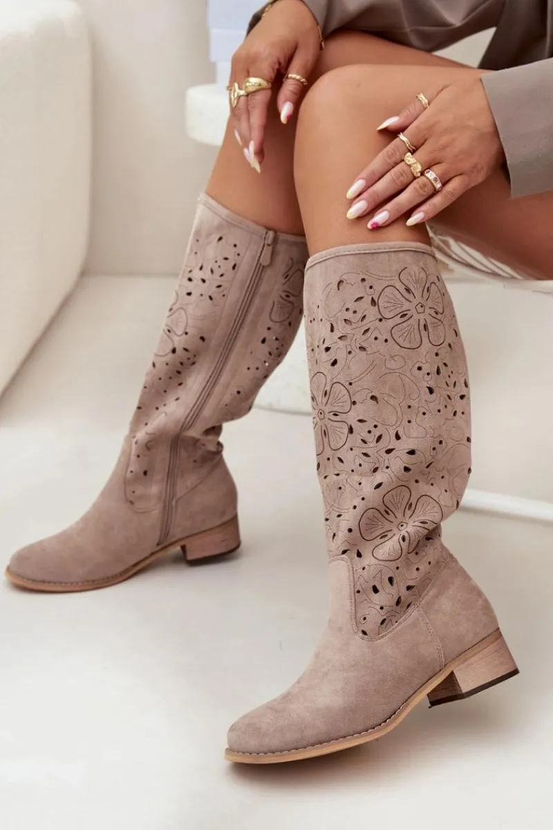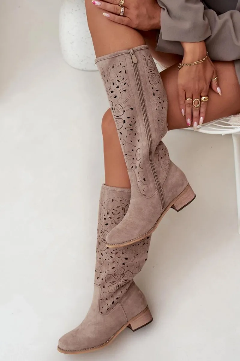 Kozaki Ocieplane|Kozaki Ażurowe>Boto Ażurowe Kozaki Damskie Na Niskim Obcasie Eko Zamszowe Zapinane Na Zamek Beżowe Orchides