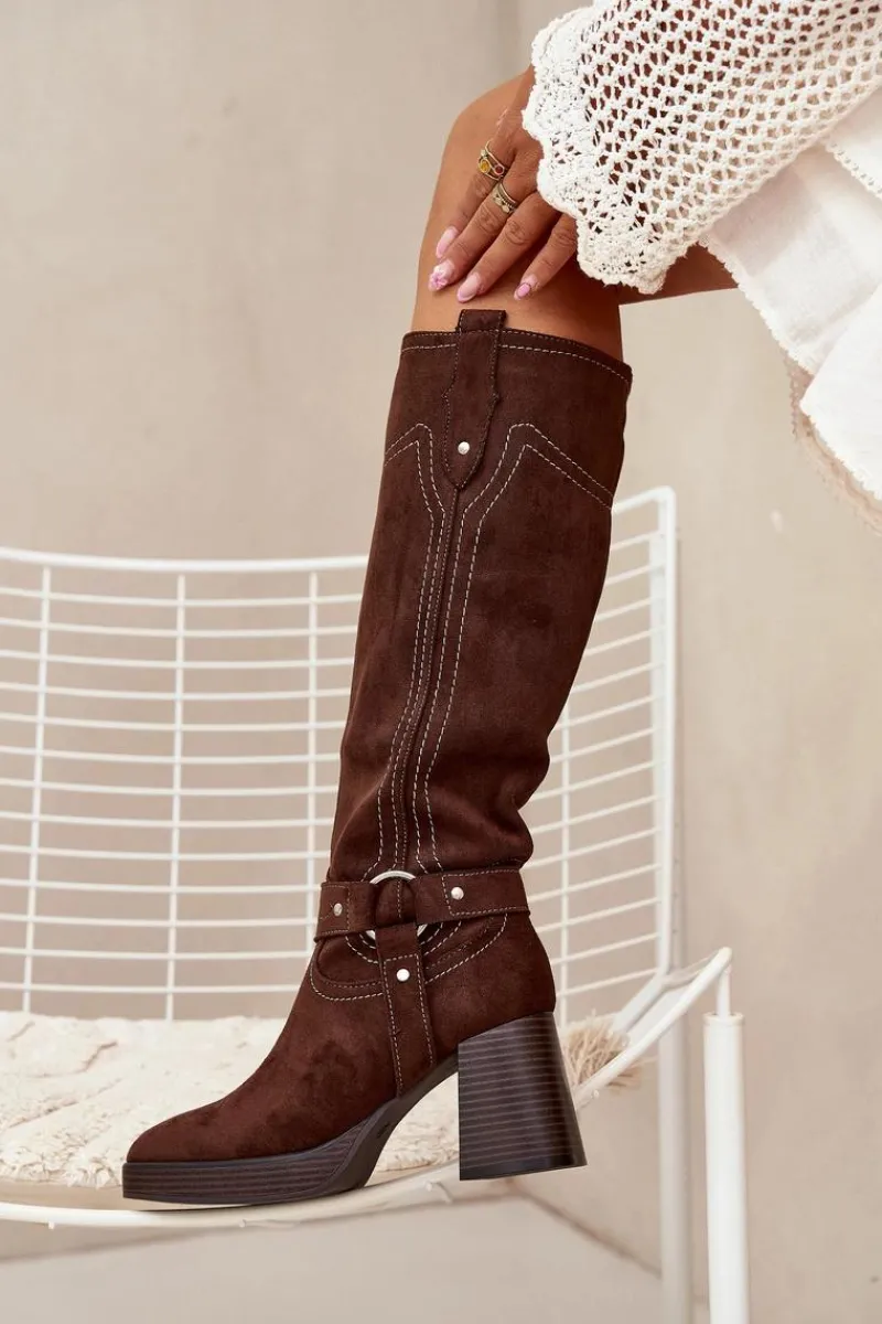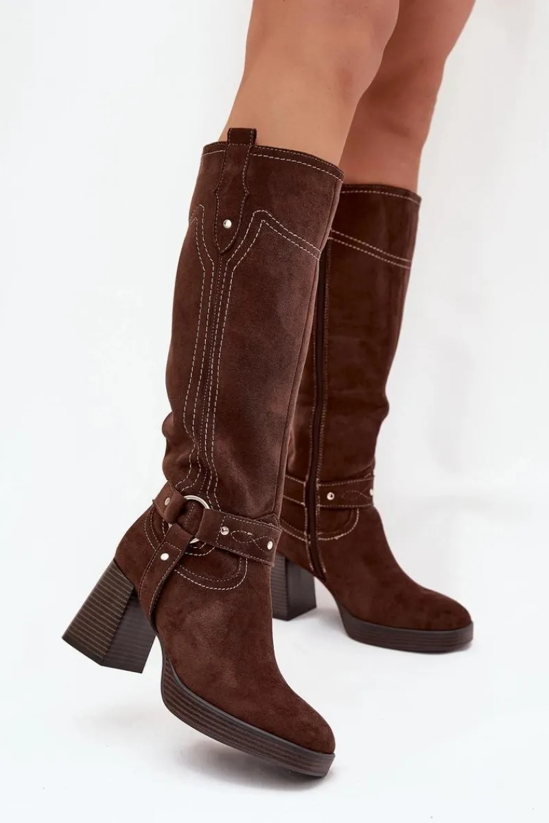 Kozaki damskie wykonane z eko zamszu. Osadzone na słupkowym obcasie. Zapinane na zamek, zapewniają łatwość zakładania, a ocieplenie kocem obuwniczym gwarantuje ciepło w chłodniejsze dni. Cholewka sięgająca do kolana ozdobiona jest subtelnym elementem z paskami oraz przeszyciami, które dodają butom charakteru. Te kozaki będą doskonałym wyborem do eleganckich i casualowych stylizacji, zapewniając komfort i modny wygląd. Przy wyborze rozmiaru prosimy sugerować się tabelą rozmiarów.