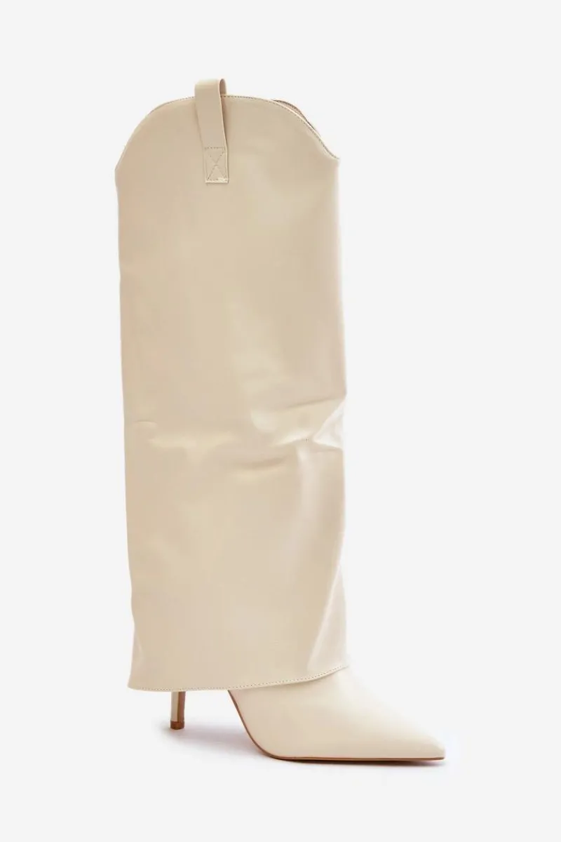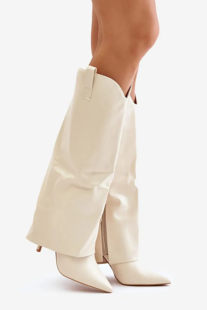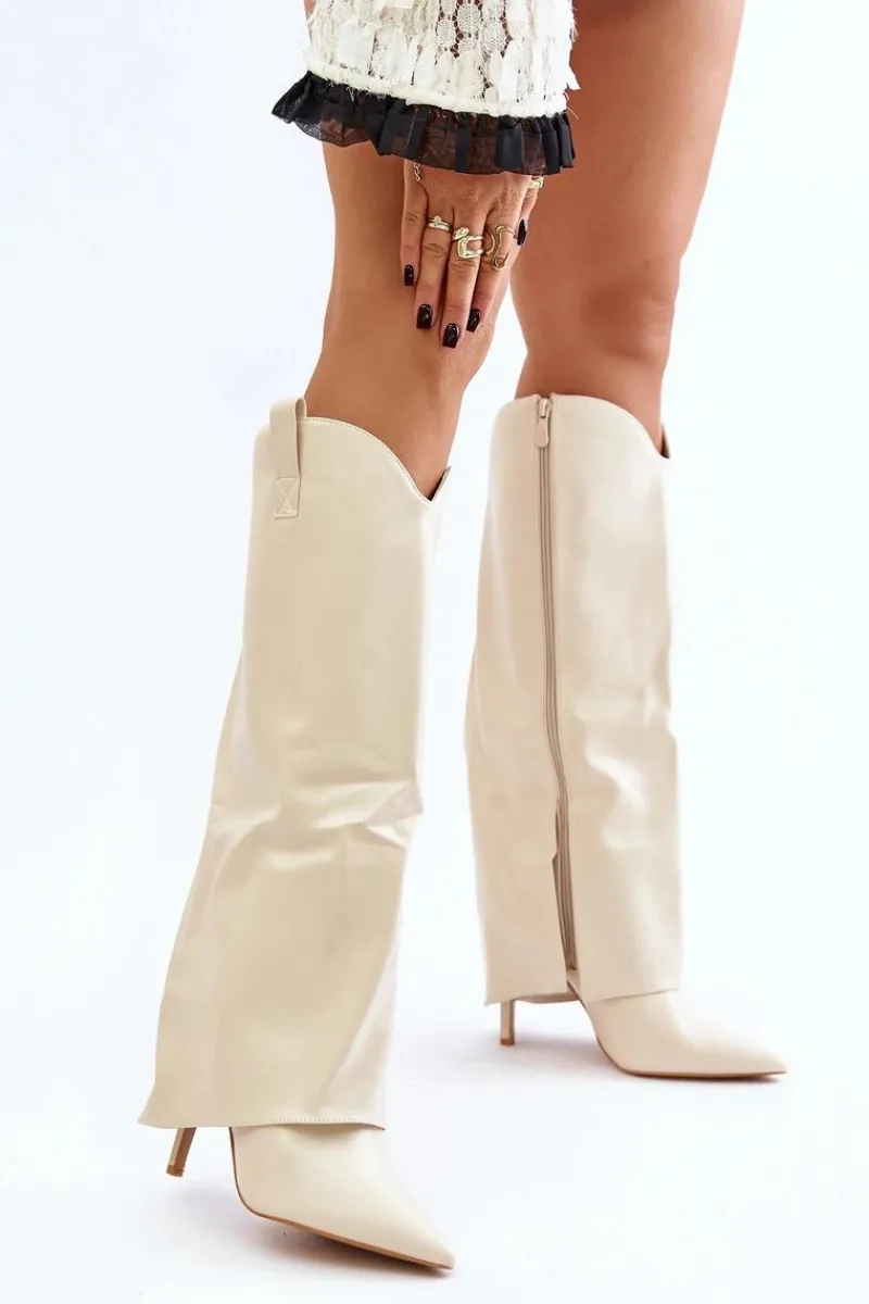 Kozaki wykonane z eko skóry, wyróżniają się wywiniętą cholewką, która efektownie zachodzi na obcas. Model posiada noski w szpic, dodające mu szyku, a zamek po boku ułatwia zakładanie i zdejmowanie butów. Osadzone na smukłej szpilce, sięgają do kolana, podkreślając kobiecą sylwetkę. Idealne do eleganckich, jesienno-zimowych stylizacji! Przy wyborze rozmiaru prosimy sugerować się tabelą rozmiarów.