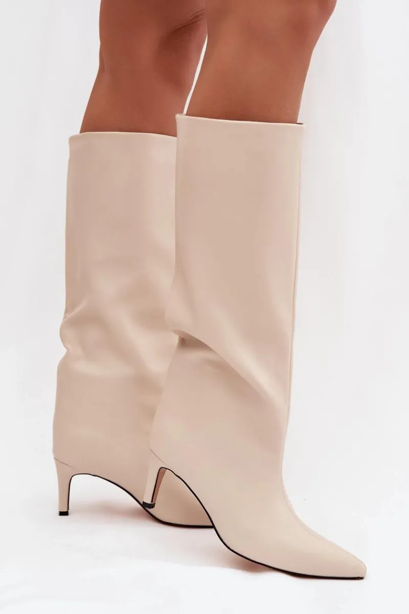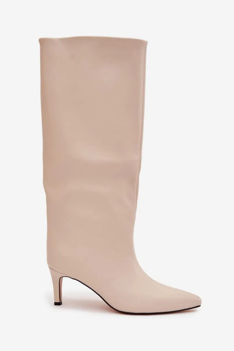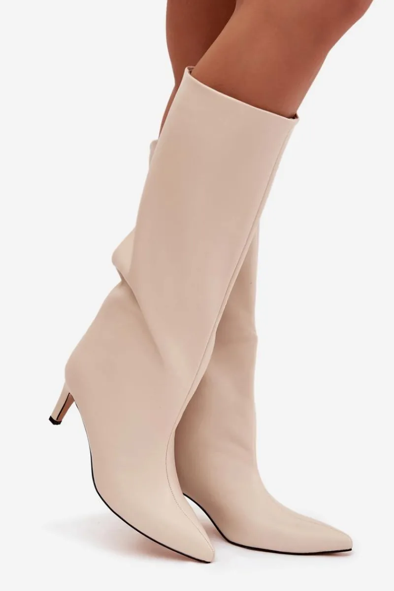 Kozaki damskie wsuwane ocieplane na szpilce jasnobeżowe Olivienne