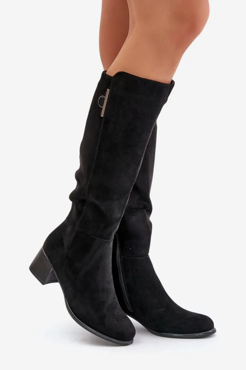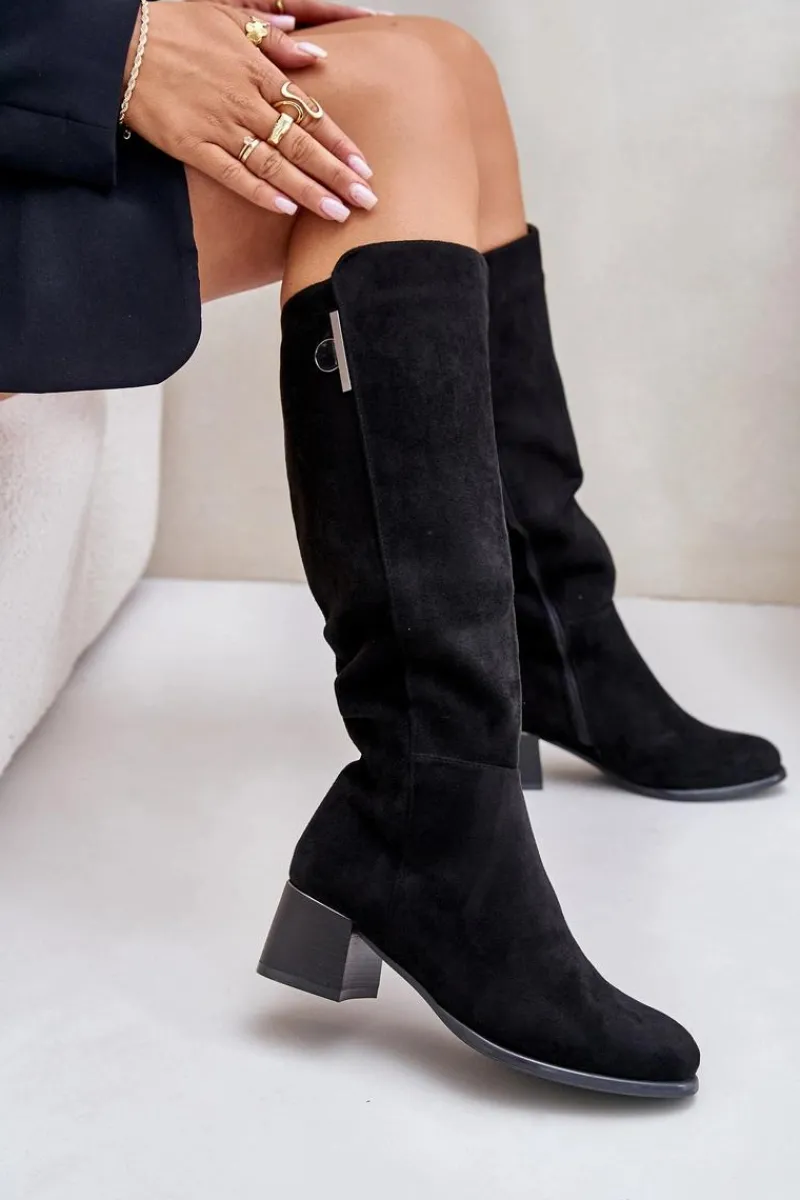 Botki marki Jezzi wykonane z eko zamszu to elegancki wybór na chłodniejsze dni. Model osadzony na obcasie typu klocek, który zapewnia stabilność i komfort noszenia. Cholewka sięga przed kolano, dodając stylowego wyglądu i optycznie wydłużając nogi. Zapięcie na zamek ułatwia zakładanie, a ocieplenie kocem obuwniczym gwarantuje ciepło. Model ten idealnie sprawdzi się do stylizacji z sukienkami i spódnicami. Przy wyborze rozmiaru prosimy sugerować się tabelą rozmiarów.