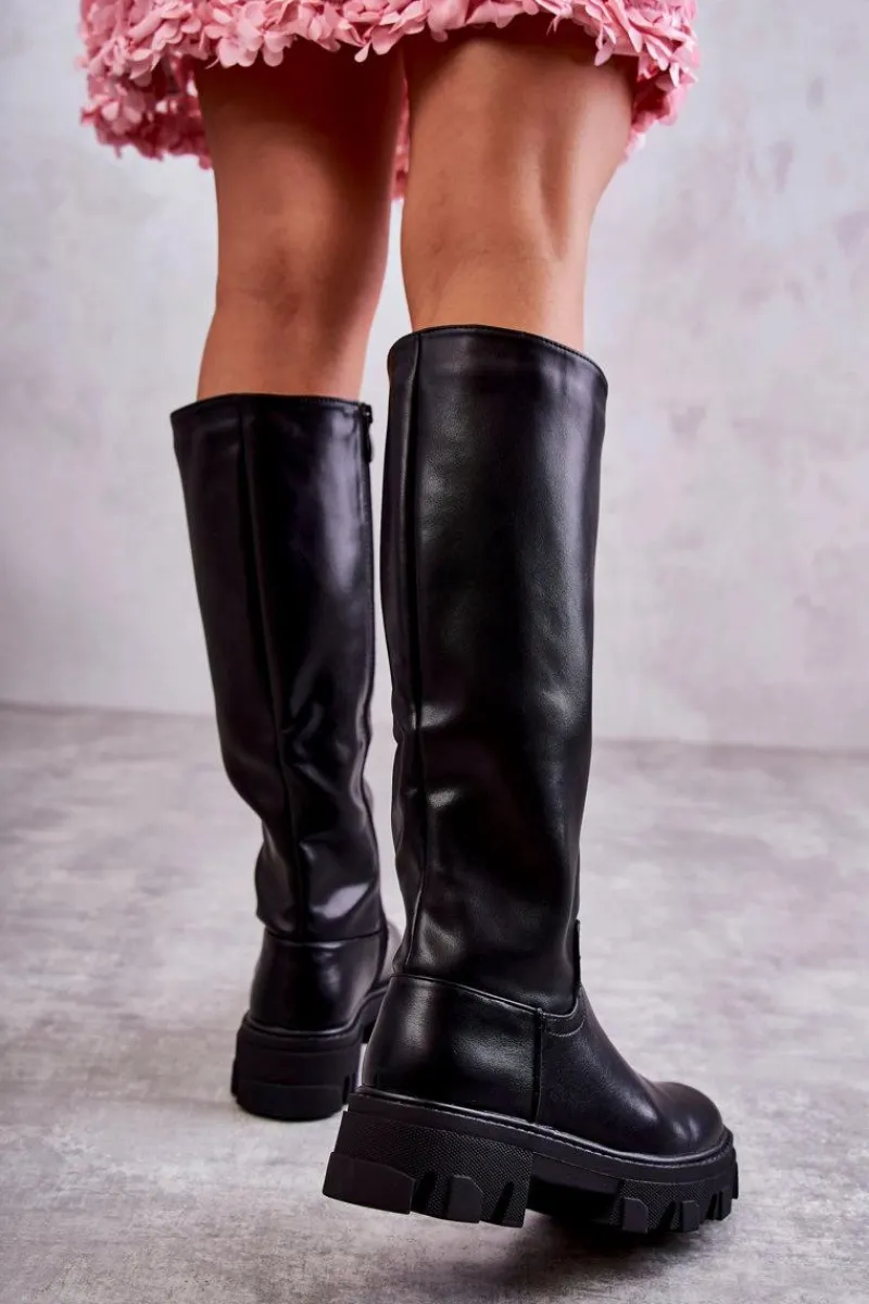 Klasyczne damskie kozaki osadzone na płaskim obcasie i platformie. Zostały wykonane z miękkiej eko skóry. Cholewka do kolana z suwakiem na całej długości. Nosek zaokrąglony. Buty te posiadają usztywniany zapiętek. Model ze żłobieniami po bokach podeszwy. Te kozaki powinny być Twoje! Świetnie będą prezentować się z sukienkami lub spódniczkami mini. Przy wyborze rozmiaru prosimy kierować tabelą rozmiarów.