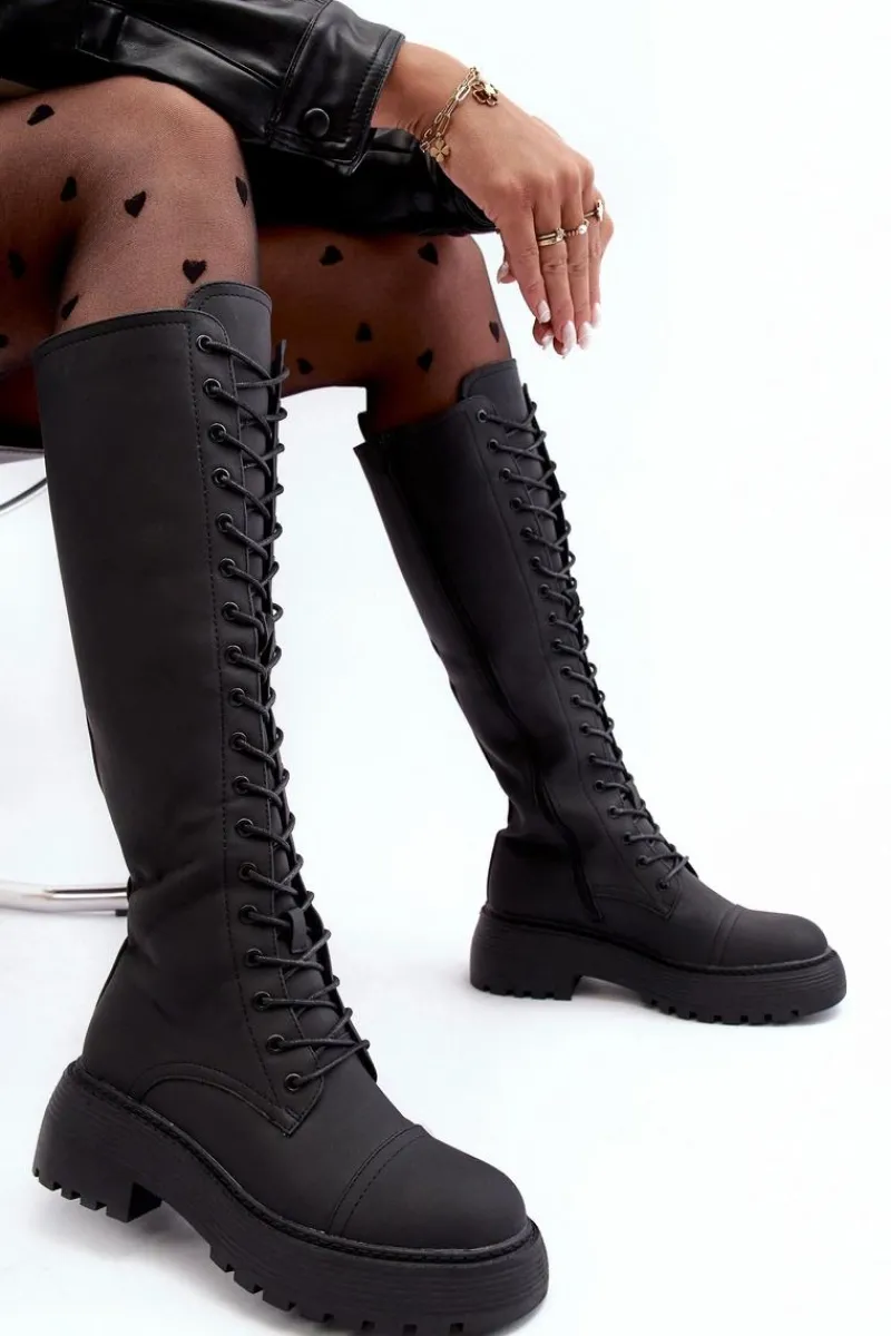 Damskie kozaki — glany posiadają sznurowanie oraz suwak na całości cholewki. Wykonane z eko skóry. Cholewka przed kolano. Środek ocieplony kocem obuwniczym. Model ten osadzony jest na płaskim obcasie i platformie. Przy wyborze rozmiaru prosimy kierować tabelą rozmiarów.