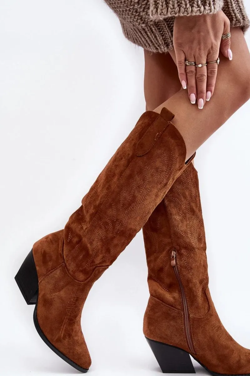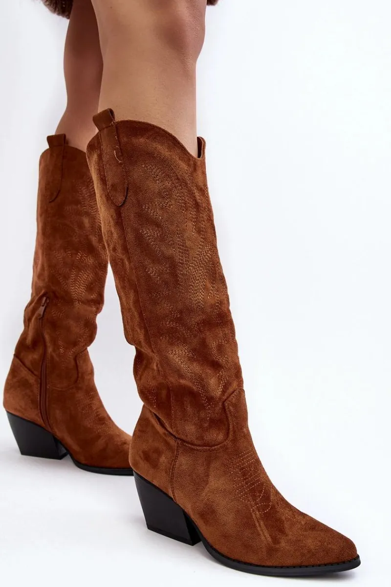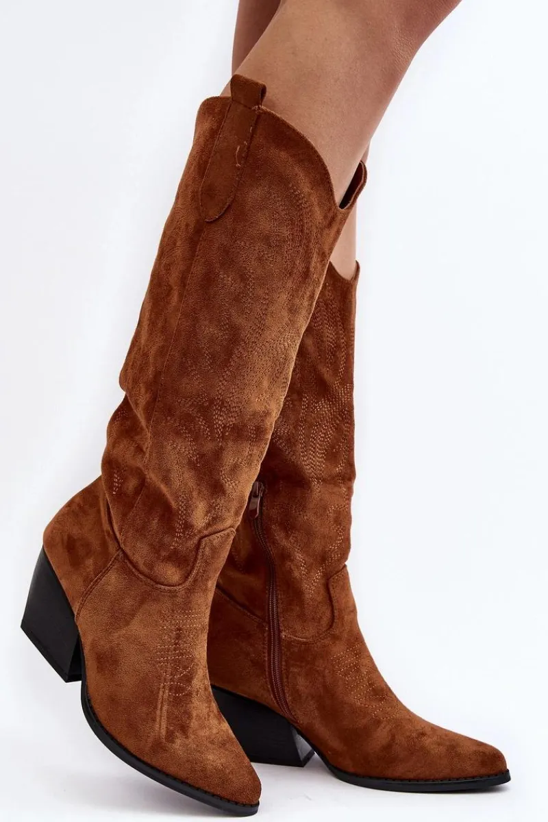 Damskie kozaki przed kolano wykonane z eko zamszu. Osadzone na obcasie w postaci niskiego słupka. Noski w szpic optycznie wysmuklą nogi. Zapiętek jest usztywniony. Miękka wkładka zapewni komfort podczas użytkowania. Cholewka ozdobiona licznymi przeszyciami. Model wsuwany z dodatkowym suwakiem. Świetnie sprawdzą się podczas jesiennych stylizacji! Przy wyborze rozmiaru prosimy sugerować się tabelą rozmiarów.