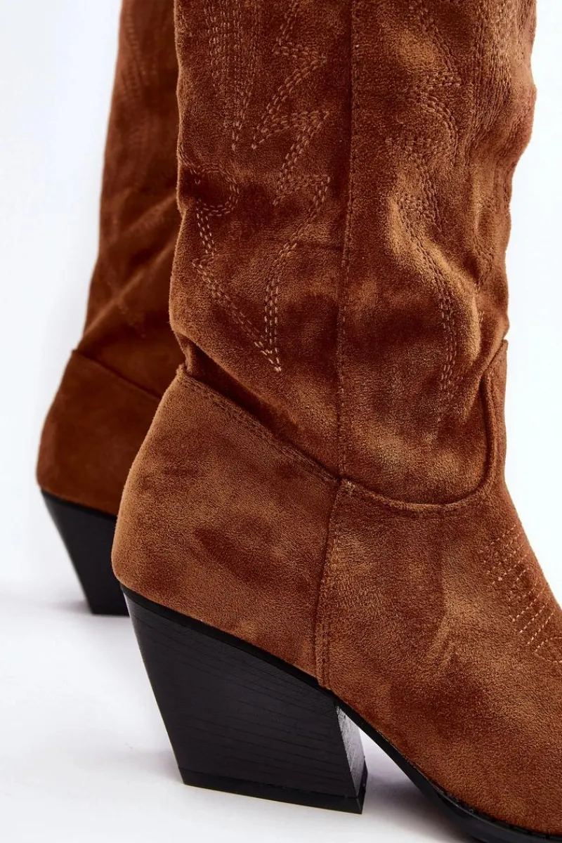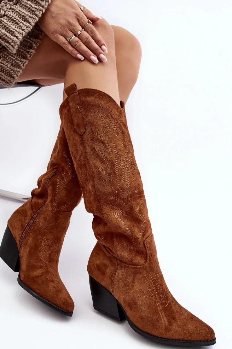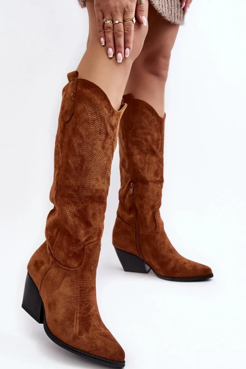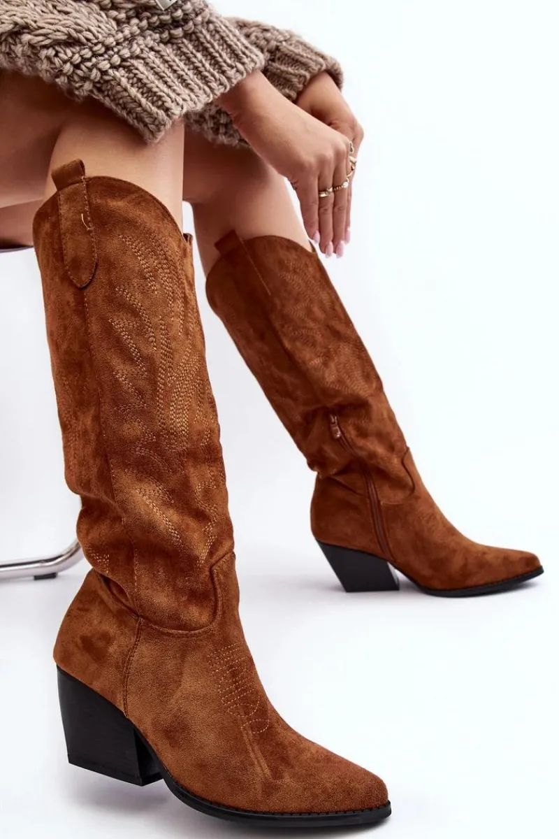 Damskie kozaki przed kolano wykonane z eko zamszu. Osadzone na obcasie w postaci niskiego słupka. Noski w szpic optycznie wysmuklą nogi. Zapiętek jest usztywniony. Miękka wkładka zapewni komfort podczas użytkowania. Cholewka ozdobiona licznymi przeszyciami. Model wsuwany z dodatkowym suwakiem. Świetnie sprawdzą się podczas jesiennych stylizacji! Przy wyborze rozmiaru prosimy sugerować się tabelą rozmiarów.