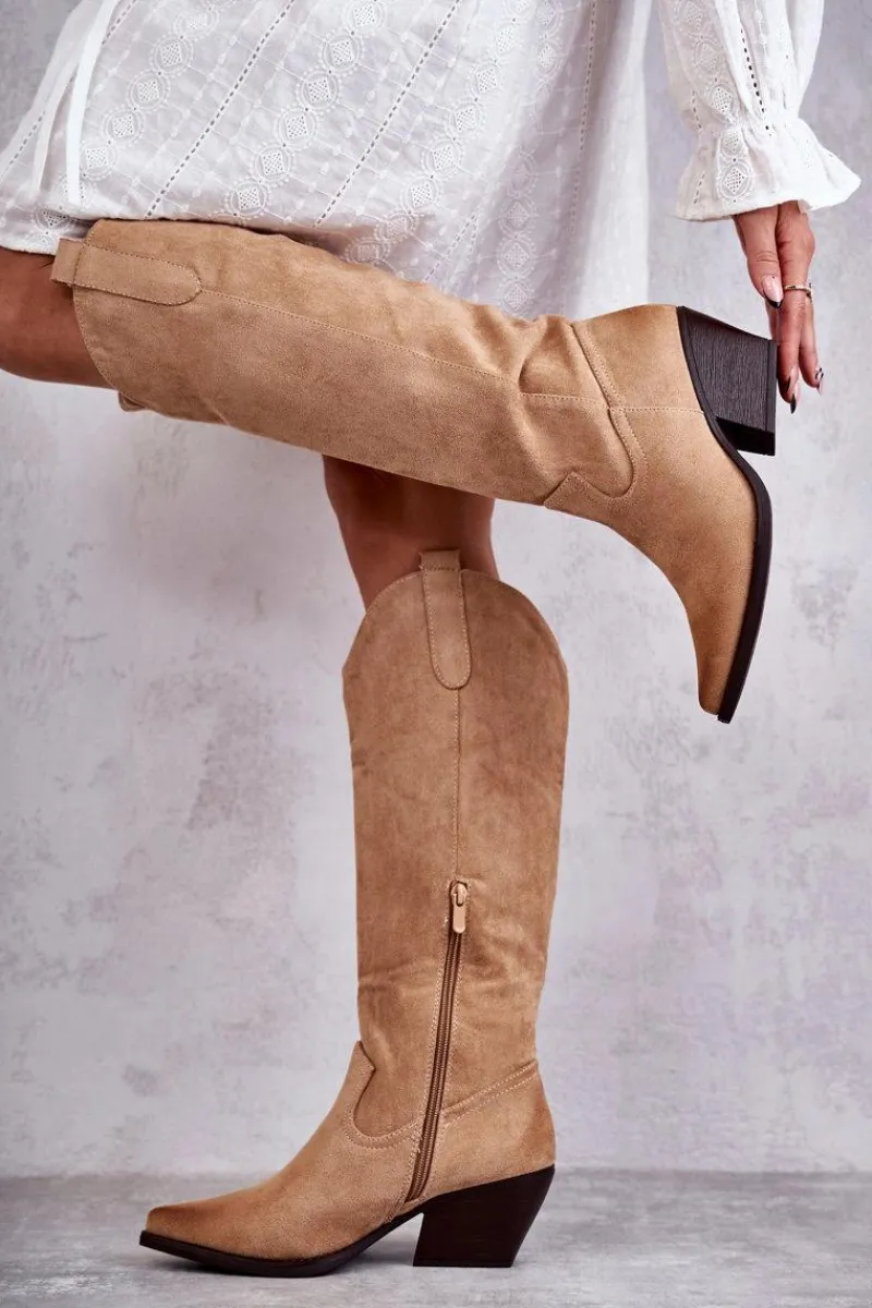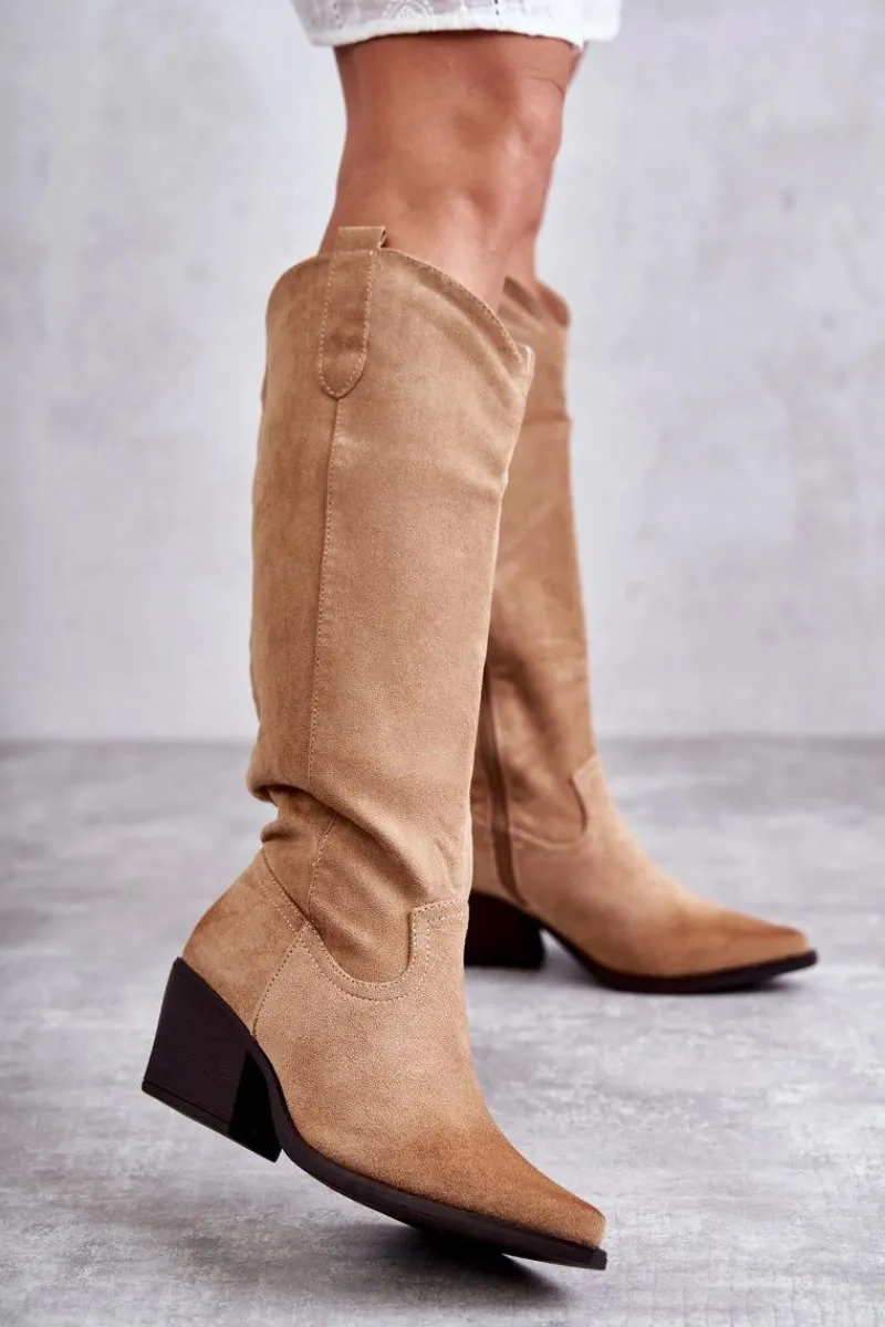 Kozaki – kowbojki zostały wykonane z przyjemnego w dotyku eko zamszu. Posiadają delikatne przeszycia na przodzie. Kozaki o fasonie kowbojek posiadają nosek w szpic oraz masywny obcas w postaci słupka. Model wsuwany z dodatkowym suwakiem z boku cholewki. Wkładka wykonana z eko skóry. Kozaki posiadają usztywniany zapiętek. Ten wyjątkowy model powinien być właśnie Twój! Przy wyborze rozmiaru prosimy sugerować się tabelą rozmiarów.