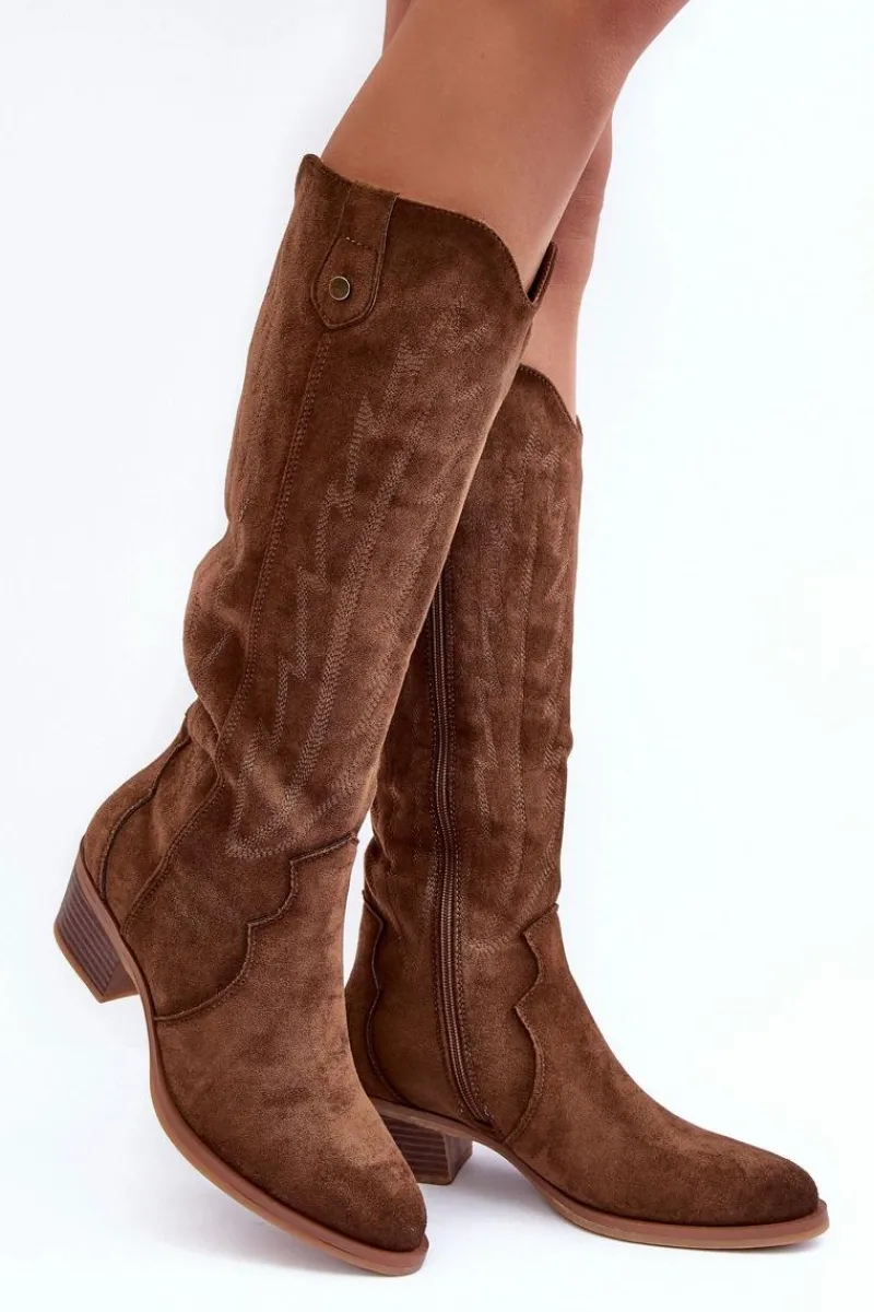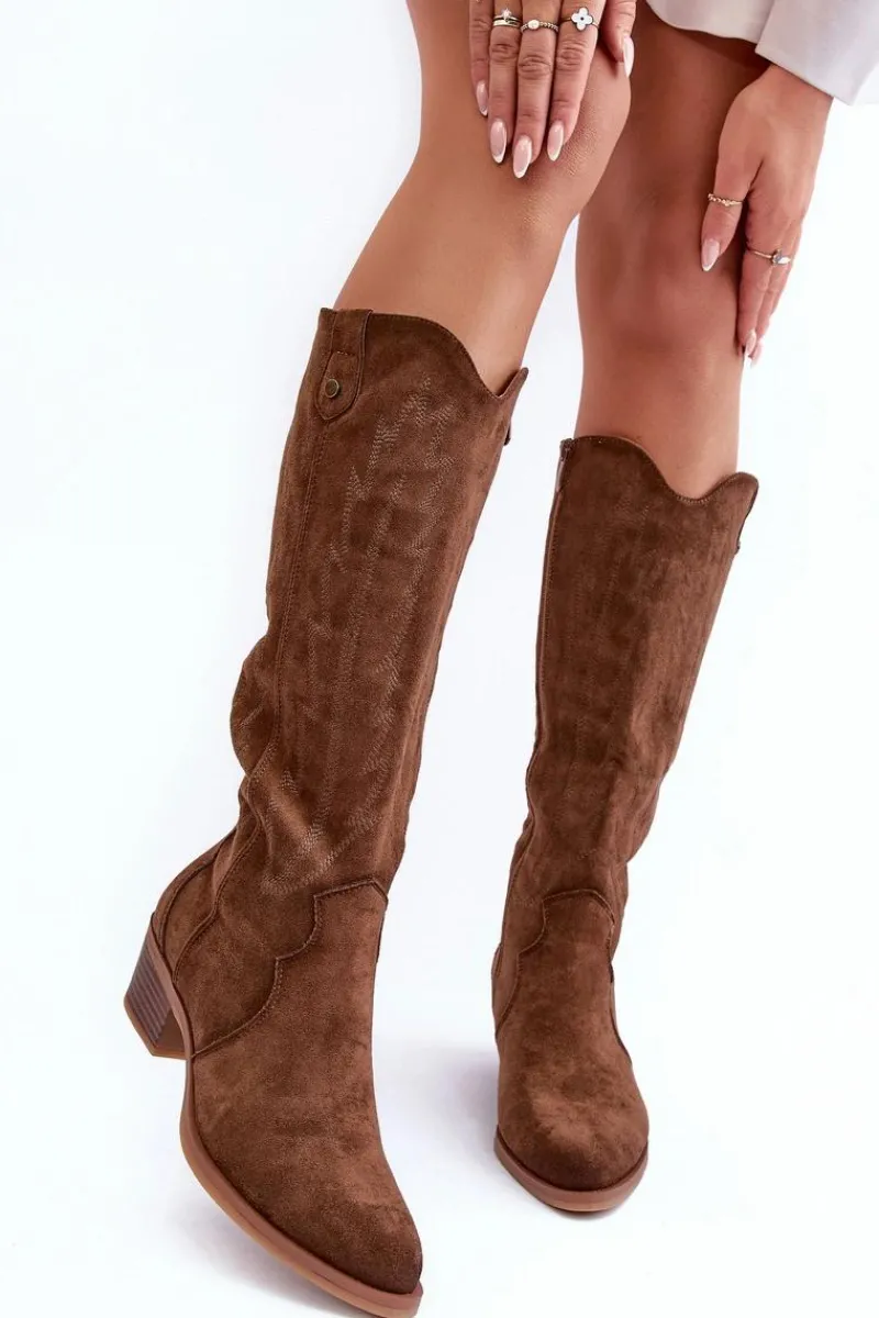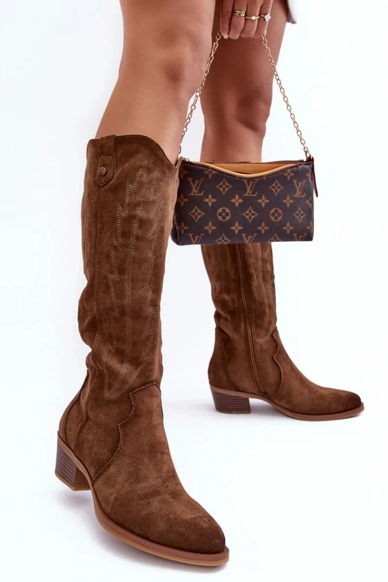 Ten model skradnie serce niejednej miłośniczce kozaków w stylu kowbojek! Świetnie sprawdzą się podczas jesiennych stylizacji! Model wykonany z miłego eko zamszu z delikatnymi przeszyciami na cholewce. Kozaki zapinane są na suwak. Osadzone na niskim, stabilnym obcasie. Ocieplone wewnątrz kocem obuwniczym. Nosek w szpic optycznie wysmukli nogi. Kozaki posiadają usztywniany zapiętek. Przy wyborze rozmiaru prosimy sugerować się tabelą rozmiarów.