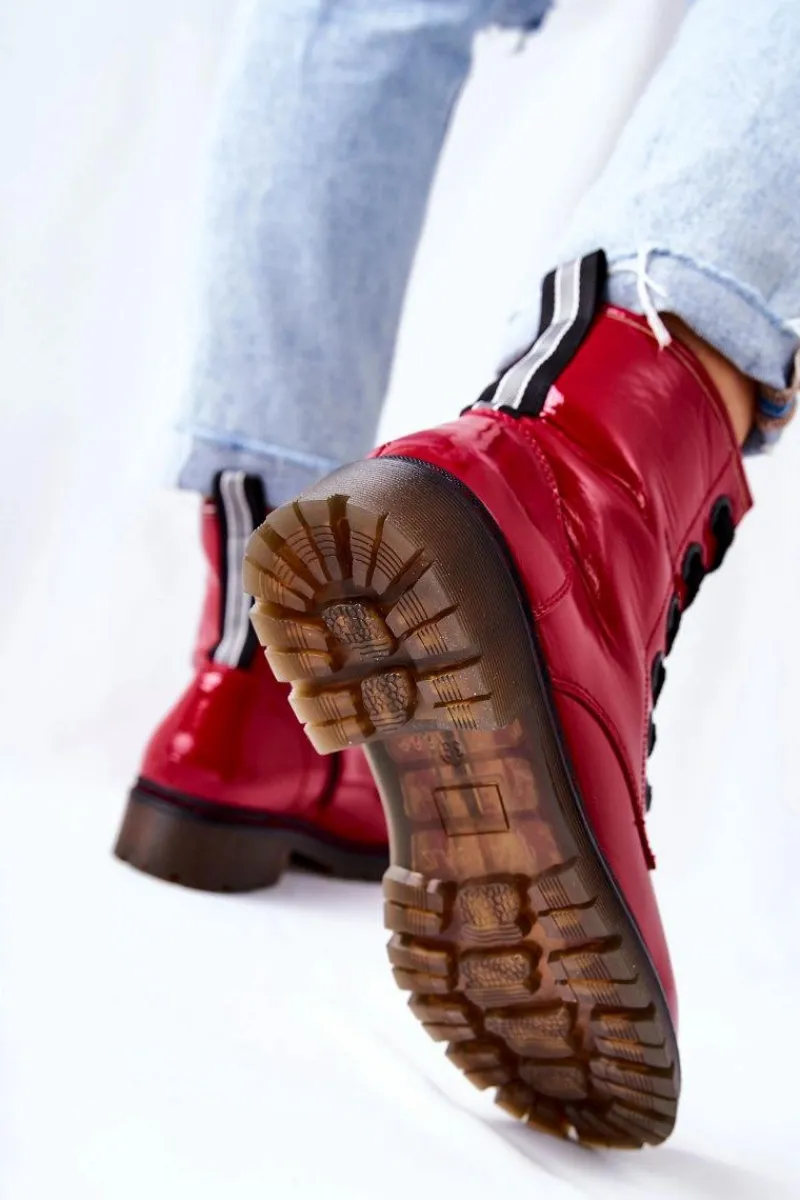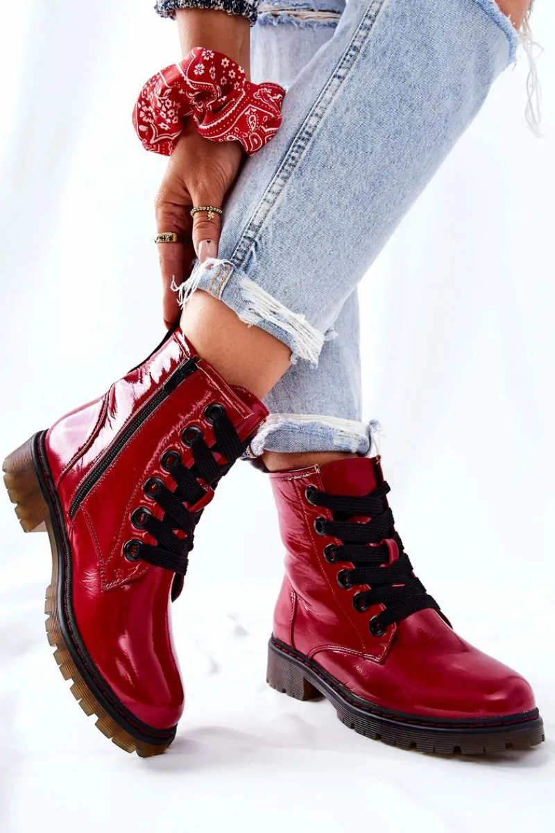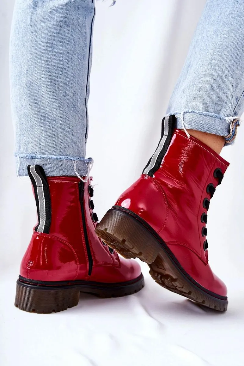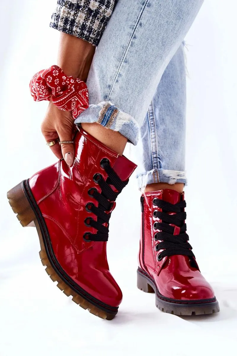 Modne botki wykonane z lakierowanej skóry ekologicznej. Botki posiadają suwak na boku cholewki oraz wiązanie, które ułatwiają zakładanie. Wnętrze zostało ocieplone delikatnym kocem obuwniczym. Ozdobne szycia przy podeszwie. Nie czekaj aż znikną! Przy wyborze rozmiaru prosimy sugerować się tabelą rozmiarów.
