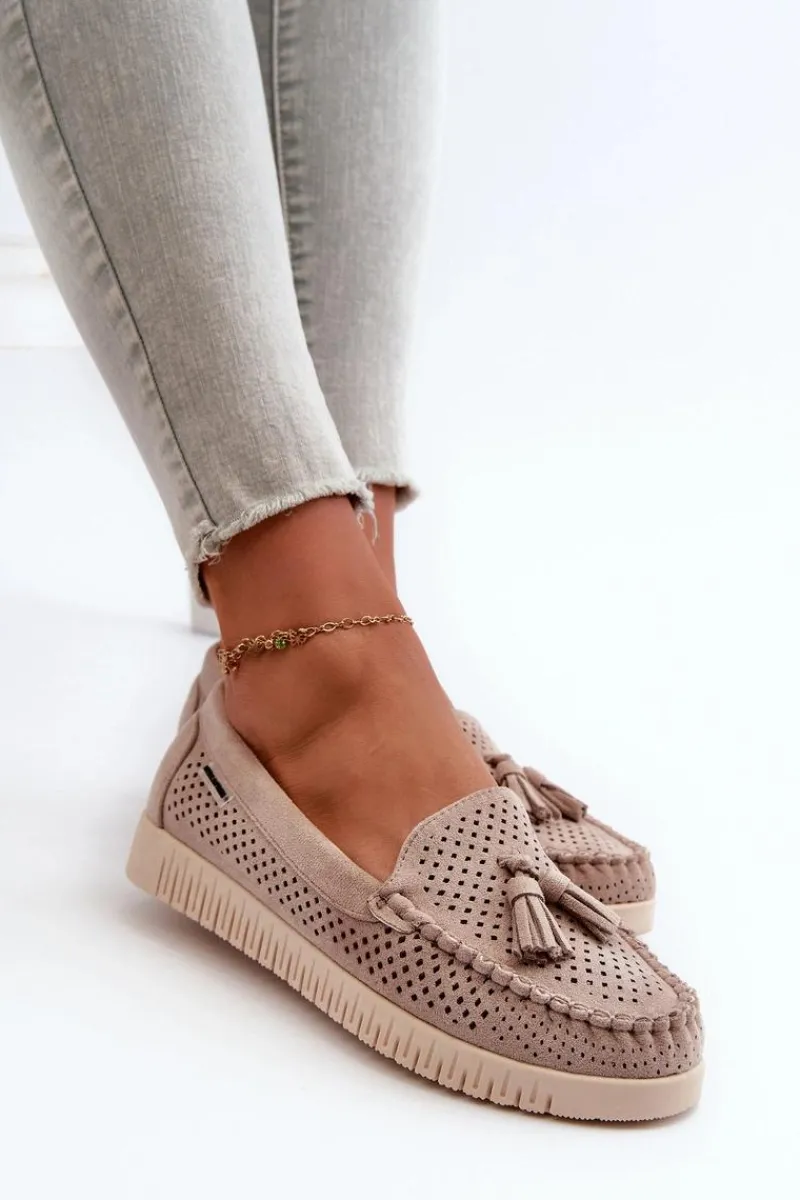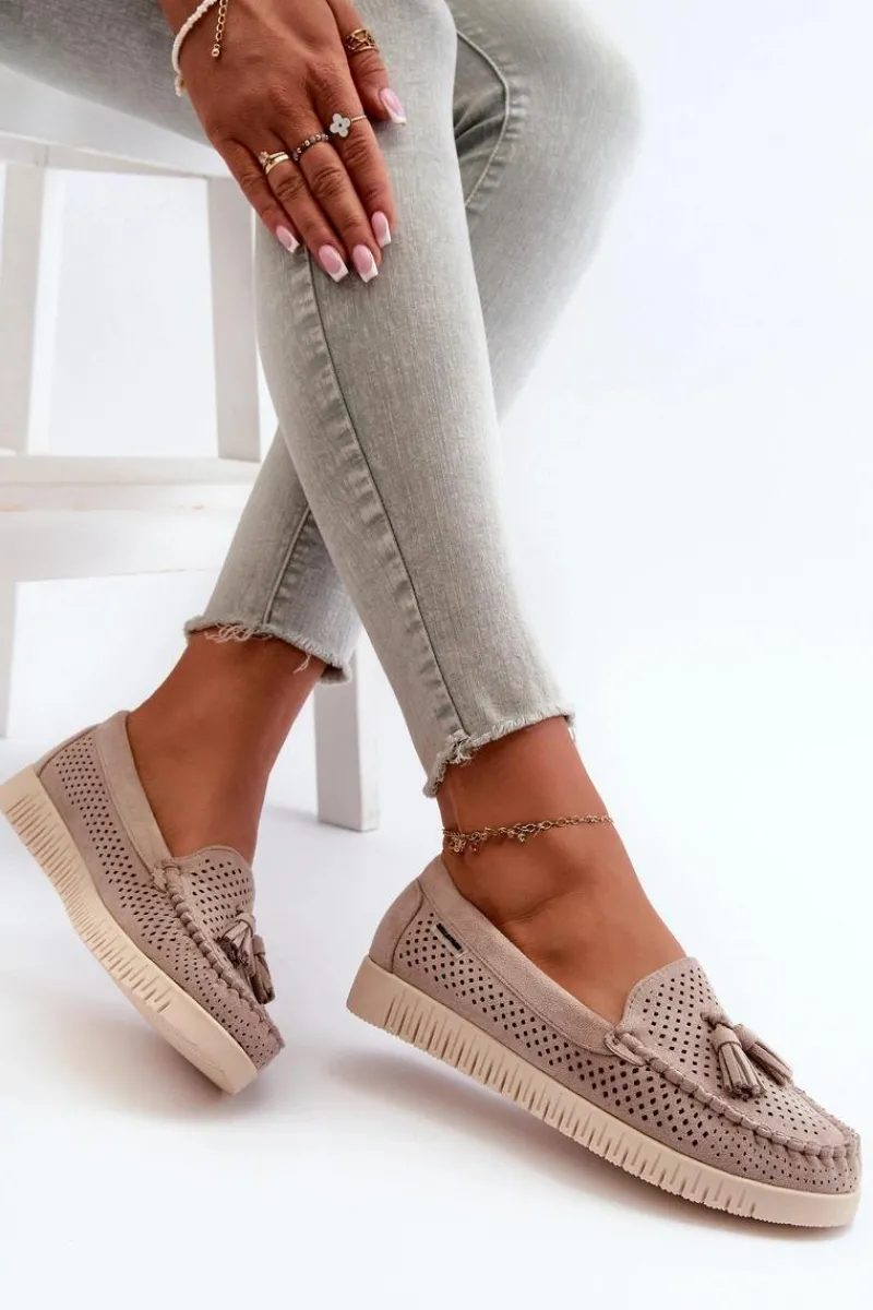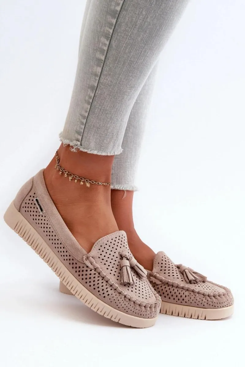 Mokasyny damskie wykonane z eko zamszu. Osadzone na platformie. Noski zaokrąglone. Przód ozdobiony małymi frędzlami. Model ten posiada miękką wkładkę ze skóry naturalnej, która zapewni wygodę podczas noszenia. Klasyczny fason, który dopasujesz do casualowych oraz eleganckich stylizacji. Przy wyborze rozmiaru prosimy sugerować się tabelą rozmiarów.