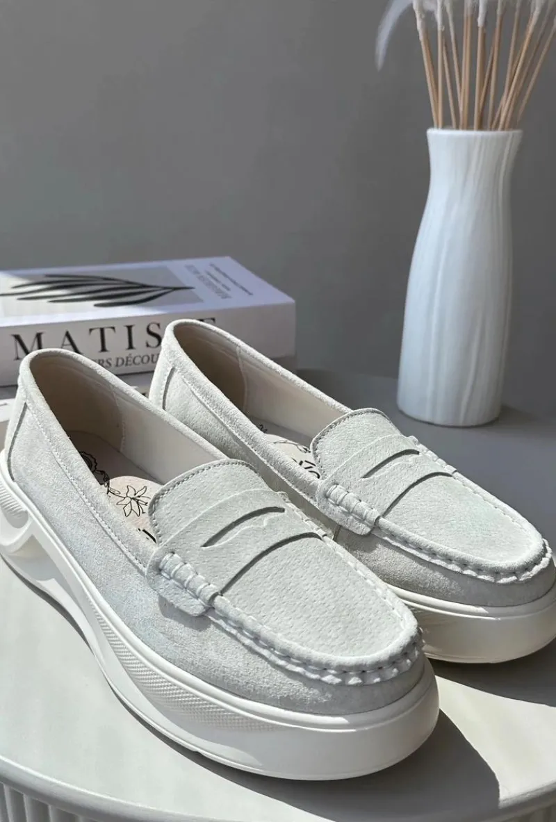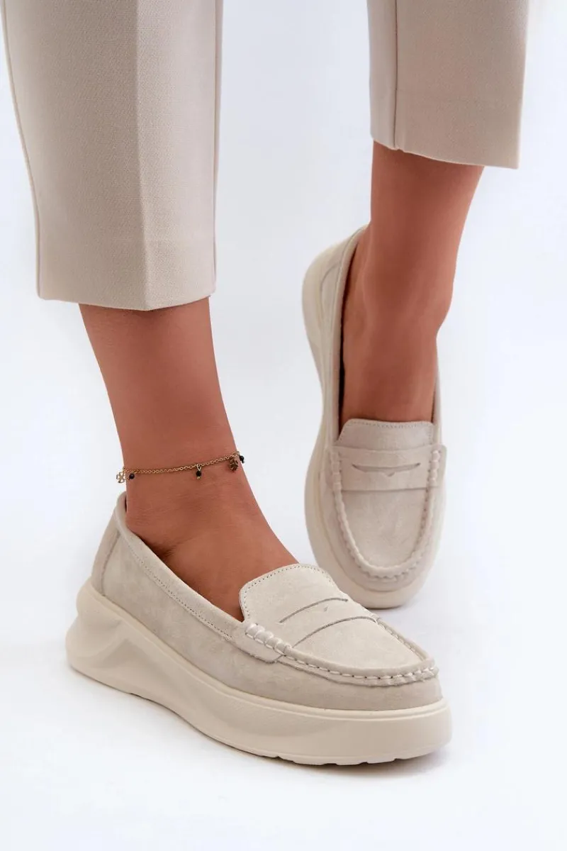 Mokasyny damskie wykonane z naturalnego zamszu. Osadzone na platformie i lekkim koturnie. Noski zaokrąglone. Idealne do wielu stylizacji, te mokasyny to połączenie elegancji i komfortu. Koniecznie powinnaś je mieć w swojej garderobie! Przy wyborze rozmiaru prosimy sugerować się tabelą rozmiarów.