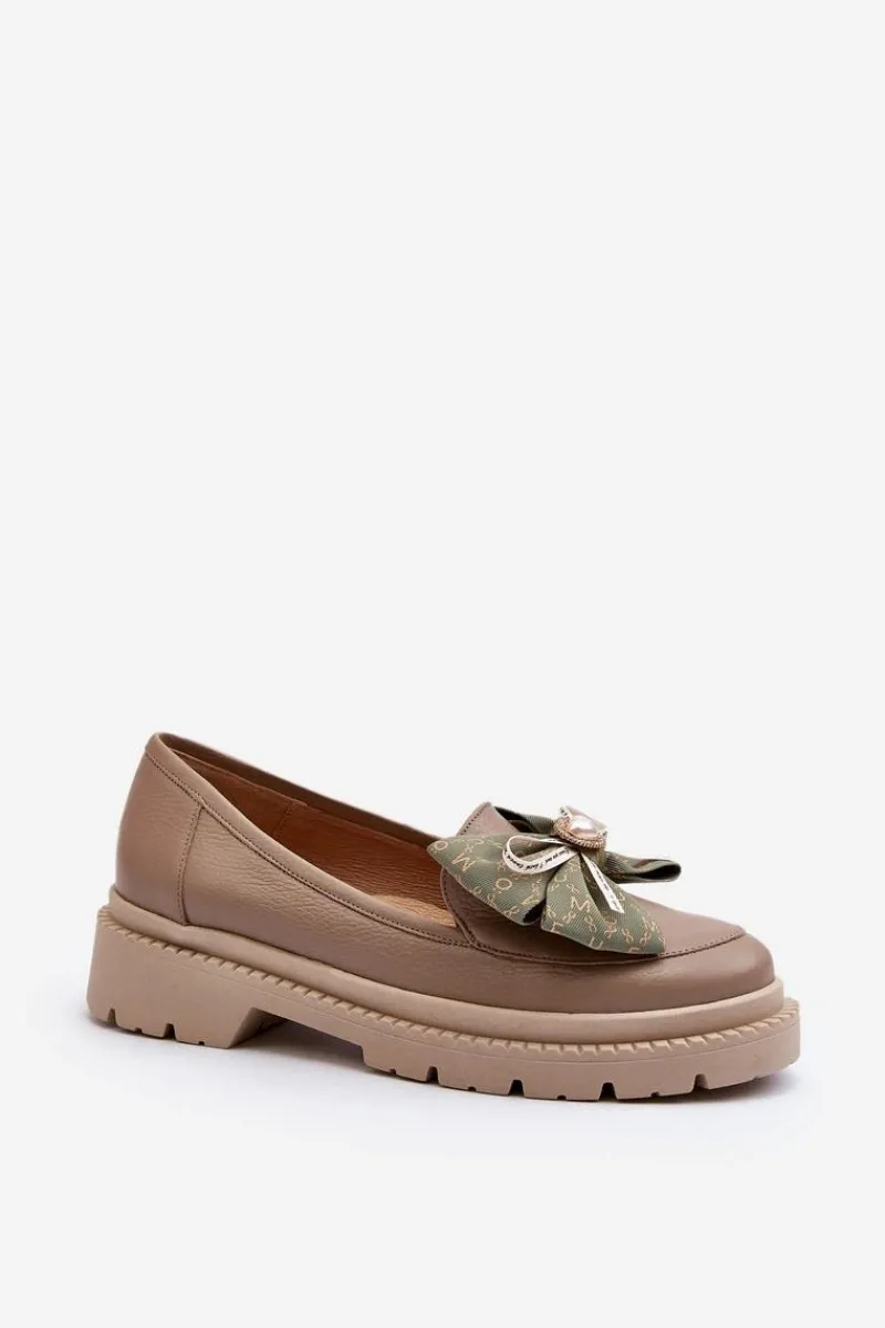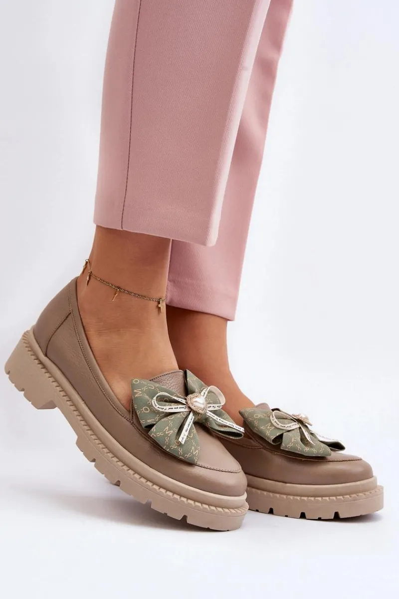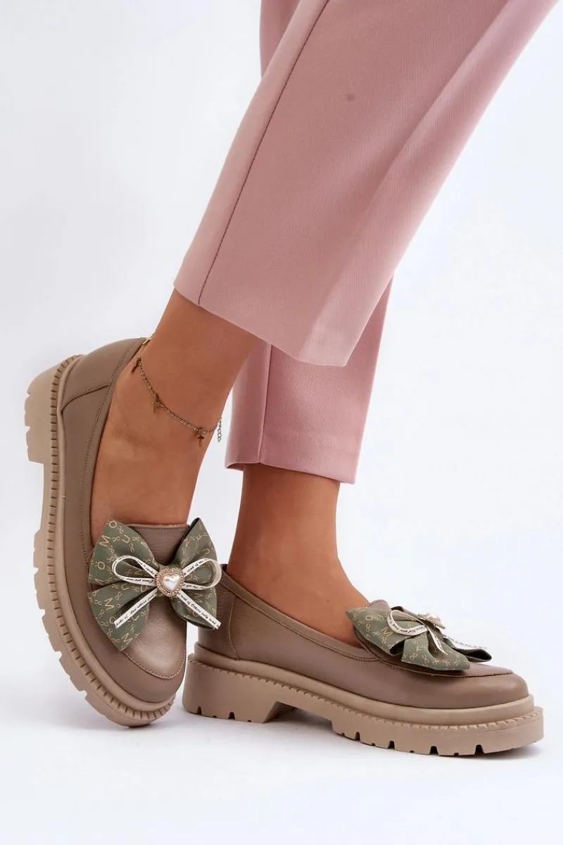 Mokasyny damskie wykonane ze skóry naturalnej. Ozdobione dużą kokardą z przodu. Osadzone na płaskim obcasie. Noski zaokrąglone. Miękka, skórzana wkładka zapewni wygodę podczas użytkowania. Ten niezwykle modny fason idealnie uzupełni wiele wiosennych stylizacji! Przy wyborze rozmiaru prosimy sugerować się tabelą rozmiarów.