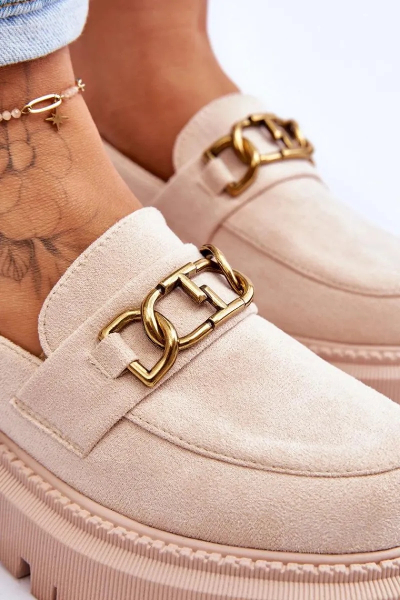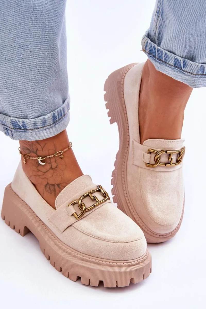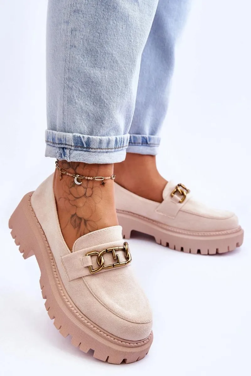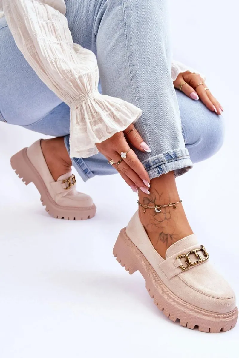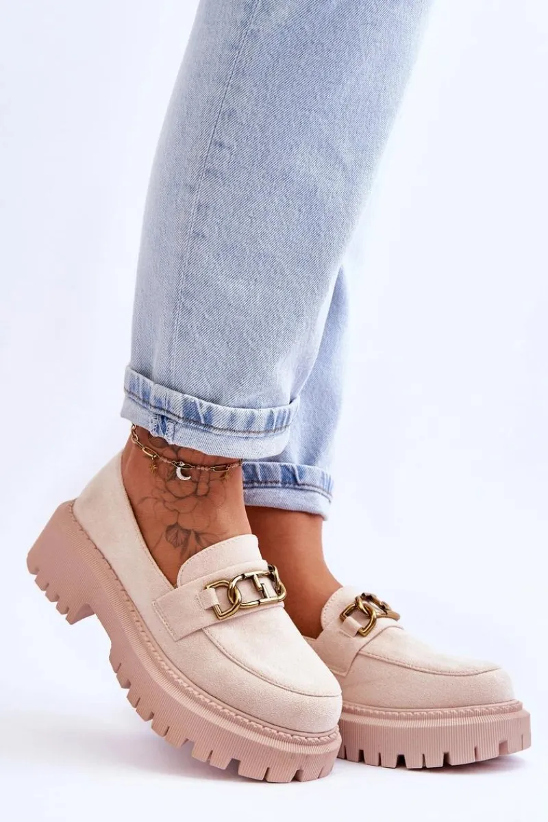 Damskie, klasyczne mokasyny zostały wykonane z eko zamszu. Na przodzie posiadają ozdobę. Model ten został osadzony na masywnym, płaskim obcasie i platformie. Mokasyny posiadają wkładkę z miękkiej eko skóry. Świetny model na sezon wiosenno-jesienny! Koniecznie powinnaś je mieć!Przy wyborze rozmiaru prosimy sugerować się tabelą rozmiarów.