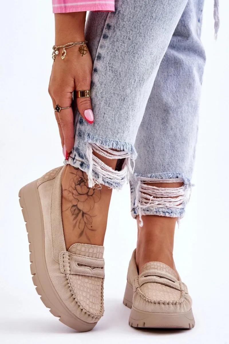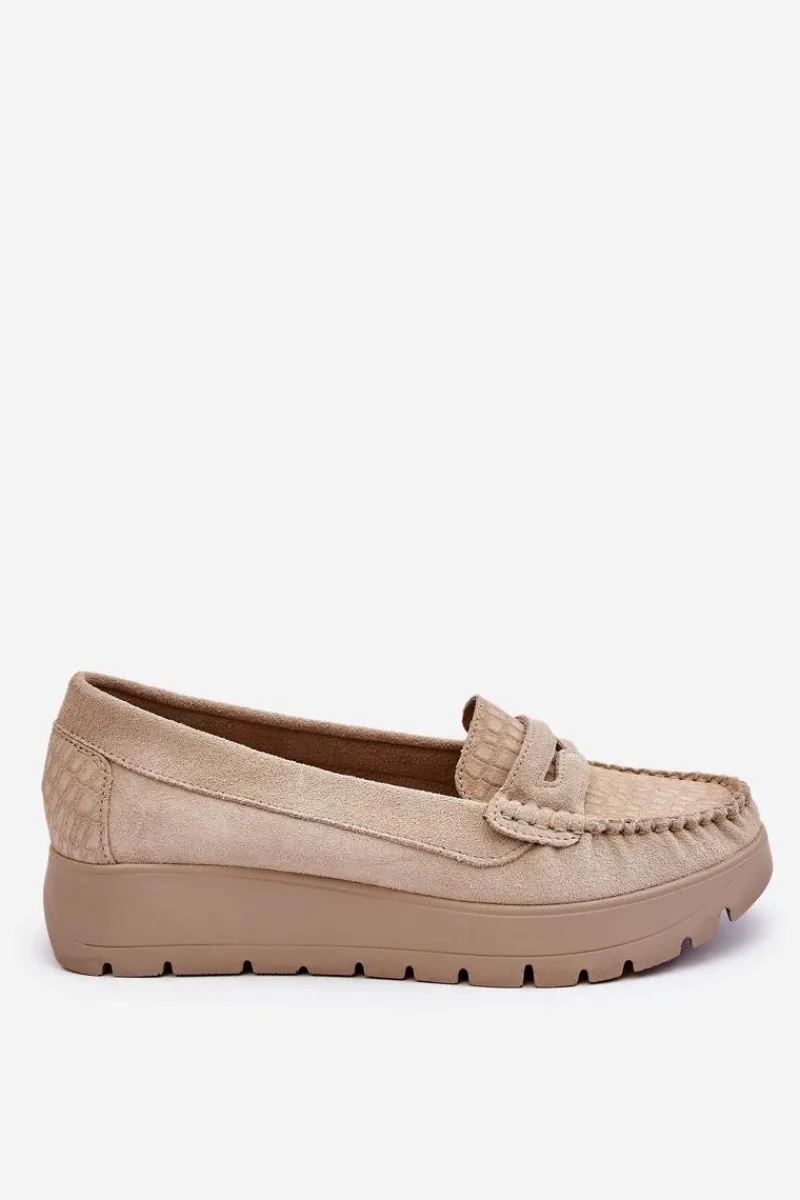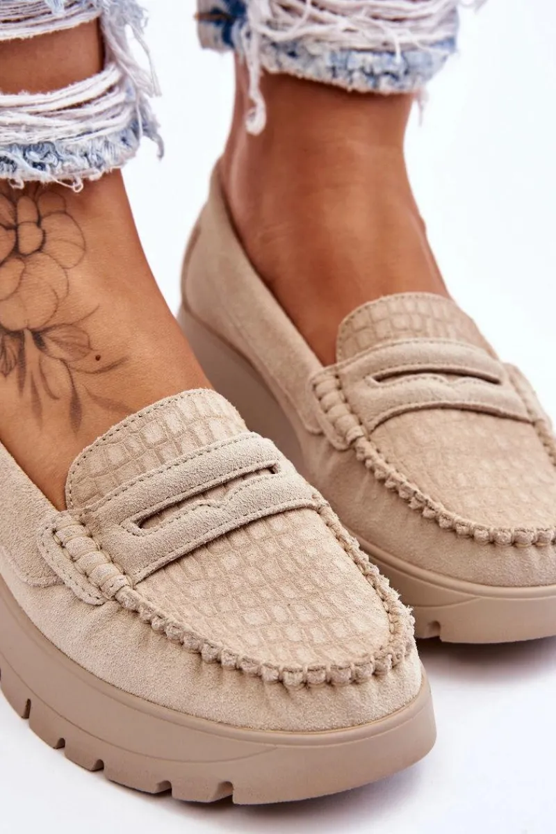 Mokasyny damskie wykonane z naturalnej skóry z ozdobnym paseczkiem z przodu. Zapiętek został usztywniony, co pozwoli na odpowiednią stabilizację stopy. Buty osadzono na platformie. Ten model posiada miękką wkładkę z perforacją. Mokasyny to idealne buty do wielu stylizacji! Koniecznie powinnaś je mieć! Przy wyborze rozmiaru prosimy sugerować się tabelą rozmiarów.