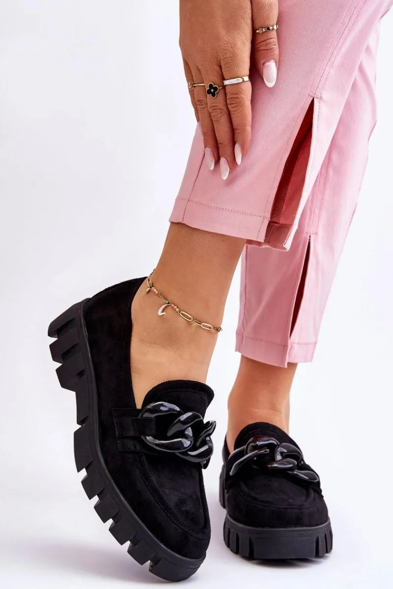 Mokasyny damskie na platformie i płaskim obcasie ze żłobieniami powinny być Twoje! Podeszwa została wykonana z gumowego tworzywa, dzięki któremu jest dodatkowo antypoślizgowa. Miękka wkładka z naturalnej skóry oraz wzmacniany zapiętek zapewni komfortowe użytkowanie. Mokasyny posiadają z przodu ozdobny łańcuch z tworzywa sztucznego. Przy wyborze rozmiaru prosimy sugerować się tabelą rozmiarów.