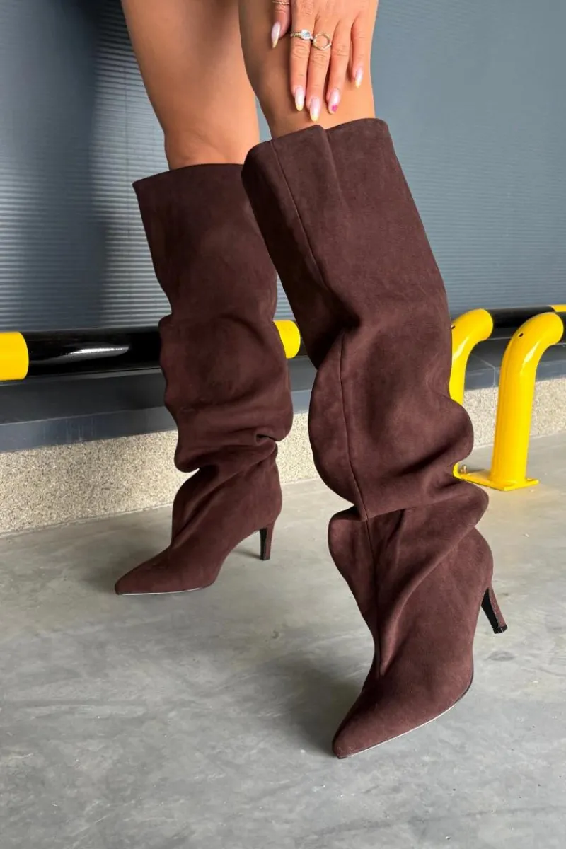 Kozaki Mavilla to propozycja dla kobiet, które cenią sobie elegancję i klasykę w nowoczesnym wydaniu. Wykonane z miękkiego eko zamszu w ciepłym czekoladowym odcieniu, prezentują się niezwykle stylowo i kobieco. Wysoka cholewka sięgająca za kolano pięknie wydłuża nogi, a smukła linia buta subtelnie podkreśla sylwetkę. To model, który doskonale łączy modny wygląd z wygodą użytkowania.