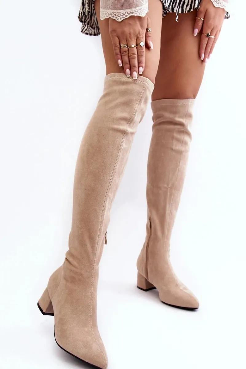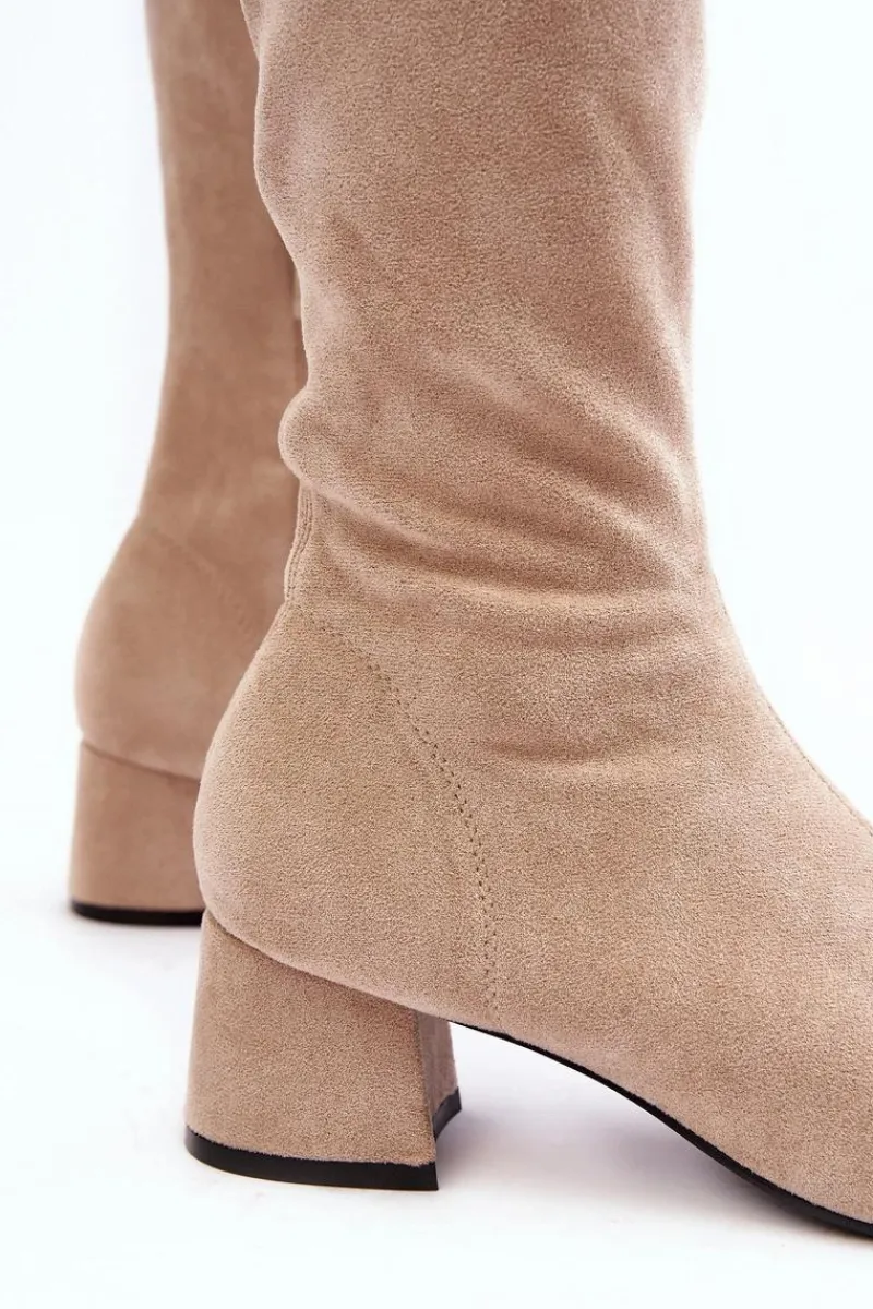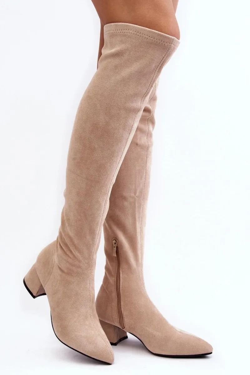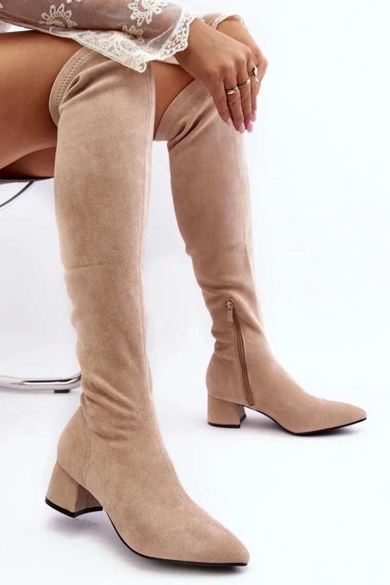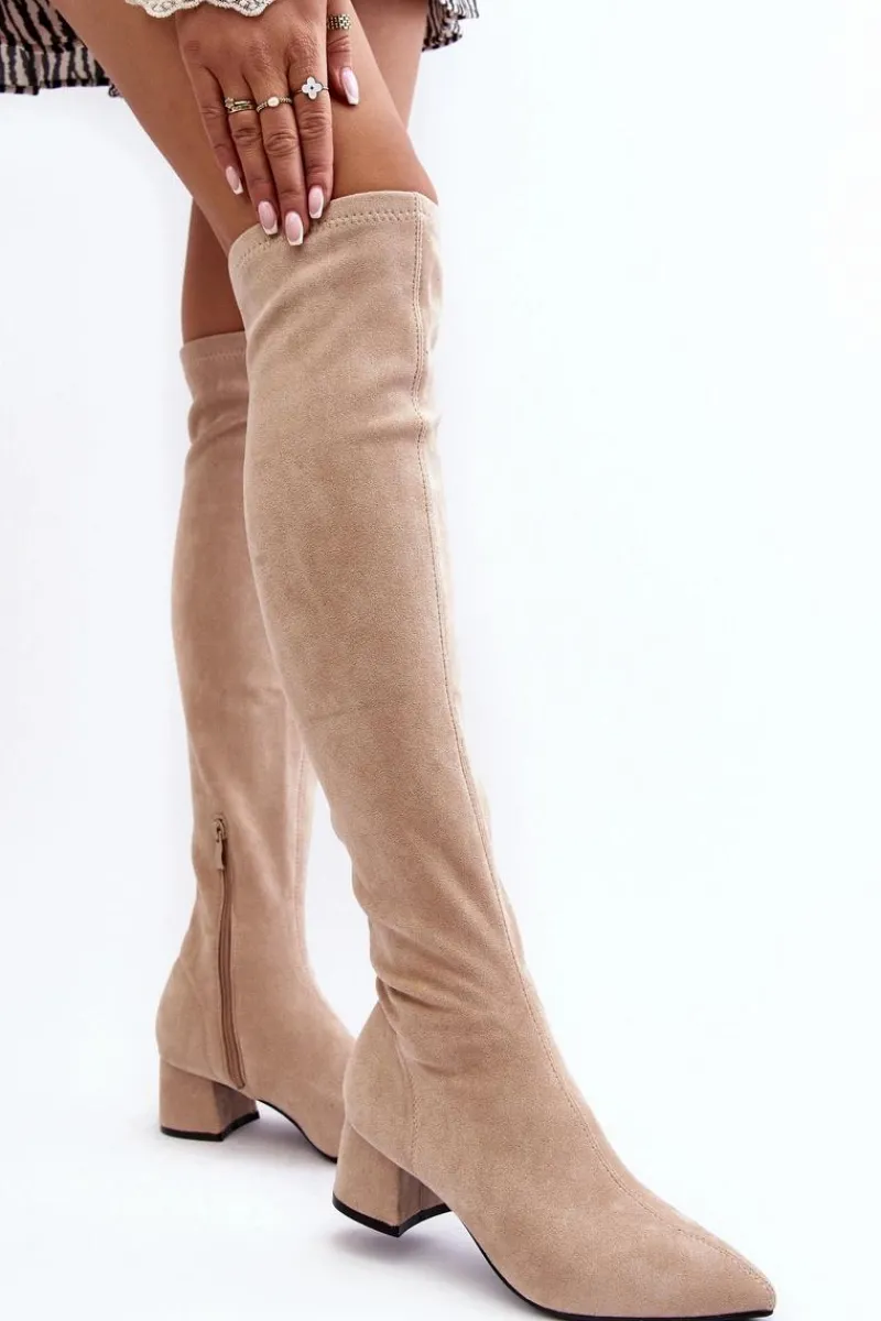 Modne kozaki damskie z cholewką za kolano. Wykonane z eko zamszu. Osadzone na niskim obcasie klocku. Noski w szpic optycznie wysmuklą nogi. Model wsuwany z dodatkowym zapięciem na suwak. Cholewka ozdobiona przeszyciami. Idealny model do sukienek mini czy spódniczek. Koniecznie powinnaś je mieć! Przy wyborze rozmiaru prosimy sugerować się tabelą rozmiarów.