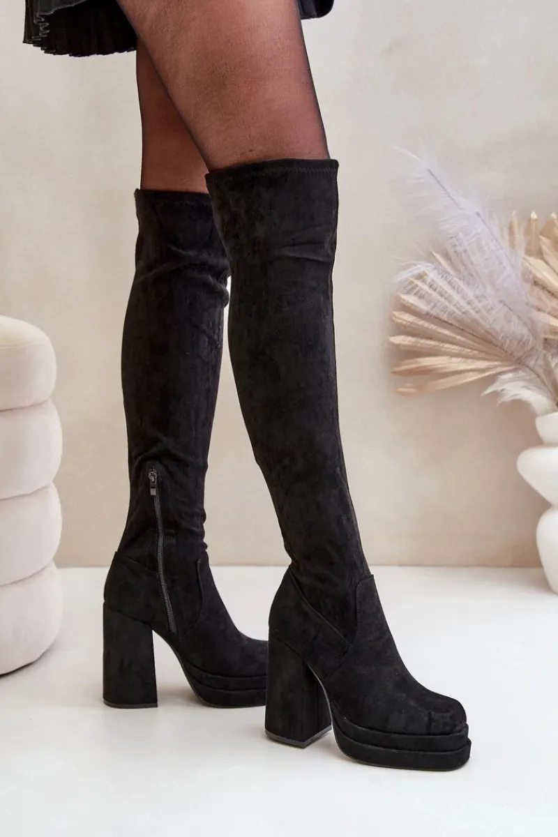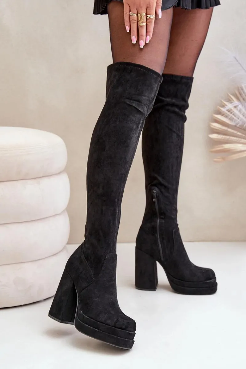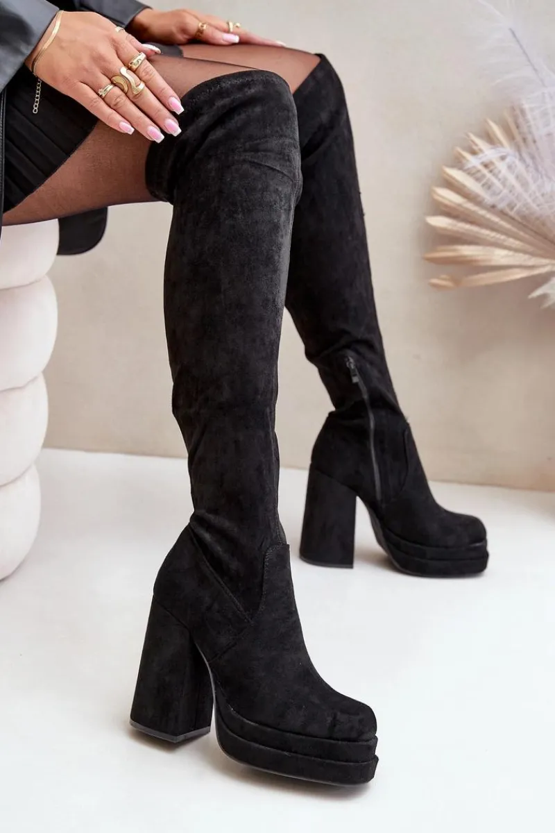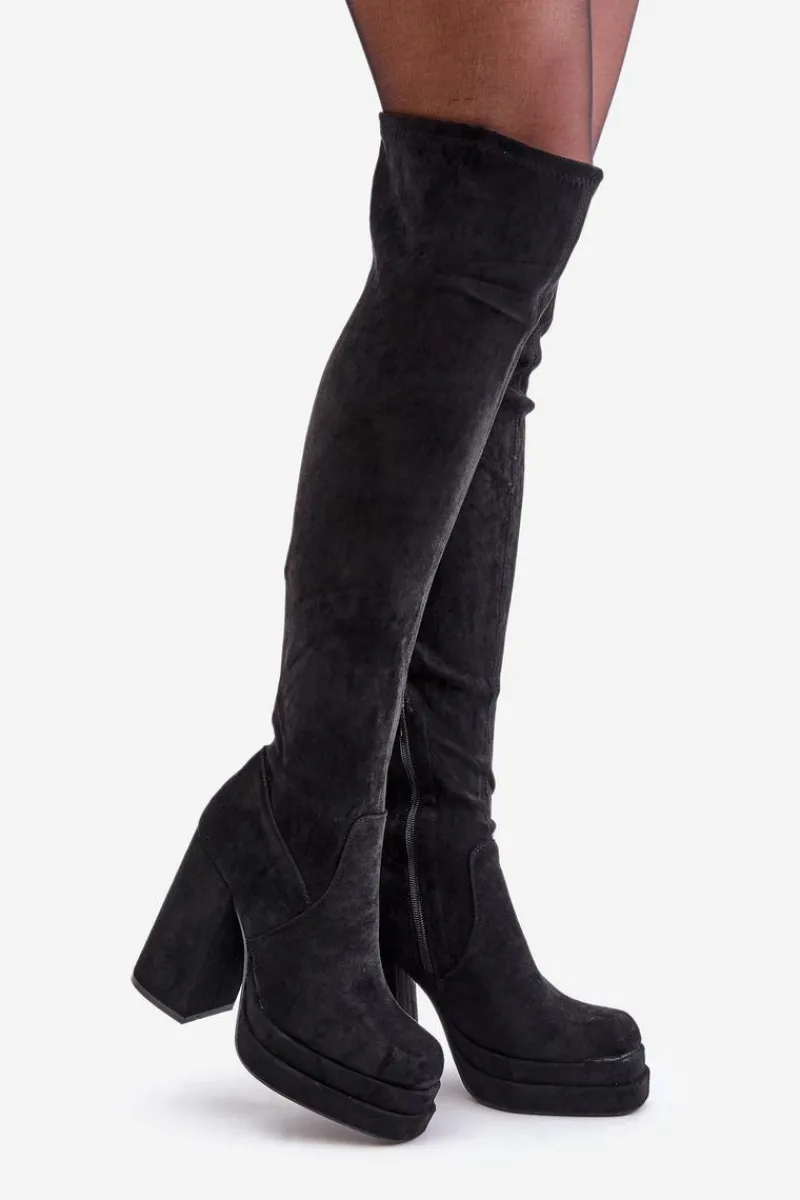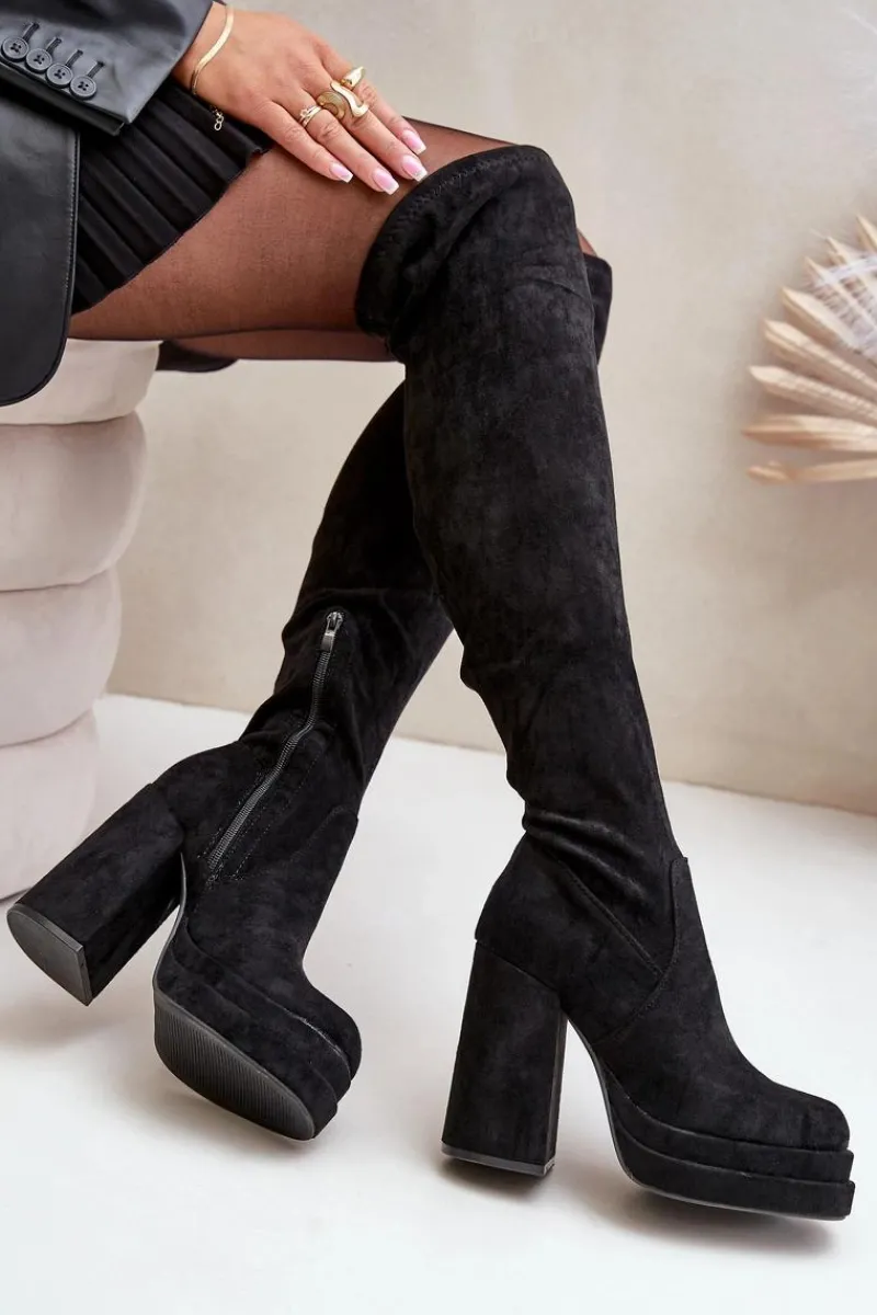 Kozaki z eko zamszu to świetna propozycja dla miłośniczek modnych, a zarazem wygodnych butów na chłodniejsze dni. Model wyróżnia się wysoką cholewką sięgającą za kolano, która dodaje elegancji i wydłuża sylwetkę. Kozaki są wsuwane, ale dla większej wygody posiadają dodatkowy suwak na dole cholewki, ułatwiający zakładanie. Osadzone na masywnym słupku oraz platformie, zapewniają stabilność i podkreślają nogi. Wnętrze ocieplone jest wyłącznie na wysokości stopy. Idealne do stylizacji z sukienkami czy spódnicami. Przy wyborze rozmiaru prosimy sugerować się tabelą rozmiarów.