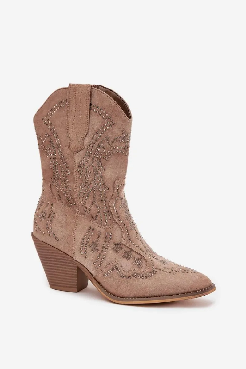Botki kowbojki damskie wykonane z eko zamszu to propozycja, która łączy modny charakter z wygodą codziennego noszenia. Miękka w dotyku cholewka została ozdobiona stylowym zdobieniem, które nadaje wyjątkowego uroku i przyciąga uwagę. Model osadzony jest na charakterystycznym, ściętym obcasie typu słupek, który zapewnia stabilność, a jednocześnie dodaje sylwetce smukłości. Migdałowe noski podkreślają elegancję i kobiecy charakter butów, sprawiając, że świetnie komponują się z różnymi stylizacjami. Praktyczne zapięcie na zamek ułatwia zakładanie i zdejmowanie obuwia, co zwiększa komfort użytkowania. To botki, które doskonale sprawdzą się zarówno w casualowych, codziennych zestawach, jak i w bardziej stylowych outfitach inspirowanych modą boho. Przy wyborze rozmiaru prosimy sugerować się tabelą rozmiarów.