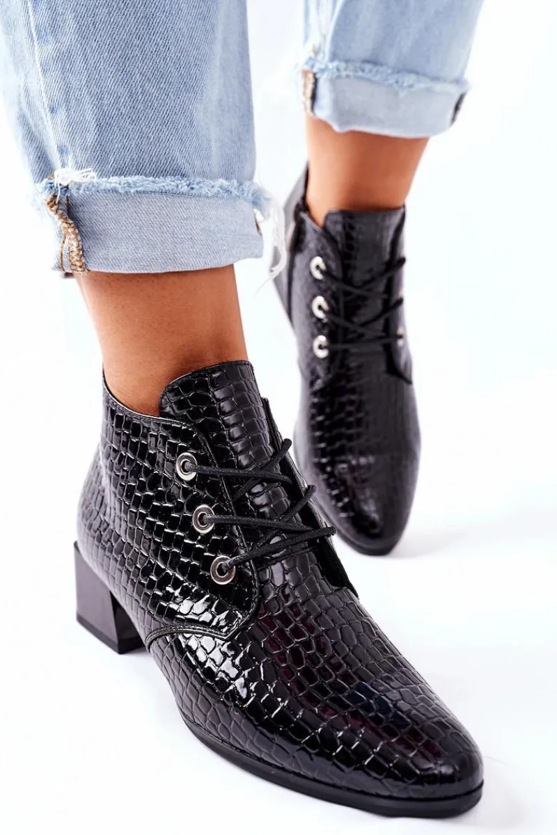 Damskie botki na obcasie. Zwierzęca faktura oraz lakierowanie sprawia, że wyglądało obłędnie. Ocieplenie w postaci koca obuwniczego.Przy wyborze rozmiaru prosimy sugerować się tabelą rozmiarów.