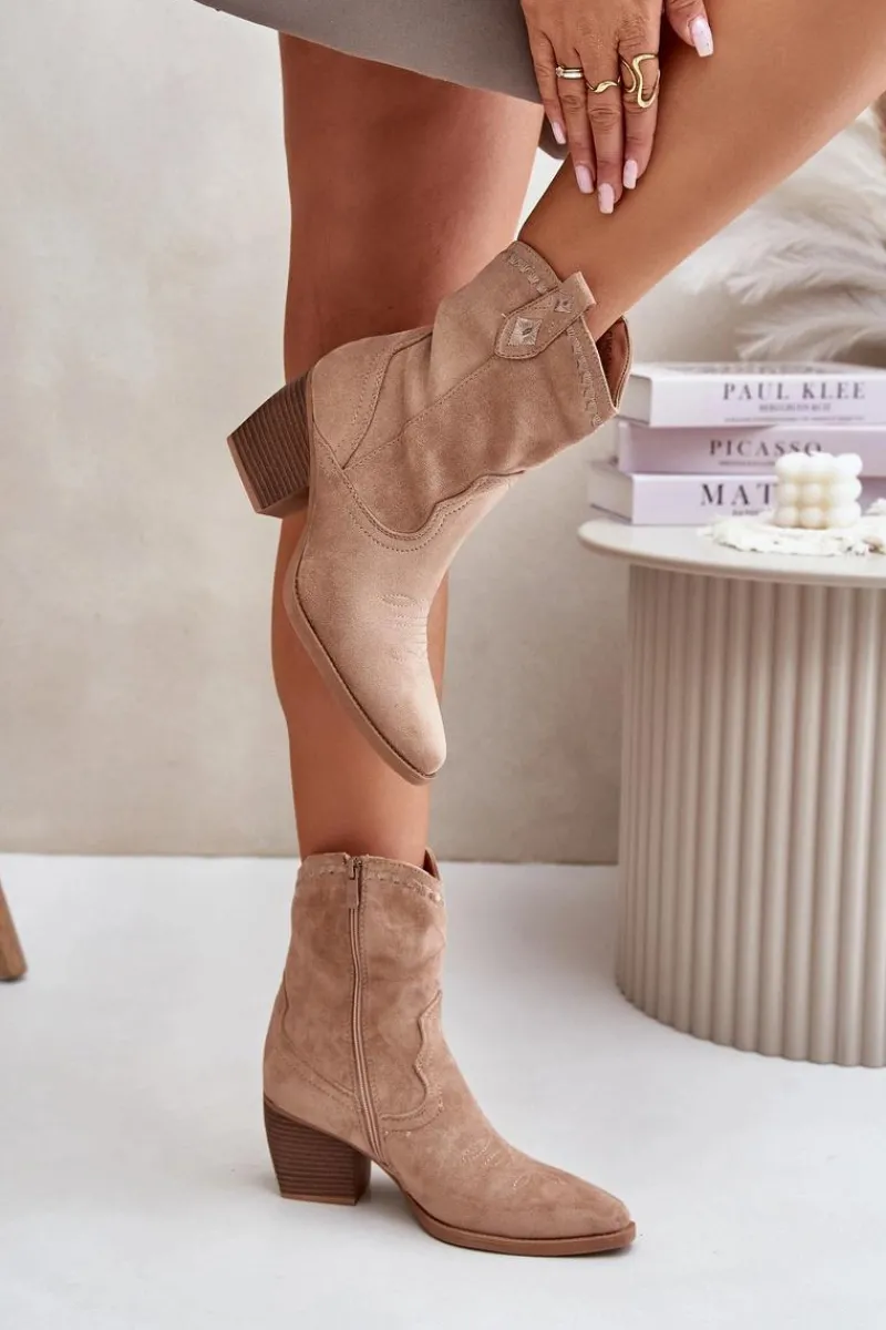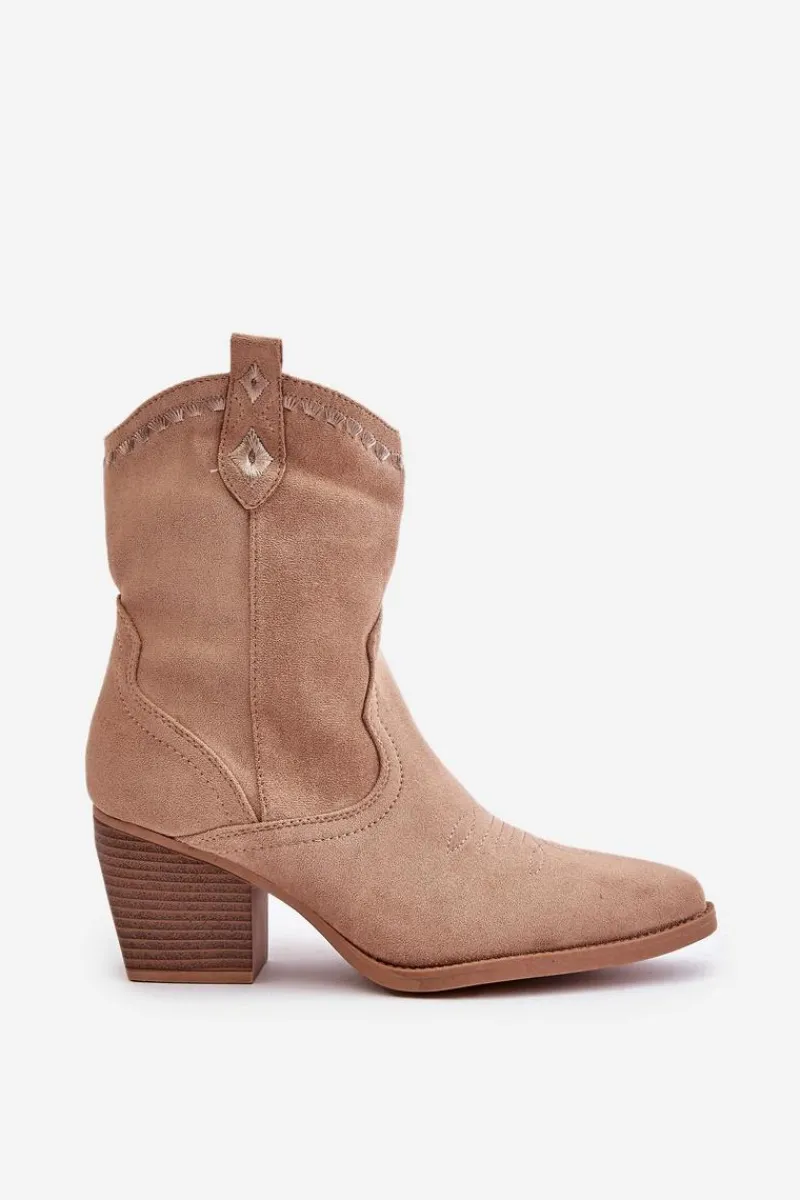 Botki damskie w stylu kowbojek. Wykonane z eko zamszu, to idealny wybór na chłodniejsze dni. Osadzone na stabilnym obcasie typu słupek, zapewniają komfort noszenia. Szpiczaste noski optycznie wysmuklają nogi, dodając sylwetce lekkości. Cholewka ozdobiona przeszyciami. Wnętrze ocieplone kocem obuwniczym gwarantuje ciepło, a suwak ułatwia zakładanie i zdejmowanie butów. Idealne do jesiennych stylizacji. Przy wyborze rozmiaru prosimy sugerować się tabelą rozmiarów.