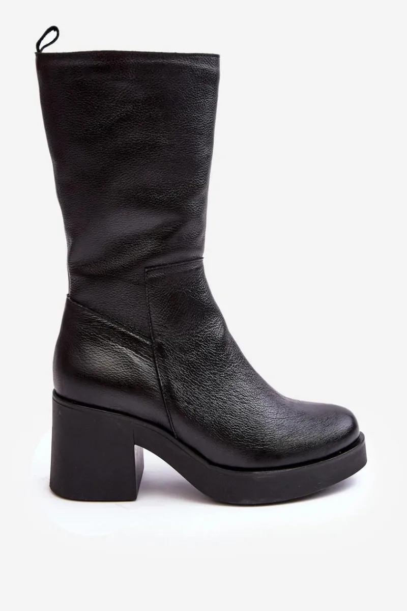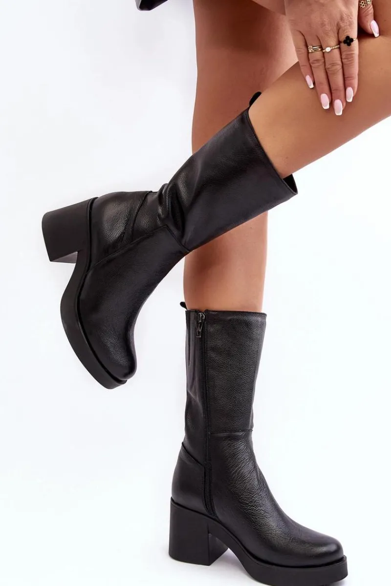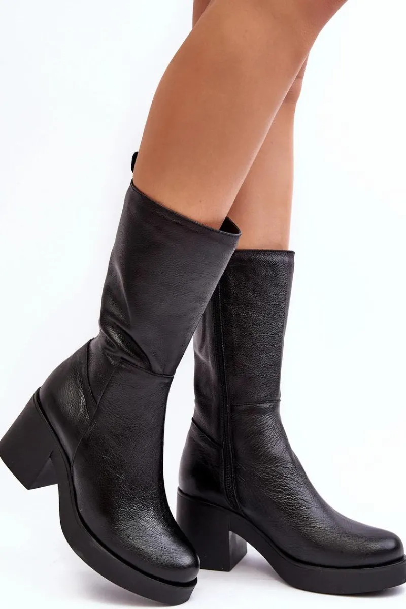 Kozaki damskie z cholewką do połowy łydki. Wykonane z wysokiej jakości naturalnej skóry. Model ten został ocieplony kocem obuwniczym. Zapinane na całej długości suwakiem. Kozaki posiadają obcas w postaci masywnego słupka oraz platformę z antypoślizgową podeszwą. Świetny model na chłodne dni! Przy wyborze rozmiaru prosimy kierować tabelą rozmiarów.