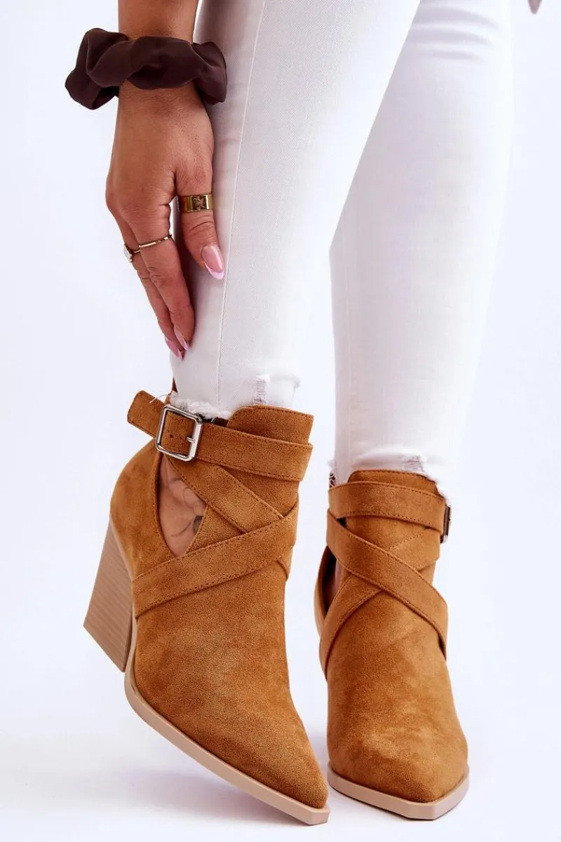Botki o fasonie kowbojek zostały wykonane z miękkiego eko zamszu. Dodatkowo posiadają usztywniany zapiętek. Buty zostały osadzone na obcasie w postaci słupka. Cholewka z wycięciami po bokach jest charakterystyczna dla tego modelu. Te botki będą świetnym uzupełnieniem wielu stylizacji. Przy wyborze rozmiaru prosimy sugerować się tabelą rozmiarów.