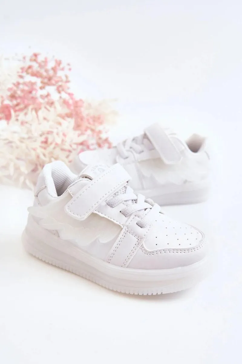 Śliczne buty dziecięce wykonane z eko skóry. Posiadają perforację z przodu oraz ozdobny, gumowy element z boku cholewki w kształcie skrzydeł. Zapiętek delikatnie usztywniany. Buty zapinane na rzep wraz z gumkami imitującymi sznurowadła. Osadzone na platformie wykonanej z gumowego tworzywa, która jest antypoślizgowa. Wkładka wykonana z naturalnej skóry jest miękka i wygodna w użytkowaniu, a dodatkowo profilowana. Świetny model dla Twojej pociechy! Przy wyborze rozmiaru prosimy sugerować się tabelą rozmiarów.