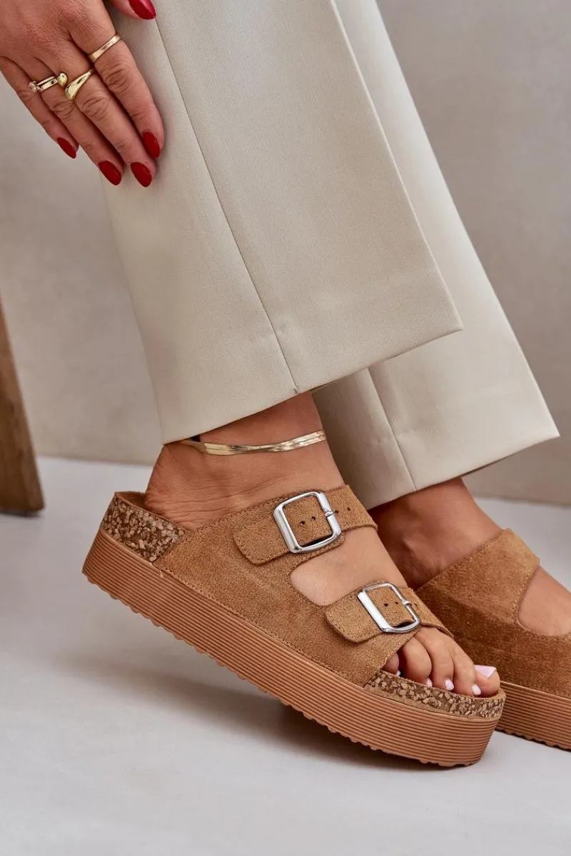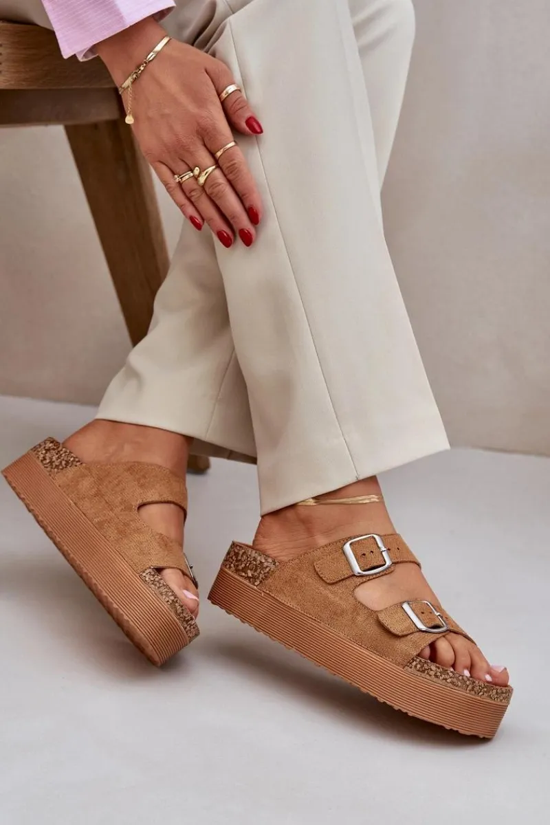 New Boto Klapki Damskie Na Masywnej Platformie Z Klamrami Camel Aramia Brązowy