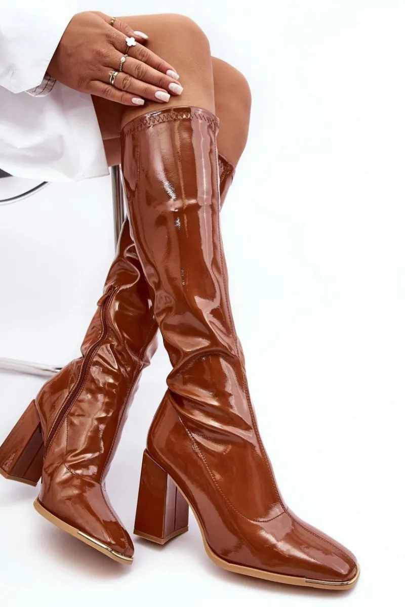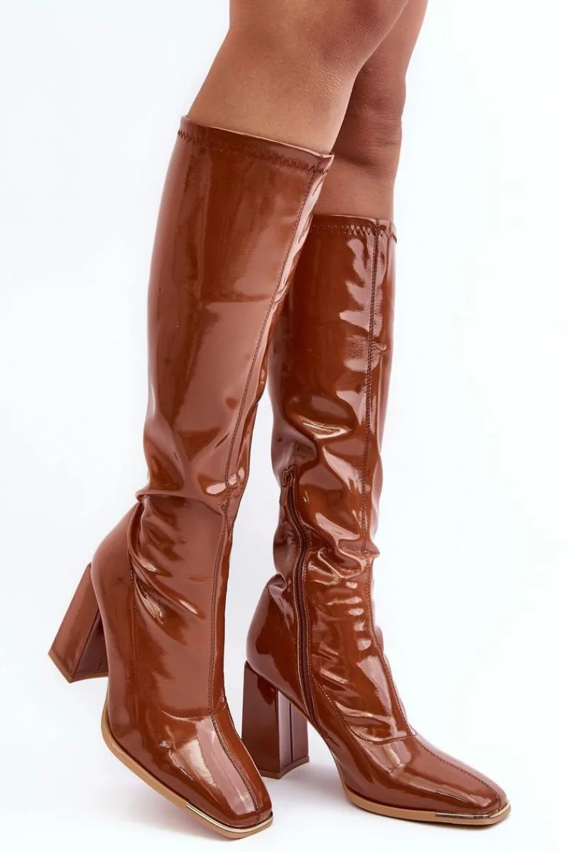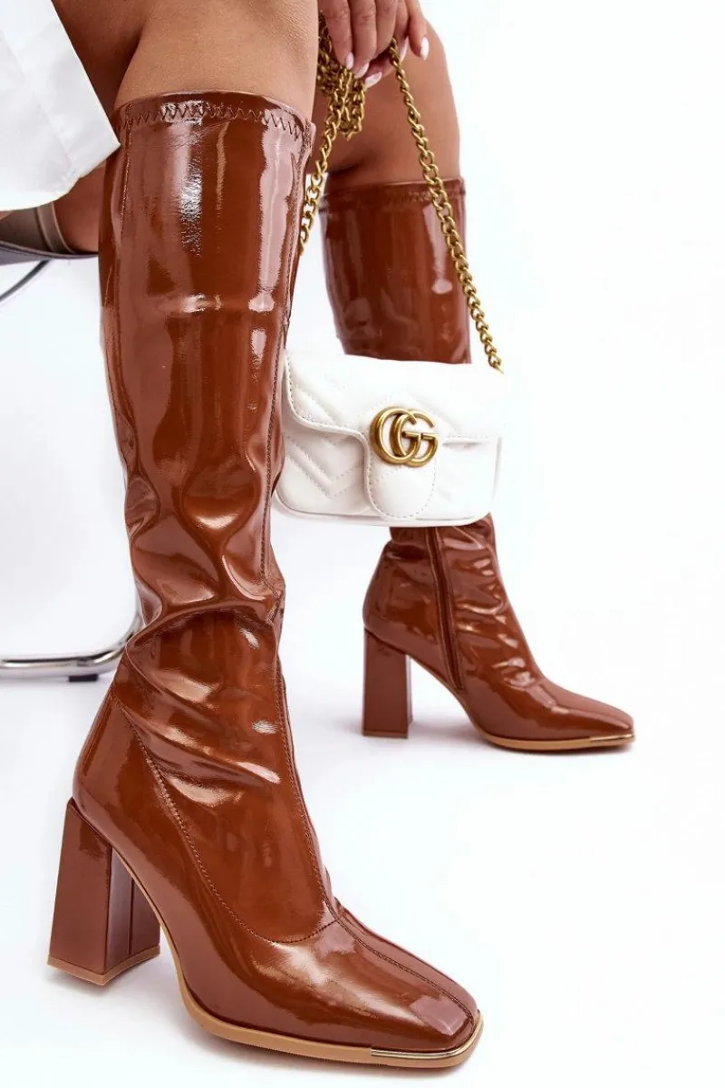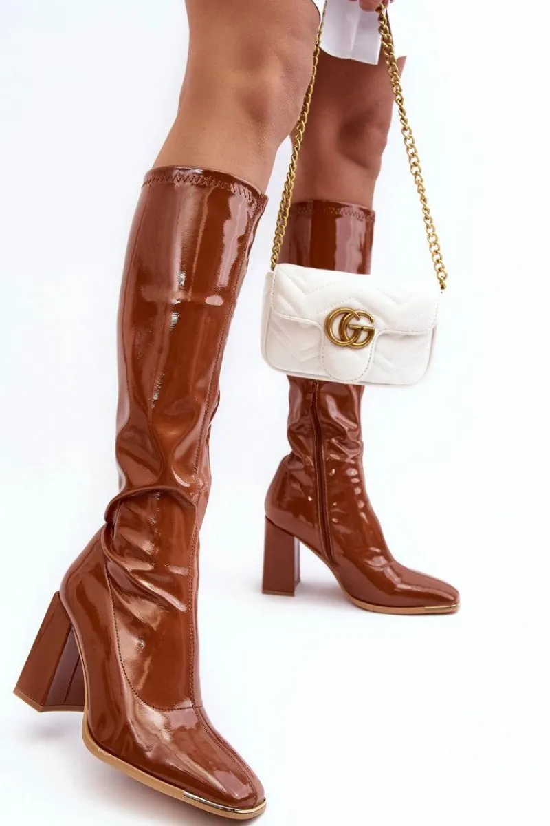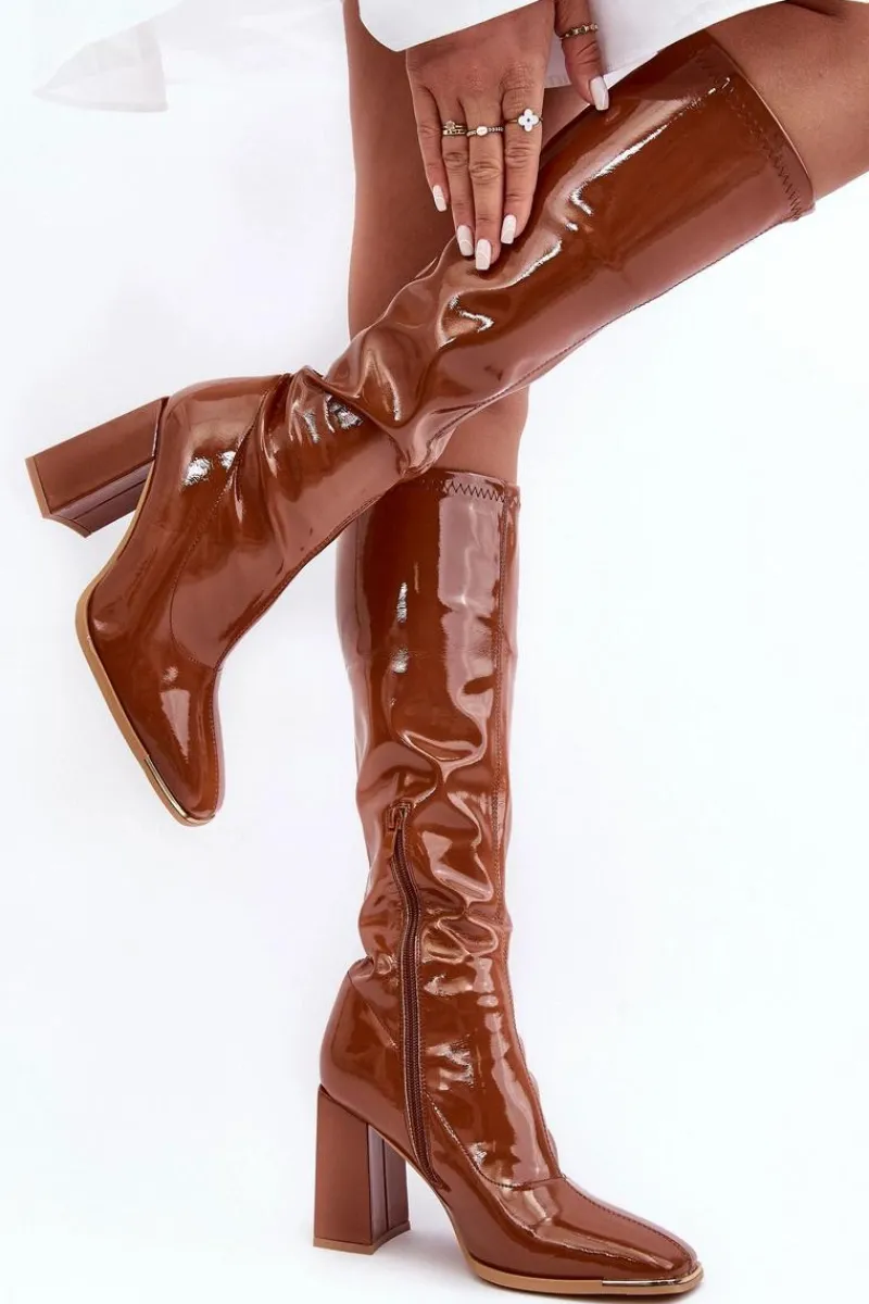 New Boto Lakierowane Kozaki Na Słupku Przed Kolano Brązowe Mlokva