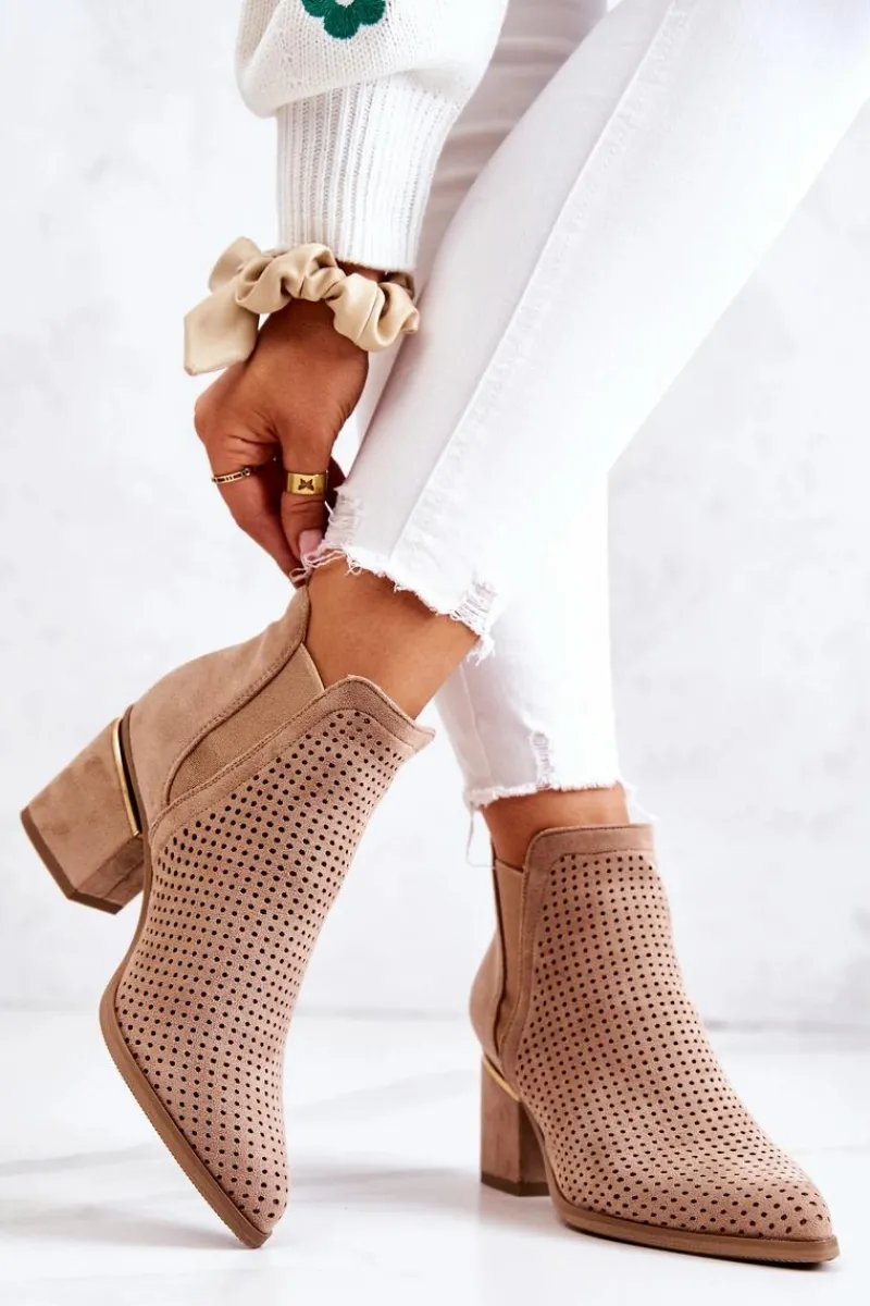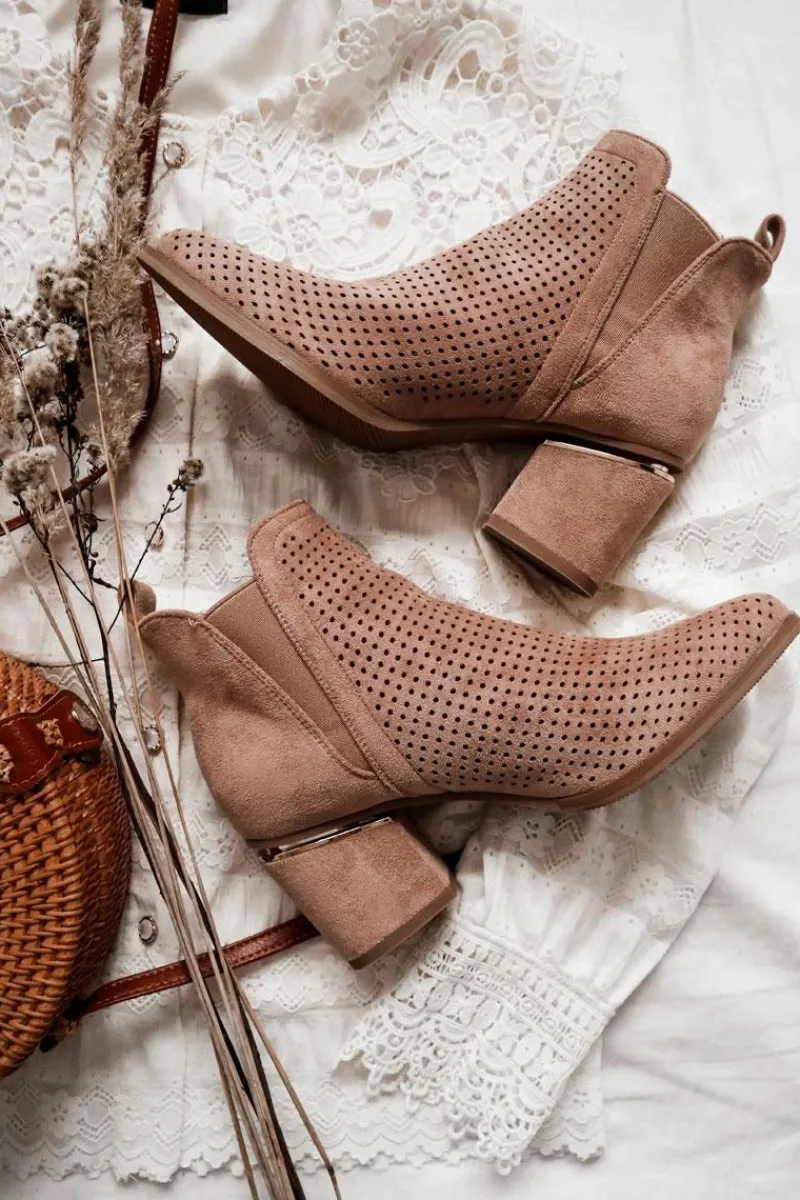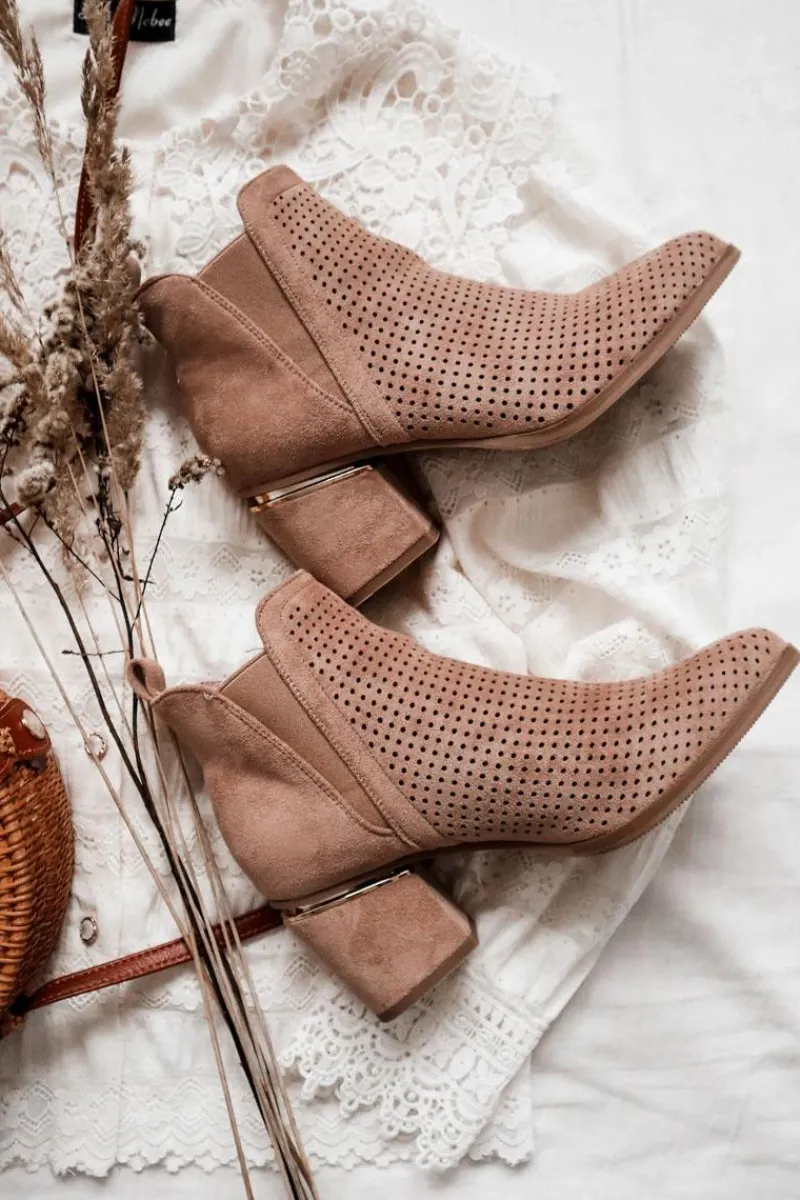 Botki na niewysokim, masywnym słupku wykonane zostały z eko-zamszu w ażurowy wzorek. Piękne i klasyczne botki będą pasować zarówno do spodni jak i długich spódnic. Elastyczna gumka w cholewce sprawia, że buty dopasują się do tęgości nogi. Ozdobny element przy obcasie idealnie komponuje się z całością. Botki są wsuwane. Nie czekaj i kup już teraz! Przy wyborze rozmiaru prosimy sugerować się tabelą rozmiarów.