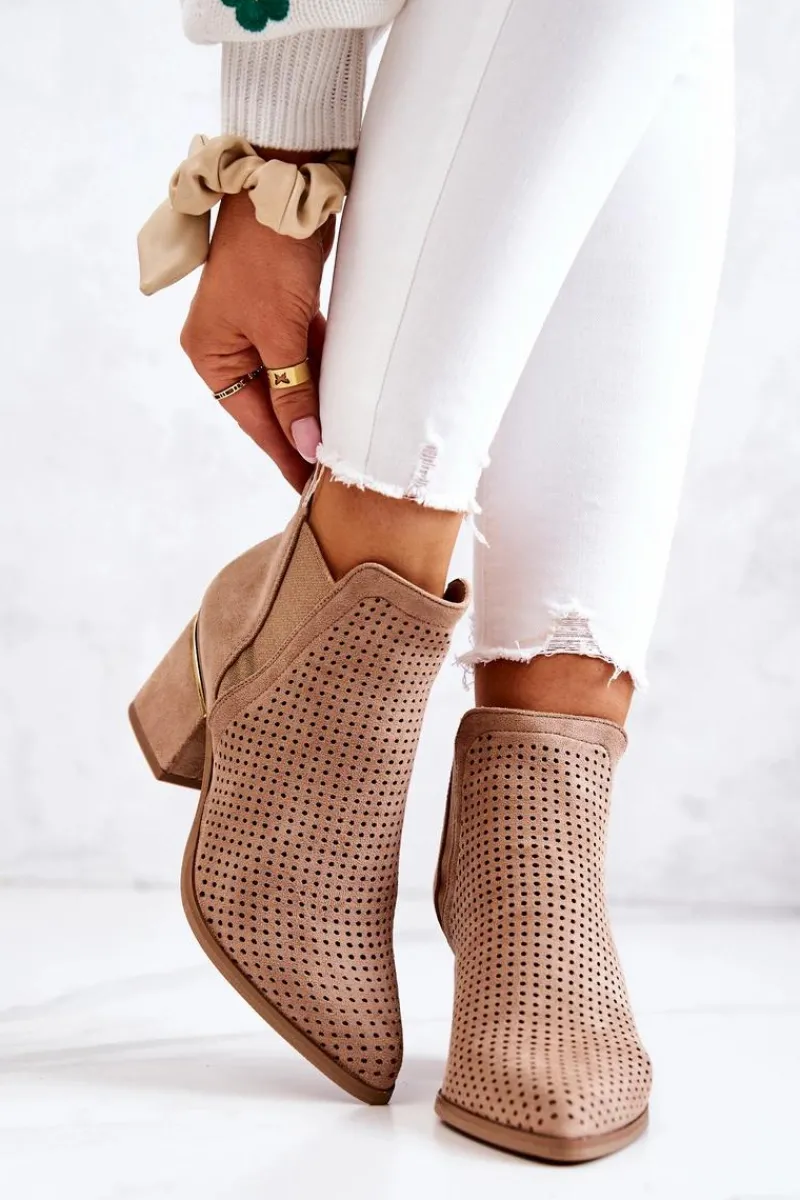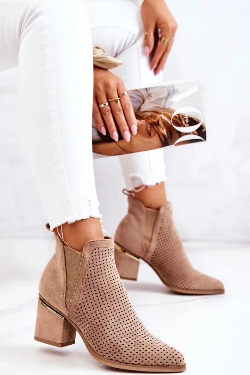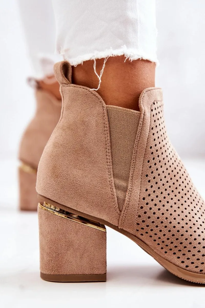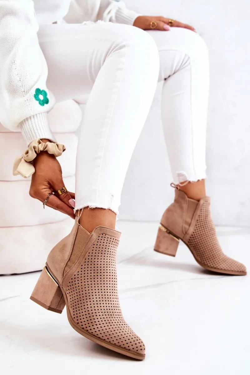 Botki na niewysokim, masywnym słupku wykonane zostały z eko-zamszu w ażurowy wzorek. Piękne i klasyczne botki będą pasować zarówno do spodni jak i długich spódnic. Elastyczna gumka w cholewce sprawia, że buty dopasują się do tęgości nogi. Ozdobny element przy obcasie idealnie komponuje się z całością. Botki są wsuwane. Nie czekaj i kup już teraz! Przy wyborze rozmiaru prosimy sugerować się tabelą rozmiarów.