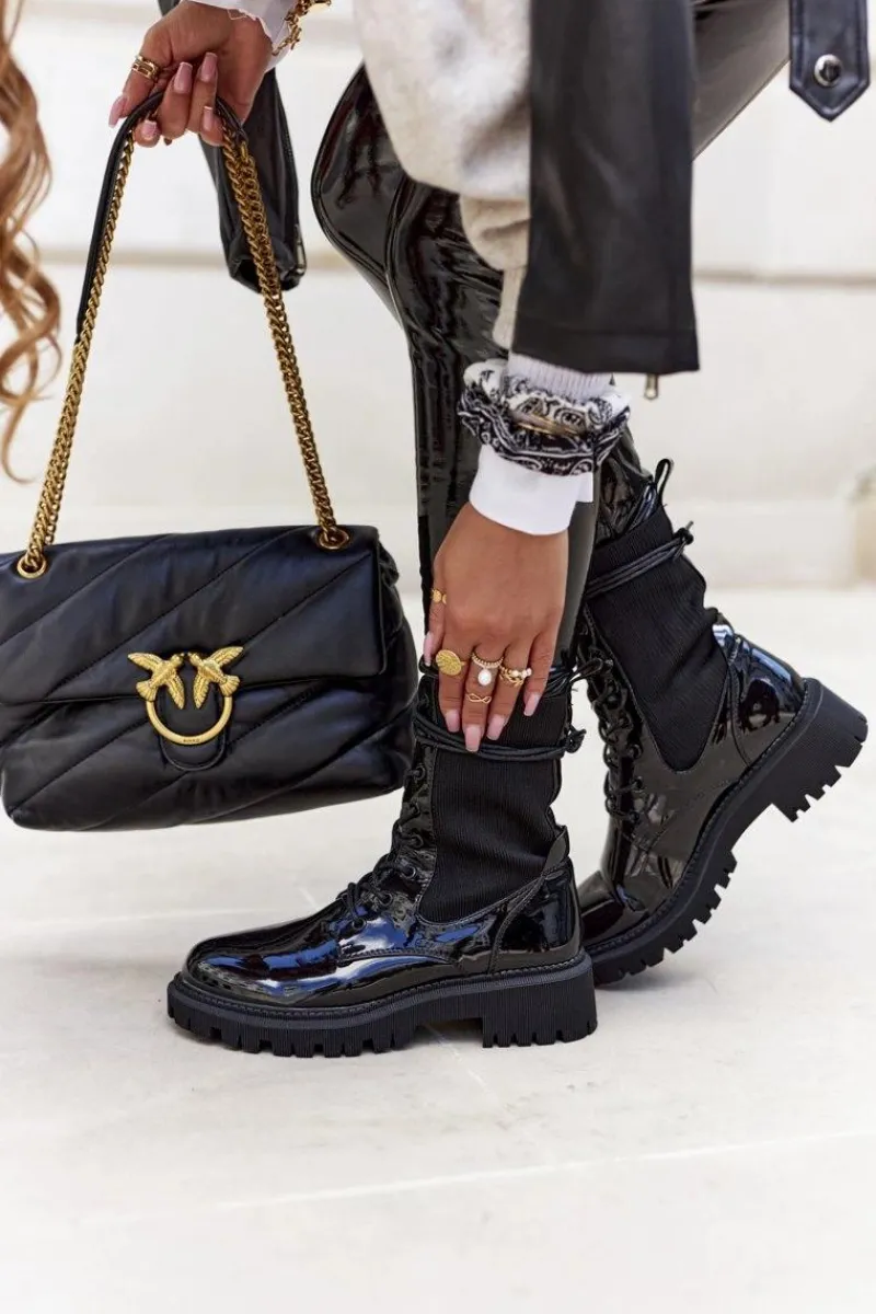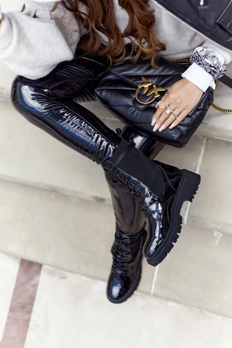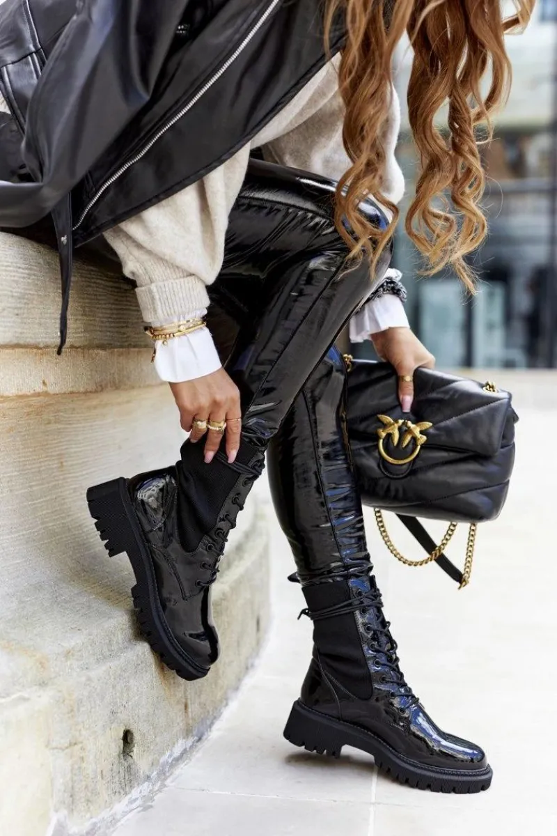 Modne botki, które są hitem tego sezonu! Wierzch wykonany z lakierowanej skóry ekologicznej. Wysoka, rozciągliwa cholewka, z wszytymi po bokach gumkami zapewni idealne dopasowanie. Model klasycznie sznurowany. Przy wyborze rozmiaru prosimy sugerować się tabelą rozmiarów.