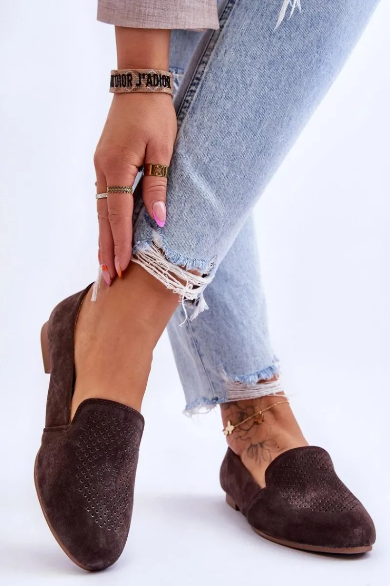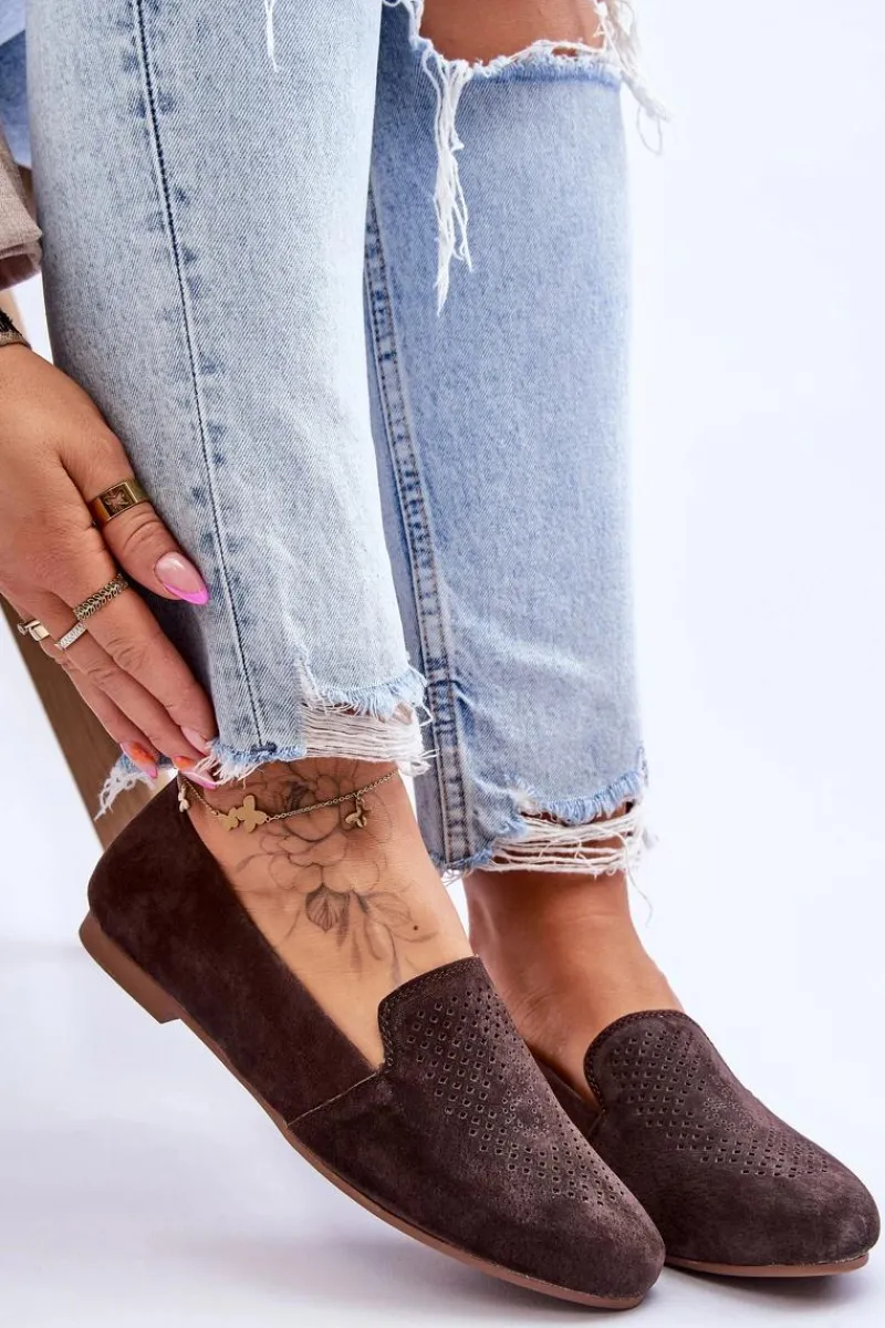 Cudowne mokasyny damskie wykonane z naturalnego zamszu. Na przodzie posiadają ozdobny, ażurowy wzór. Model ten został osadzony na płaskim obcasie i antypoślizgowej podeszwie. Mokasyny posiadają wkładkę Comfort ze skóry naturalnej. Zapiętek w tych butach jest delikatnie usztywniany. Koniecznie powinnaś je mieć! Przy wyborze rozmiaru prosimy sugerować się tabelą rozmiarów.