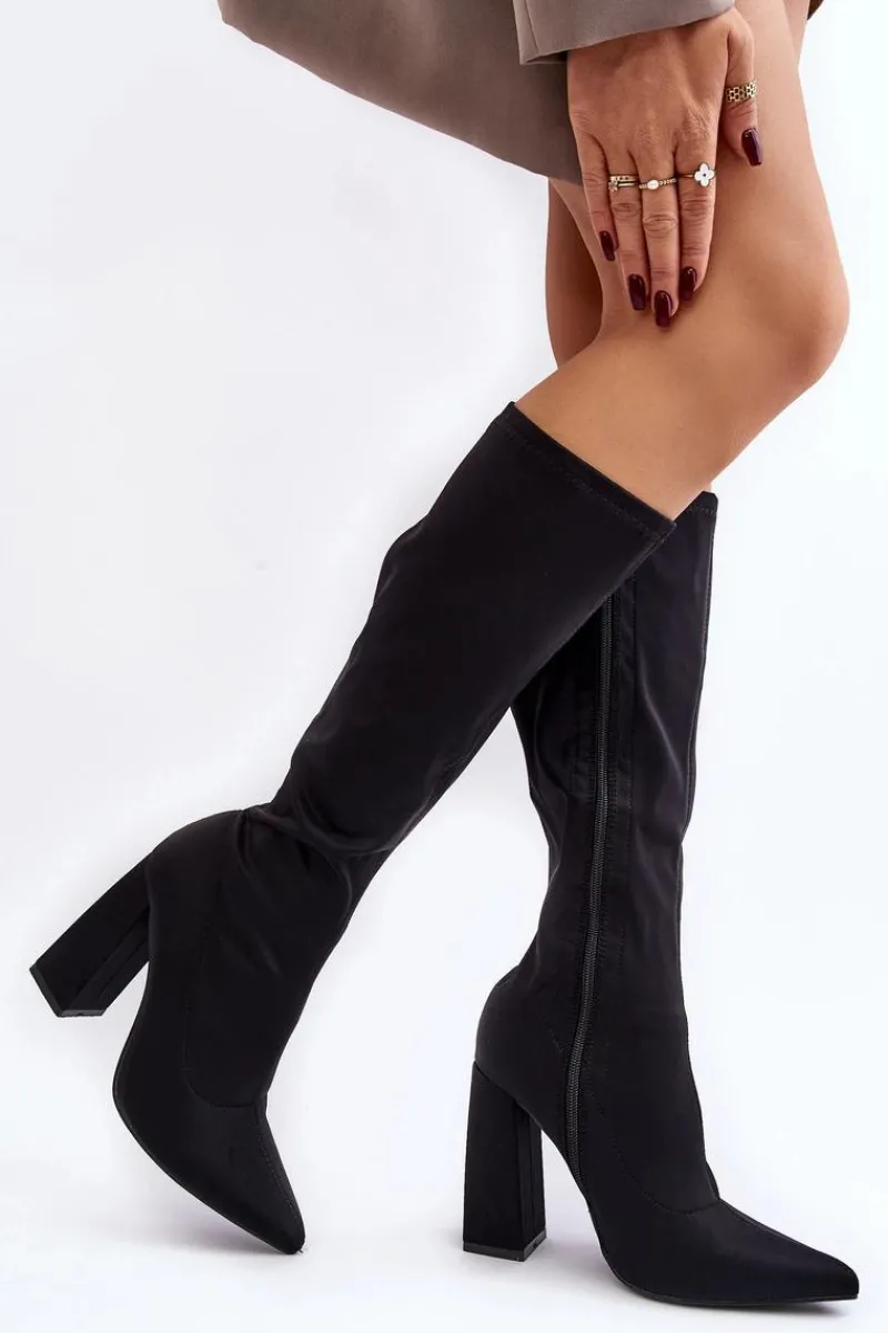 Kozaki damskie wykonane z materiału tekstylnego. Model zapinany na suwak. Cholewka do kolana. Obcas słupek. Noski w szpic optycznie wysmuklą nogi. Idealne sukienek czy spódnic! Koniecznie powinnaś je mieć! Przy wyborze rozmiaru prosimy sugerować się tabelą rozmiarów.
