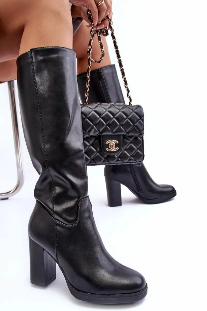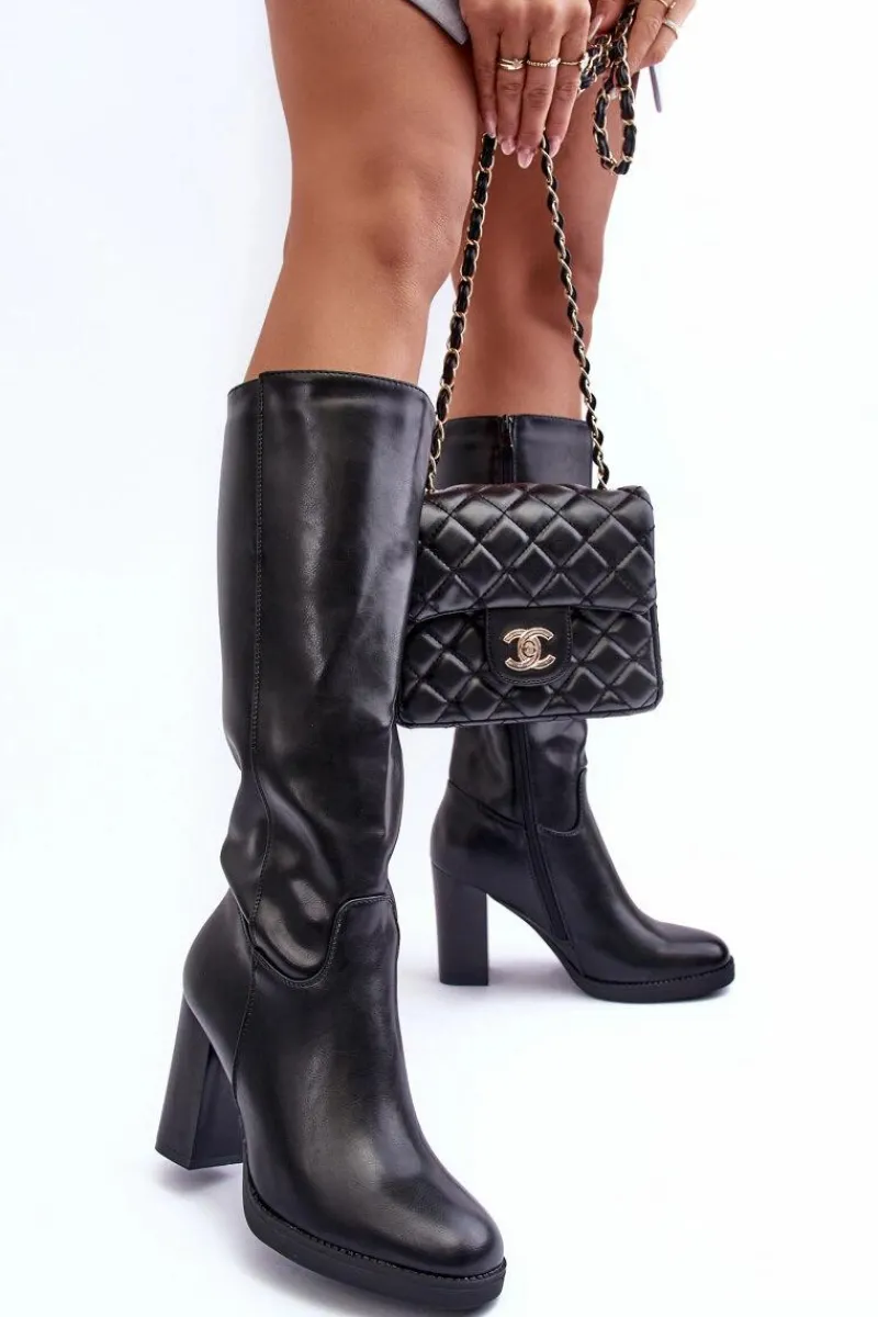 Eleganckie kozaki damskie z cholewką przed kolano. Wykonane z eko skóry. Osadzone na obcasie w postaci słupka. Zapinane na suwak po wewnętrznej stronie cholewki. Środek ocieplony kocem obuwniczym. Zapiętek w tym obuwiu jest usztywniony. Wykorzystasz je w wielu stylizacjach! Przy wyborze rozmiaru prosimy sugerować się tabelą rozmiarów.
