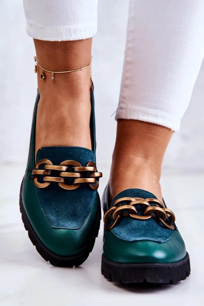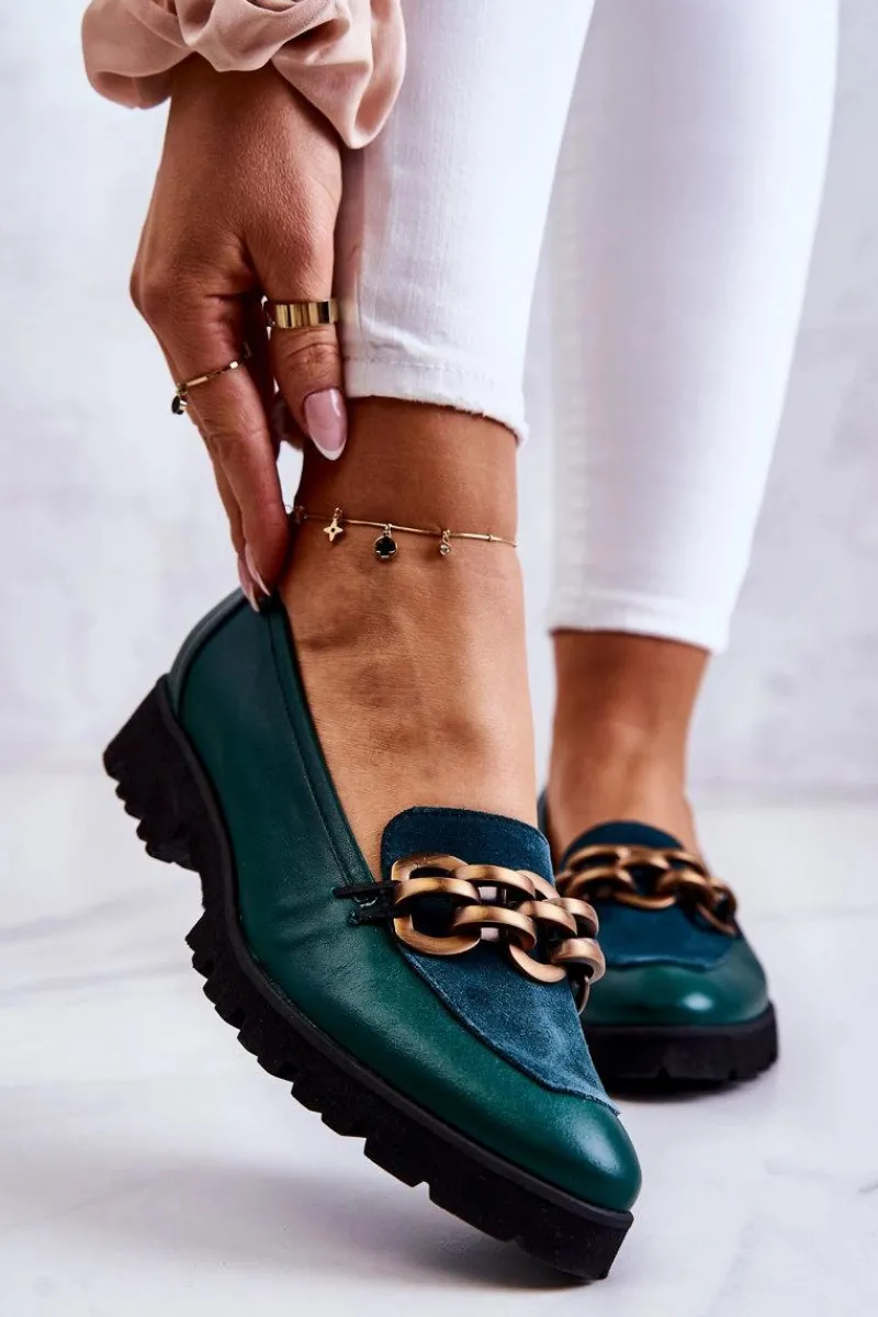 Cudne mokasyny wykonane z naturalnej skóry ze wstawką z naturalnego zamszu. Posiadają usztywniany zapiętek. Z przodu znajduje się elegancka ozdoba w postaci łańcucha. Nosek zakryty, w kształcie migdała. Miękka i komfortowa w użytkowaniu wkładka została wykonana z naturalnej skóry. Stabilny, płaski obcas wraz z delikatną platformą zostały wykonane z tworzywa sztucznego. Świetny model na wiele okazji! Koniecznie powinnaś mieć go w swojej kolekcji obuwia! Przy wyborze rozmiaru prosimy sugerować się tabelą rozmiarów.