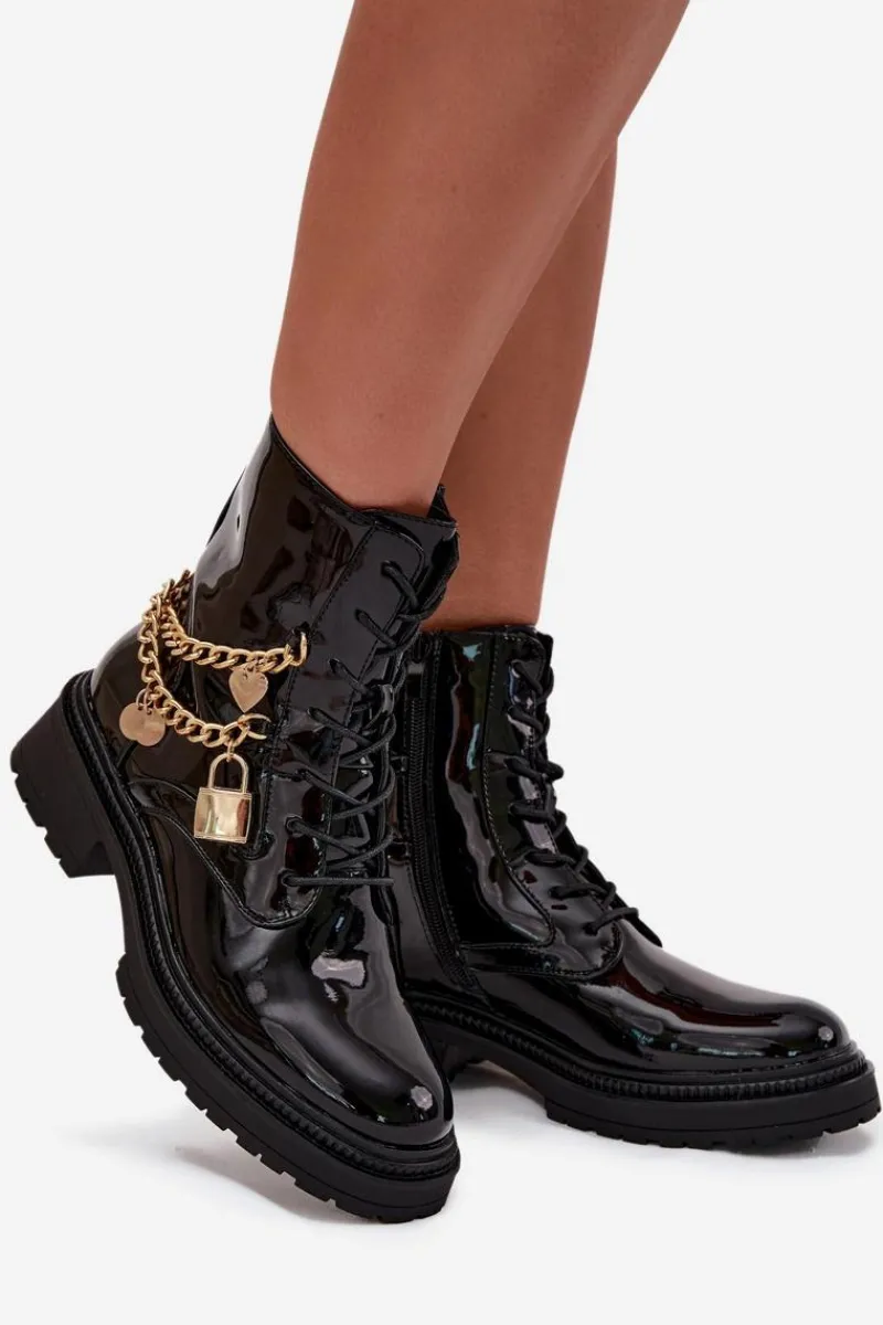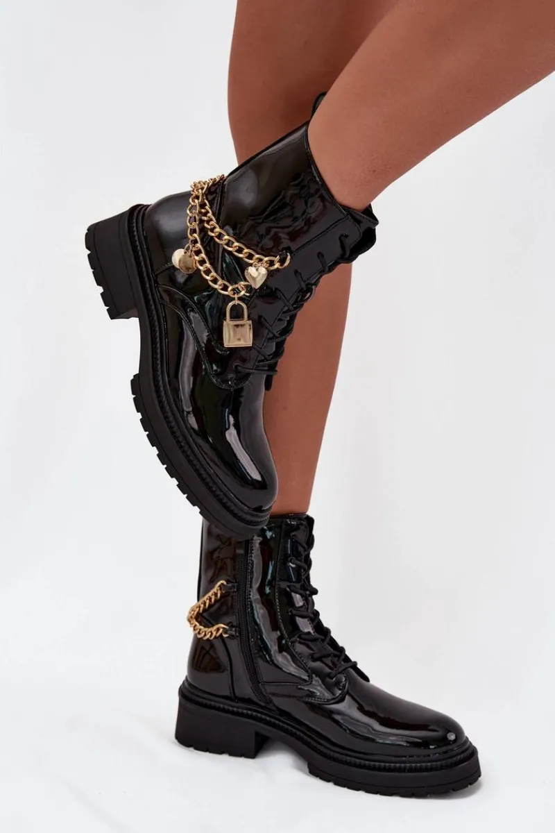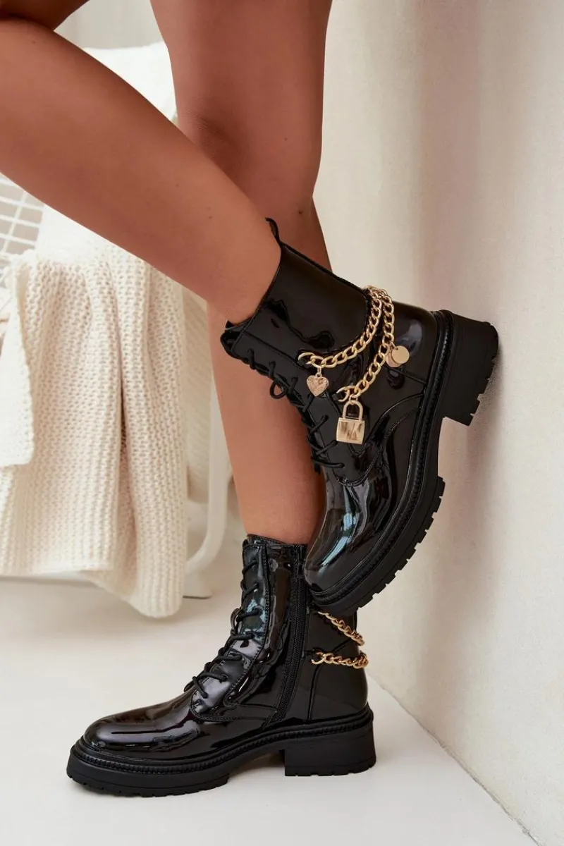 Stylowe botki damskie z eko skóry to doskonała propozycja na chłodniejsze dni. Ozdobione złotym łańcuchem z zawieszkami, które dodają modnego akcentu. Model zapinany na zamek i sznurowany umożliwia idealne dopasowanie do stopy. Środek ocieplony kocem obuwniczym gwarantuje ciepło i komfort, nawet w mroźne dni. Idealne na co dzień, te botki połączą funkcjonalność z modnym wyglądem, doskonale komponując się w różnych jesienno-zimowych stylizacjach. Przy wyborze rozmiaru prosimy sugerować się tabelą rozmiarów.