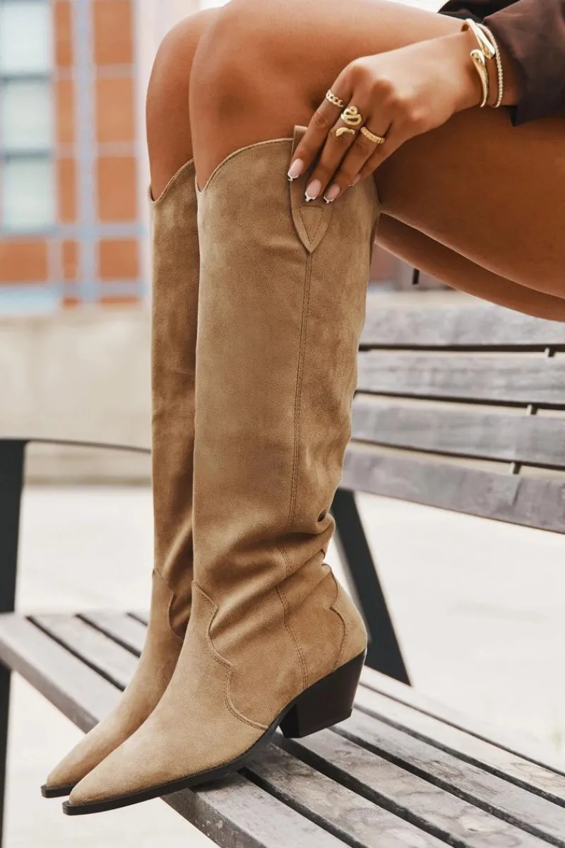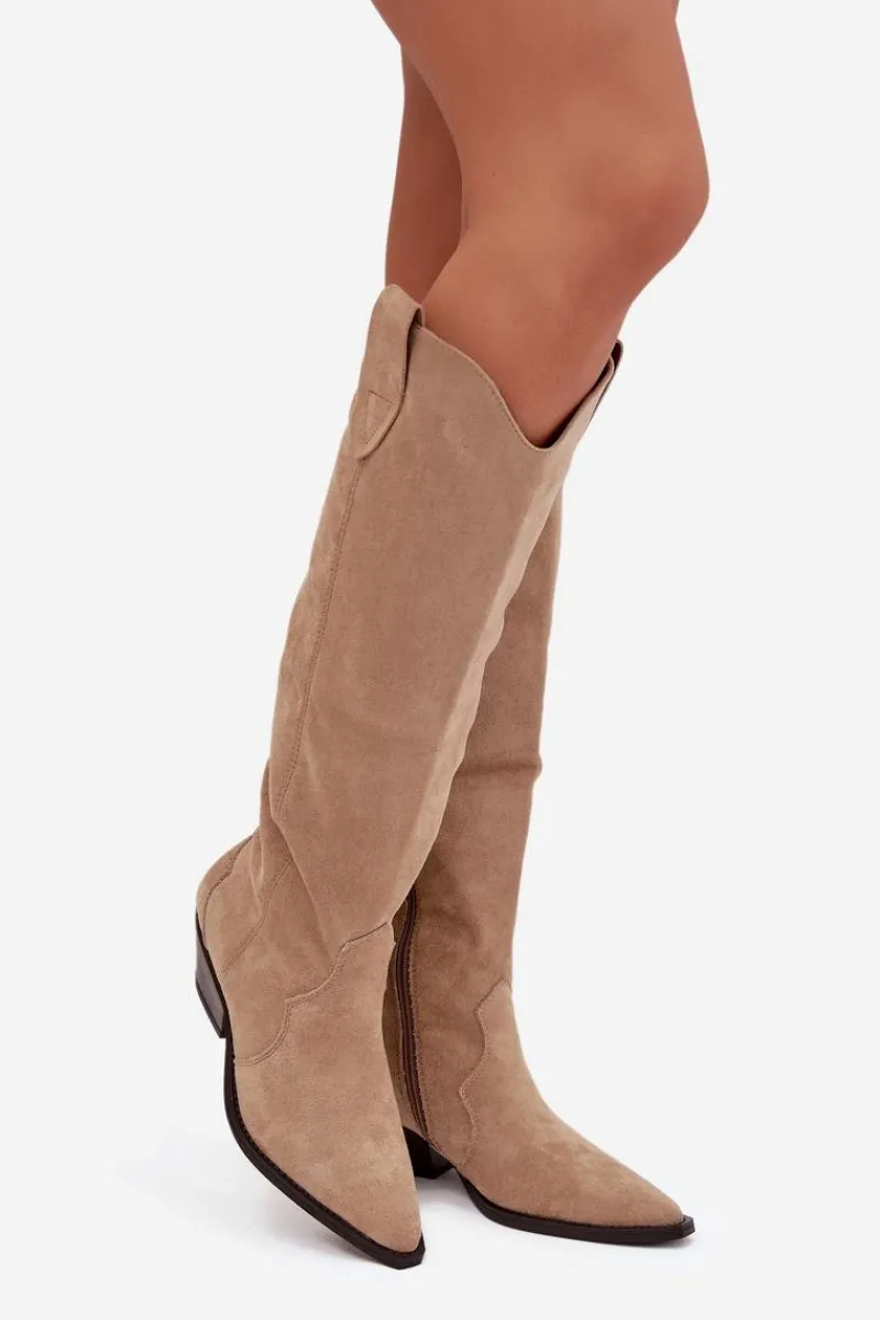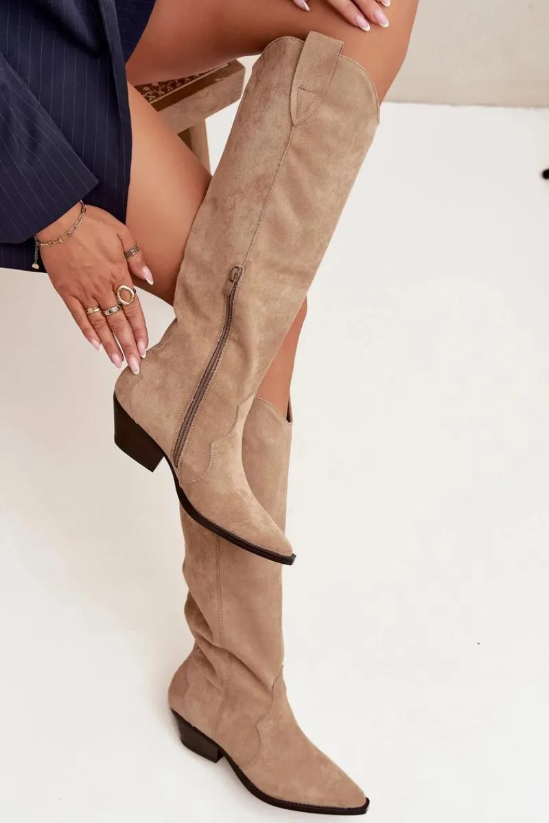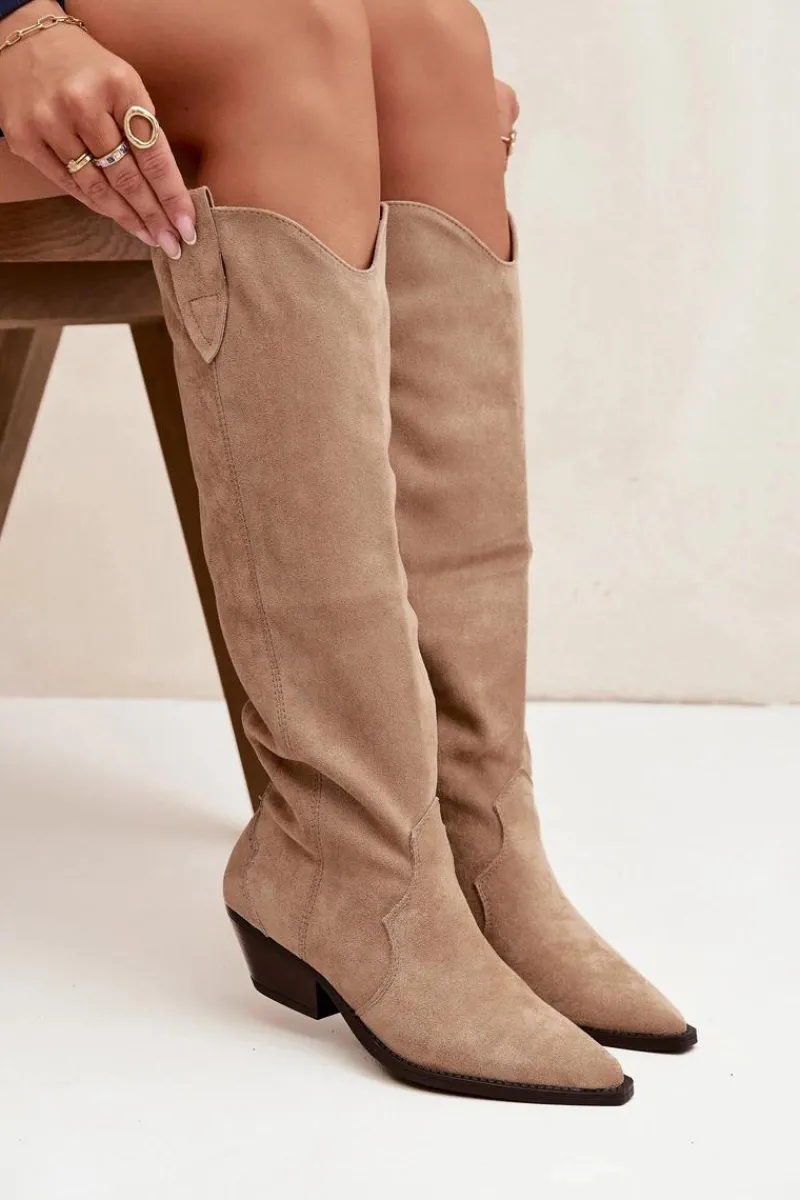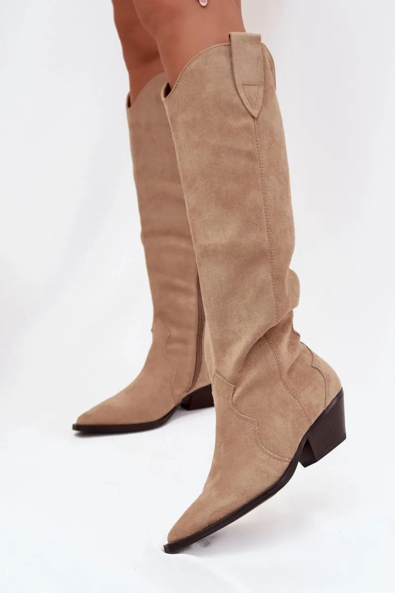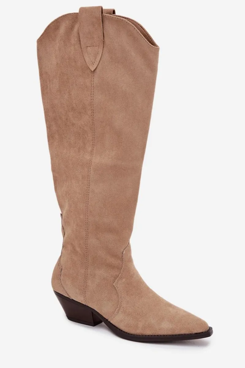 Kozaki kowbojki damskie wykonane z eko zamszu to propozycja, która doskonale wpisuje się w najnowsze trendy. Charakterystyczny fason ze smukłymi, szpiczastymi noskami i ściętym obcasem nawiązuje do klasycznego westernowego stylu, jednocześnie prezentując się elegancko i nowocześnie. Obcas nie tylko dodaje sylwetce lekkości, ale też zapewnia wygodę podczas chodzenia. Model wsuwany z dodatkowym suwakiem umieszczonym na dole cholewki gwarantuje łatwość zakładania i dobre dopasowanie do nogi. Wnętrze ocieplone kocem obuwniczym, dzięki czemu kozaki świetnie sprawdzą się w chłodniejsze dni. To stylowe obuwie, które doskonale komponuje się zarówno z jeansami i koszulą, jak i z sukienkami czy spódnicami, dodając stylizacji wyjątkowego, kowbojskiego charakteru. Przy wyborze rozmiaru prosimy sugerować się poniższą tabelą rozmiarów.