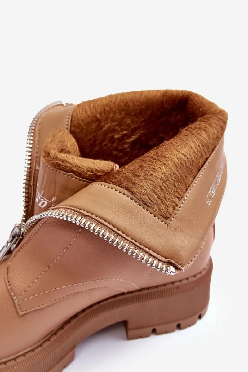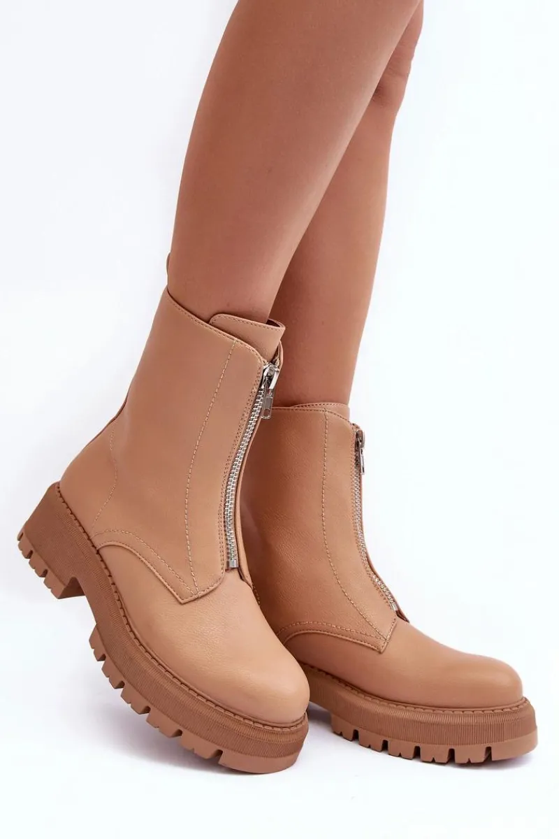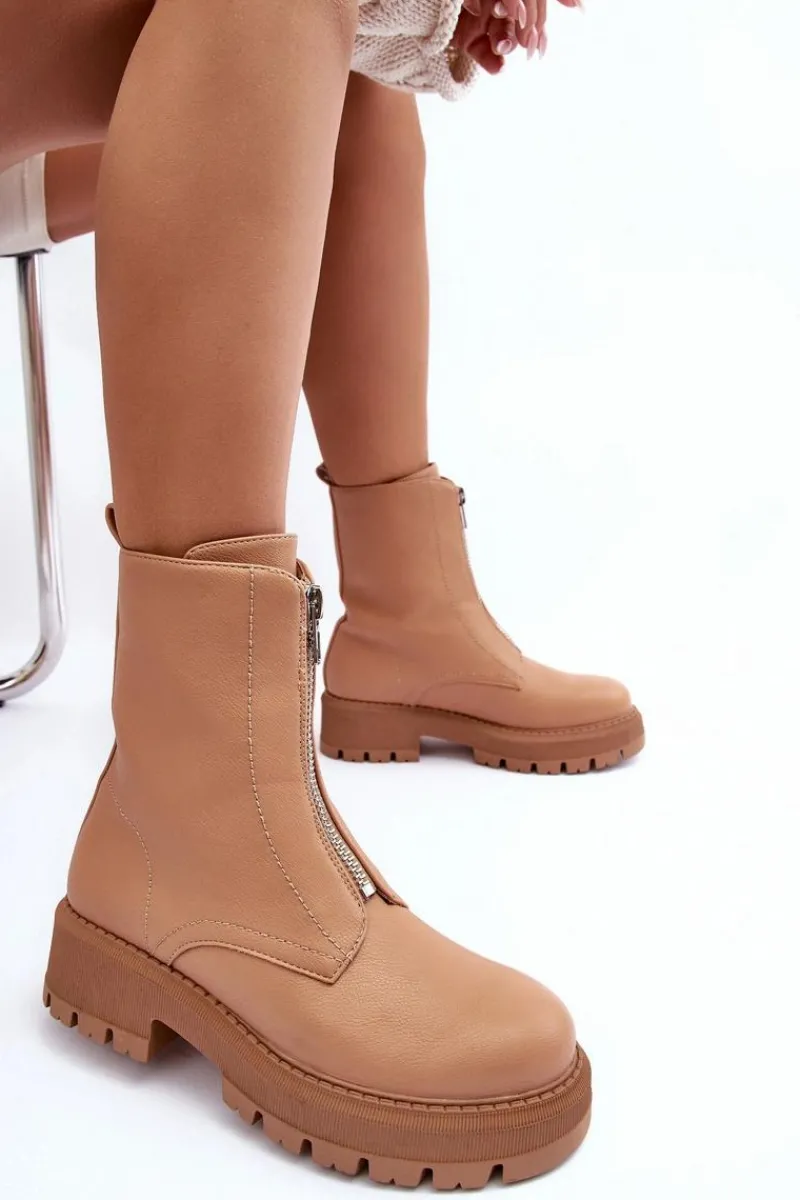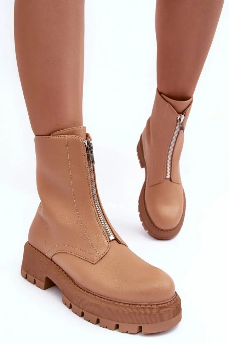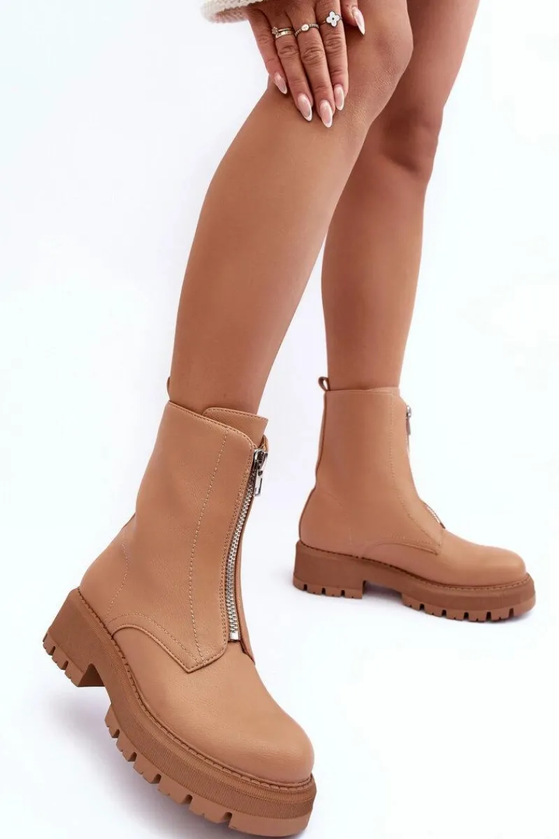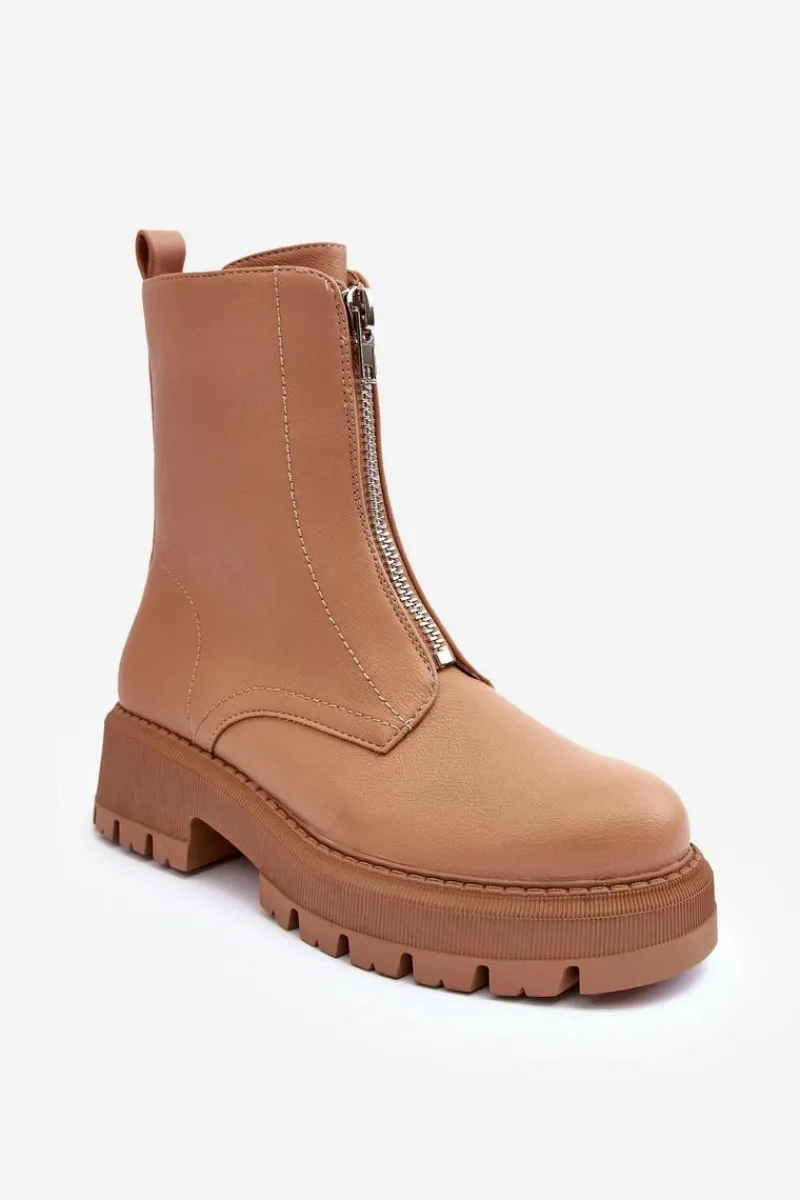 Modne botki damskie wykonane z eko skóry. Model z zaokrąglonym noskiem. Osadzone na płaskim, stabilnym obcasie i platformie. Zapinane na suwak z przodu. Środek ocieplony kocem obuwniczym. Zapiętek w tym obuwiu jest usztywniony. Przy wyborze rozmiaru prosimy sugerować się tabelą rozmiarów.