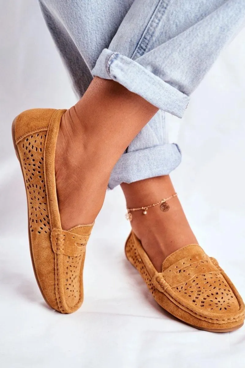 New Zamszowe Ażurowe Mokasyny Damskie S.Barski Camel Damskie Mokasyny Damskie Zamszowe