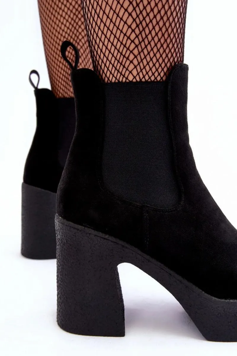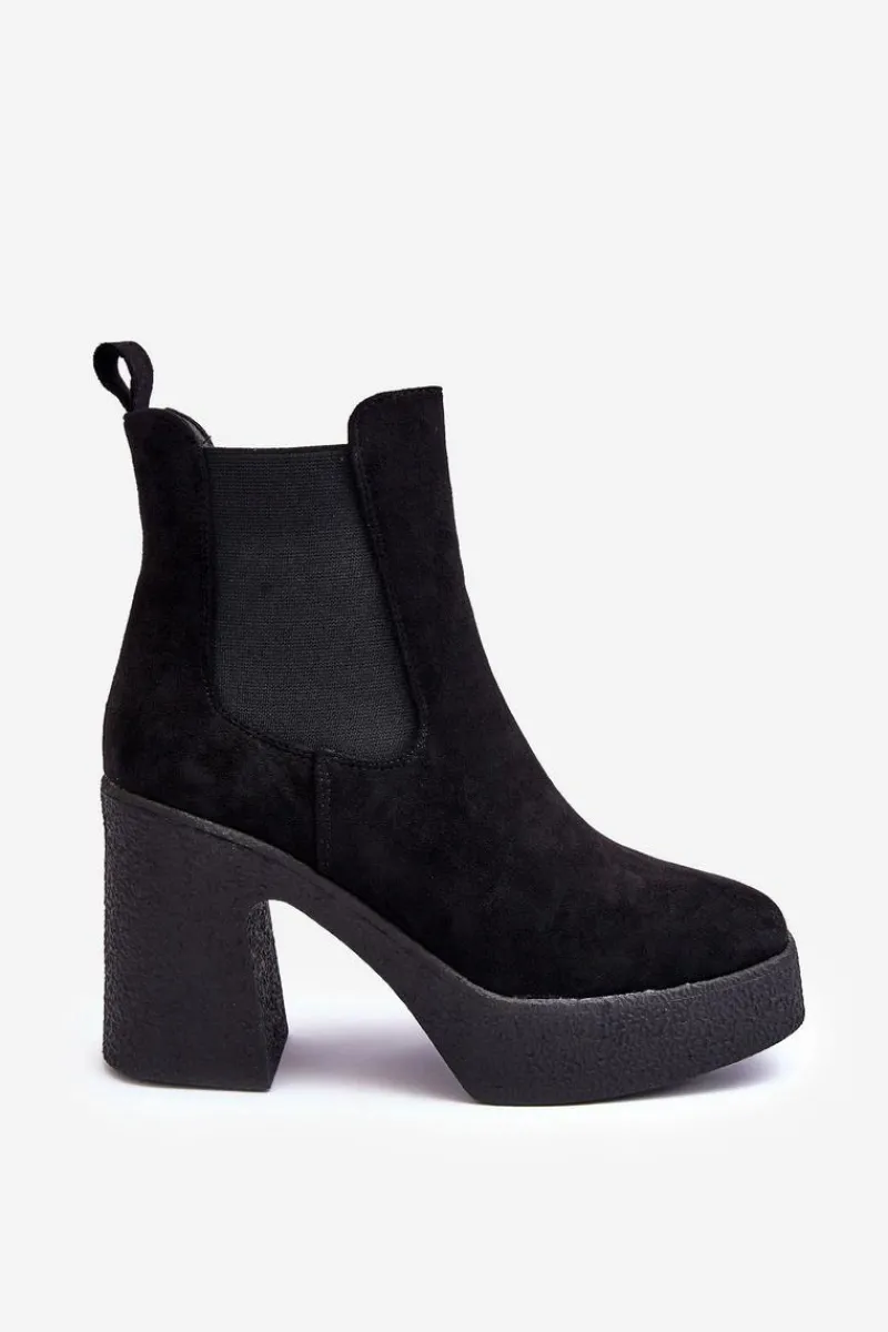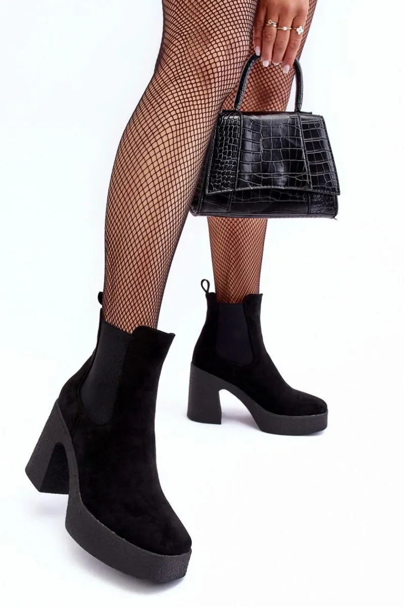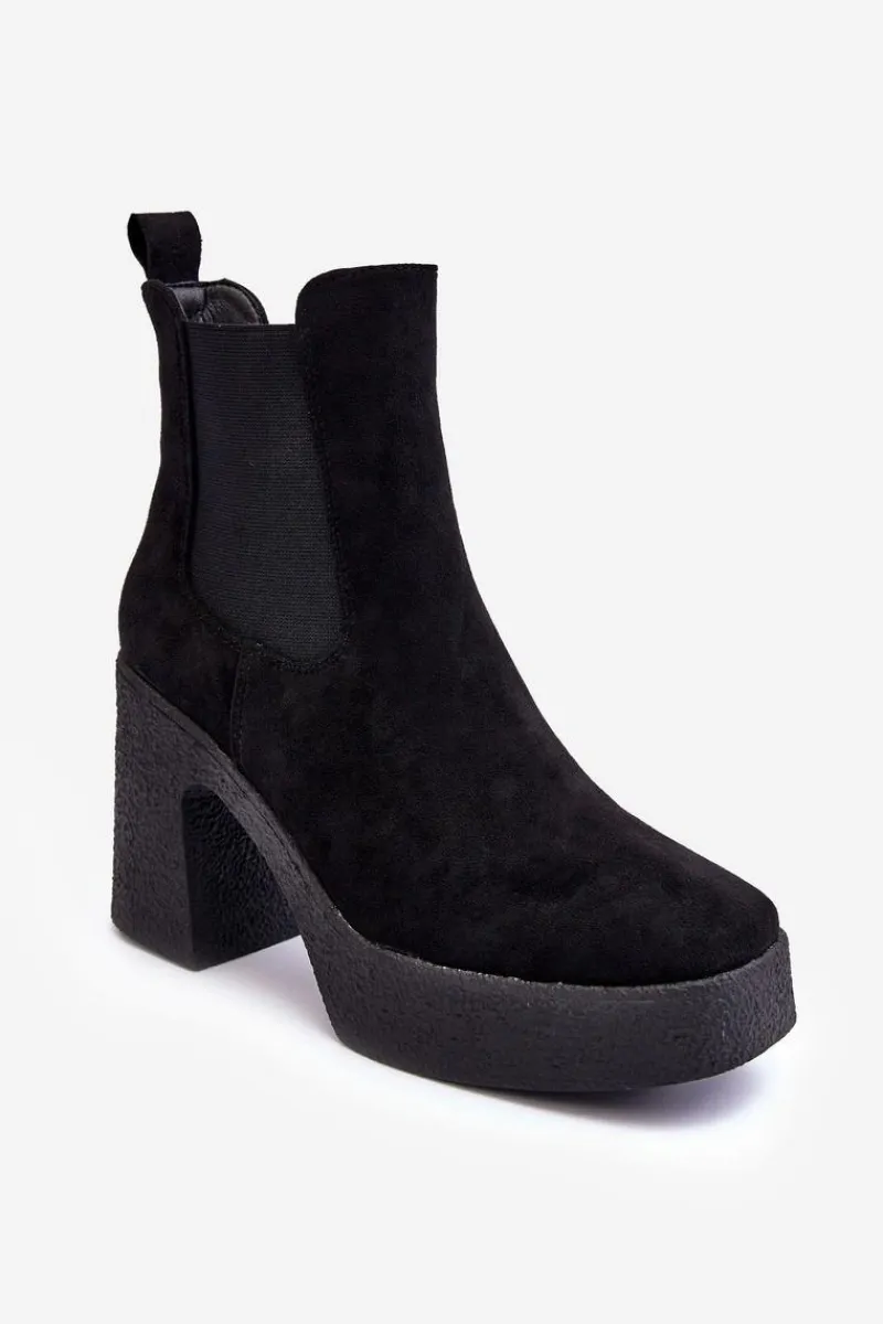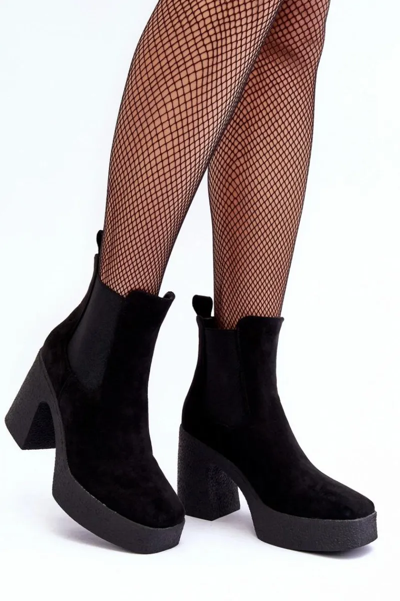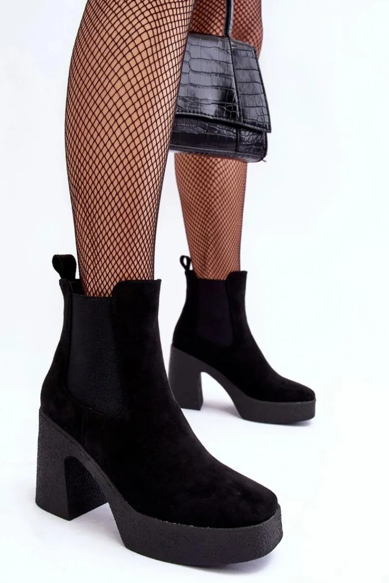 Botki wykonane z miłego w dotyku eko zamszu. Osadzone na masywnym słupku i grubej podeszwie. Buty te posiadają lekko kwadratowy nosek oraz usztywniany zapiętek. Model wsuwany. Elastyczne wstawki na cholewce. Środek ocieplony kocem obuwniczym. Świetnie uzupełnienie jesienno-zimowych stylizacji! Przy wyborze rozmiaru prosimy sugerować się tabelą rozmiarów.