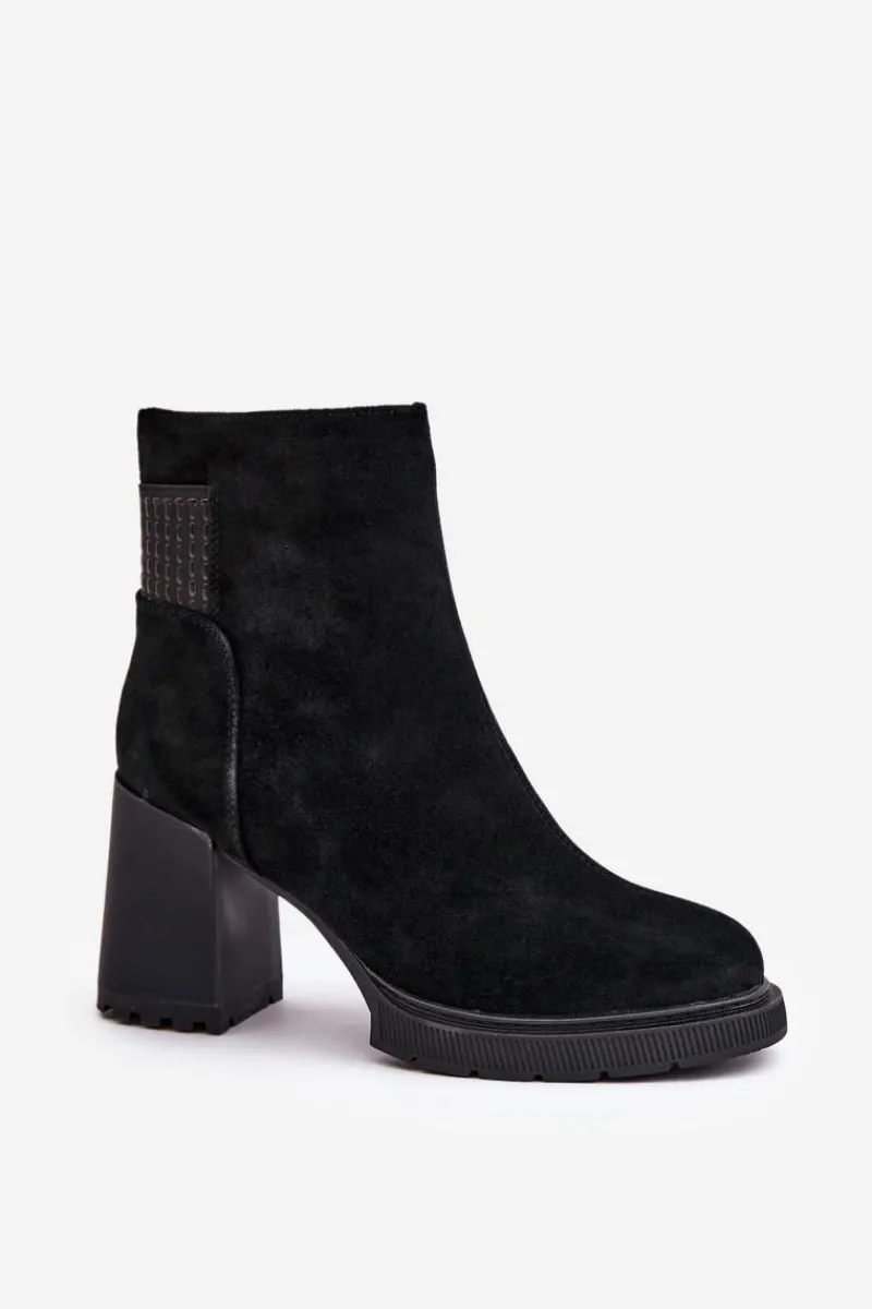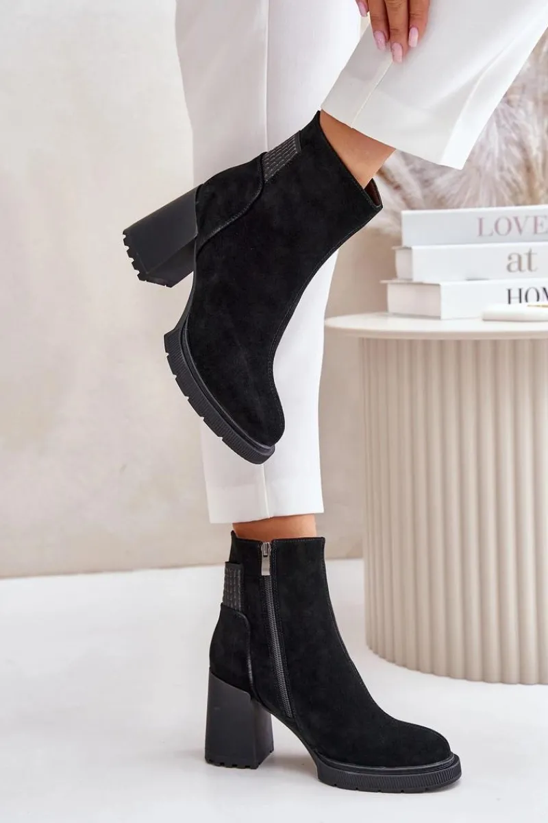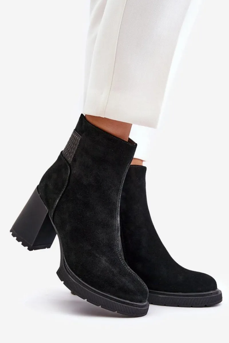 Eleganckie botki wykonane z naturalnego zamszu to idealny wybór na chłodniejsze dni. Osadzone na stabilnym obcasie typu słupek, zapewniają komfort noszenia przez cały dzień. Wnętrze ocieplone kocem obuwniczym, co gwarantuje ciepło i wygodę nawet podczas mroźnych dni. Dzięki praktycznemu zapięciu na zamek, zakładanie i zdejmowanie jest szybkie i łatwe. Przy wyborze rozmiaru prosimy sugerować się tabelą rozmiarów.