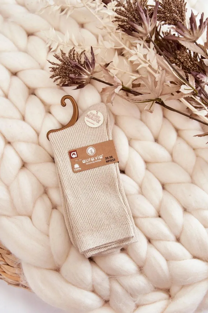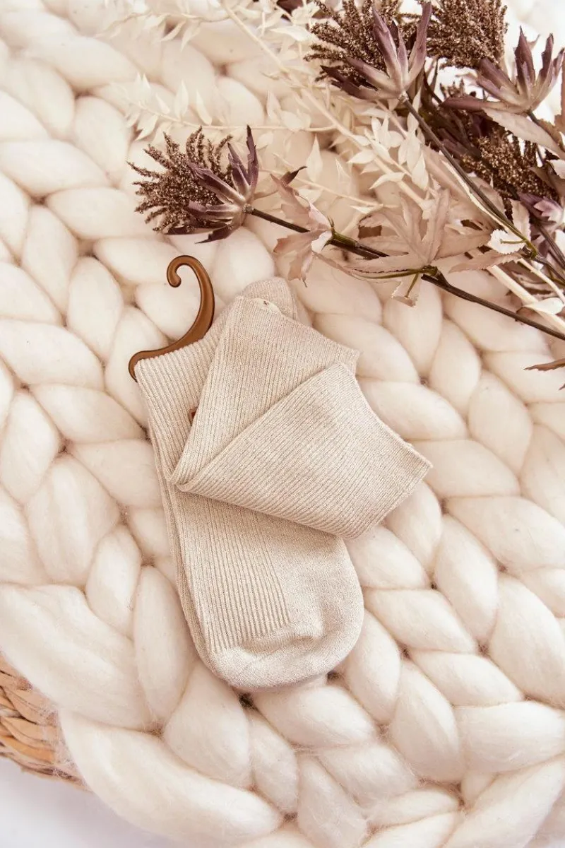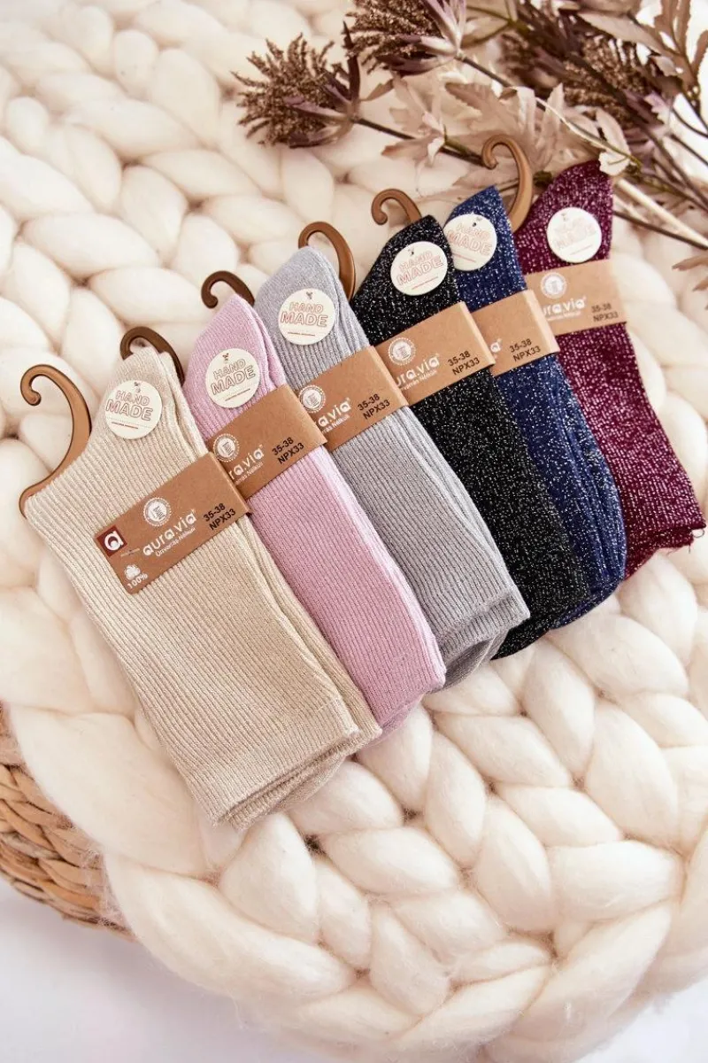 Damskie skarpetki o modnym fasonie zostały wykonane z bawełnianej tkaniny z dodatkiem lurexu, czyli nici metalizowanej. Skarpetki te są bezuciskowe. Model prążkowany, wykonany z wytrzymałej, przewiewnej tkaniny. Dodatkowo skarpetki są antybakteryjne. Model ten na pewno świetnie będzie prezentować się w wielu stylizacjach w chłodniejsze dni!