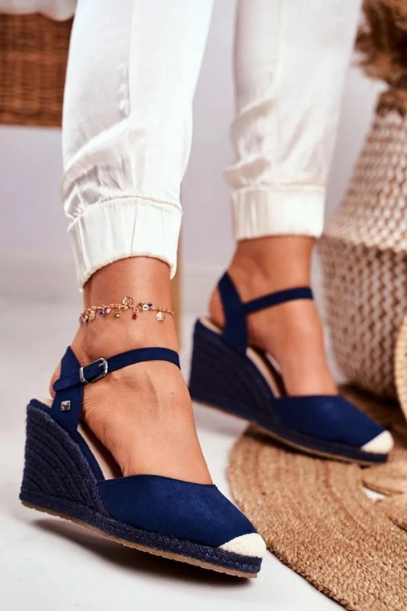 Wspaniałe sandały na modnej plecionej koturnie to klasyka wśród damskiego letniego obuwia. Wierzchnia część obuwia została wykonana z wysokiej jakości ekologicznego zamszu, który jest niezwykle przyjemny w dotyku. Mięciutka wkładka wykonana ze skóry naturalnej pozwoli na wiele godzin komfortowego korzystania z wysokich butów! Sandały z zabudowanym przodem, zapinane wokół kostki. Klasyczny wzór połączony z niespotykaną dotąd wygodą to doskonały przepis na praktyczne i oryginalne buty. Przy wyborze rozmiaru prosimy sugerować się tabelą rozmiarów.