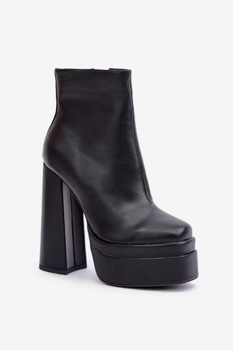 Botki damskie wykonane z eko skóry, osadzone na masywnej platformie i wysokim obcasie, które dodają charakteru każdej stylizacji. Model z zaokrąglonymi noskami zapewnia komfort noszenia. Wnętrze ocieplane kocem obuwniczym, idealne na chłodniejsze dni. Praktyczne zapięcie na zamek ułatwia zakładanie. Stylowe i wygodne, doskonałe na co dzień i specjalne okazje. Przy wyborze rozmiaru prosimy sugerować się tabelą rozmiarów.