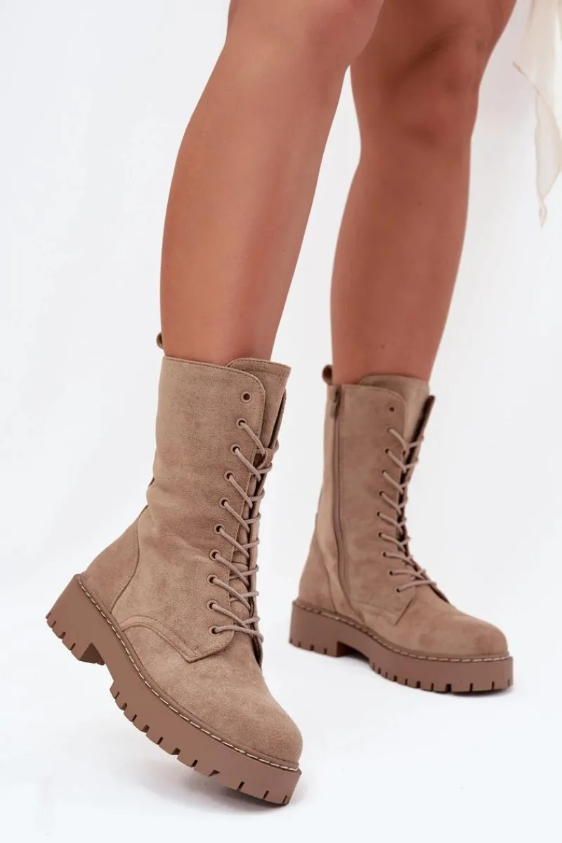Klasyczne botki damskie typu workery wykonane z eko zamszu. Model osadzony na platformie z płaskim obcasem zapewnia stabilny krok, a ocieplenie gwarantuje komfort w chłodniejsze dni. Sznurowanie w połączeniu z zamkiem umożliwia łatwe zakładanie i idealne dopasowanie do stopy, co czyni je świetnym wyborem do codziennych, casualowych stylizacji. Przy wyborze rozmiaru prosimy sugerować się tabelą rozmiarów.