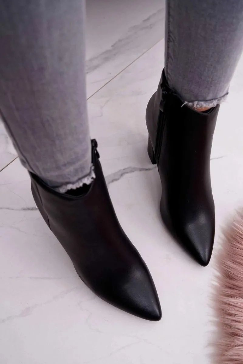 Czarne botki w klasycznej wersji z noskiem w szpic sprawdzą się w każdej stylizacji. Suwak na boku cholewki wygląda modnie oraz ułatwia zakładanie. Wnętrze pokryte kocem obuwniczym, który zapewni nam ciepło w chłodniejsze dni. Przy wyborze rozmiaru prosimy sugerować się tabelą rozmiarów.