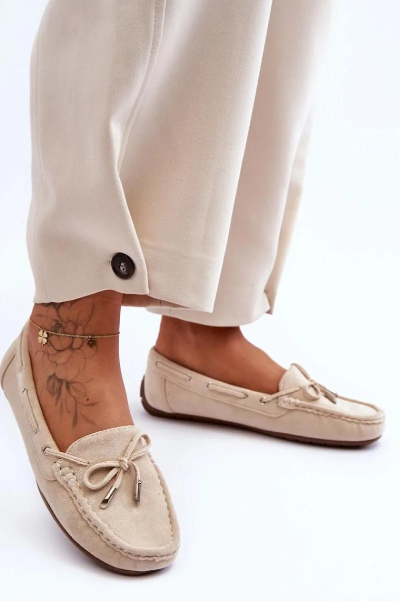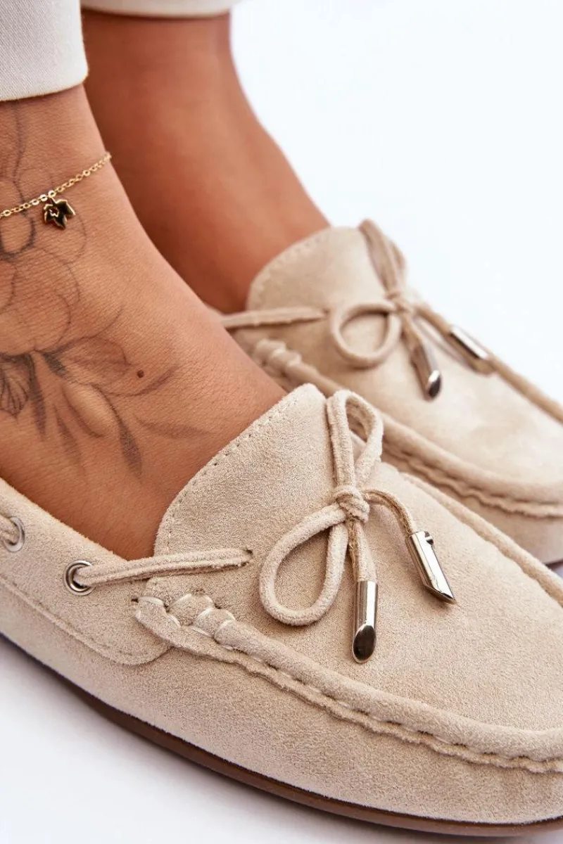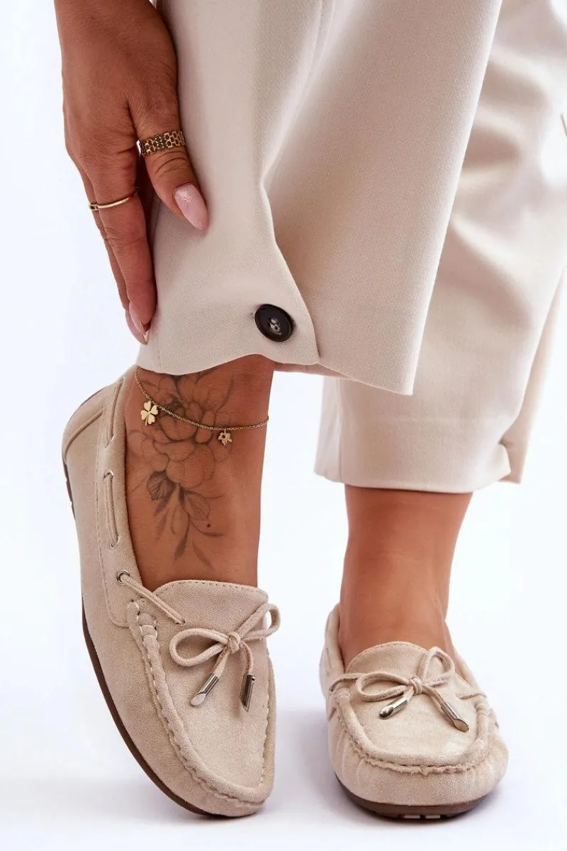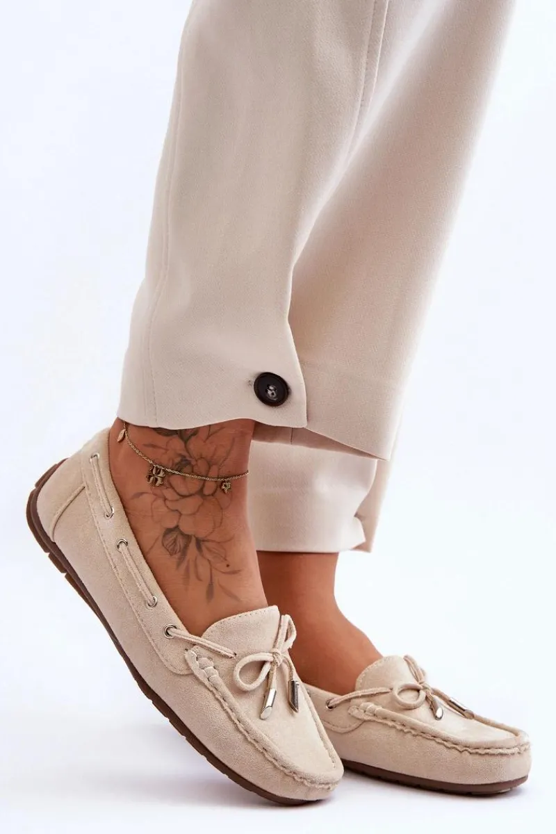 Damskie, klasyczne mokasyny zostały wykonane z eko zamszu. Model ten posiada na przodzie ozdobną kokardkę oraz przeplatające się przez boki cholewki sznureczki. Mokasyny osadzono na antypoślizgowej podeszwie. Miękka wkładka z eko skóry zapewni komfort podczas użytkowania obuwia. Dodatkowo jest delikatnie perforowana. Koniecznie powinnaś je mieć w swojej kolekcji obuwia! Przy wyborze rozmiaru prosimy sugerować się tabelą rozmiarów.