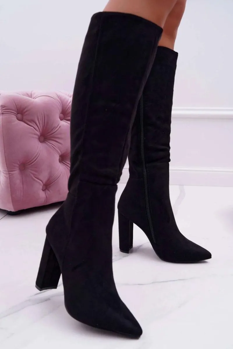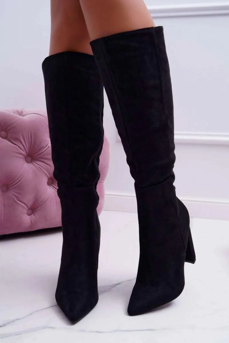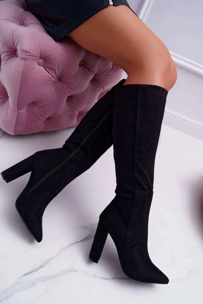 Modne botki na słupku, w całości wykonane z ekozamszu. Delikatny słupek uniesie i optycznie wysmukli sylwetkę. Wysokość do kolana. Przy wyborze rozmiaru prosimy sugerować się tabelą rozmiarów.