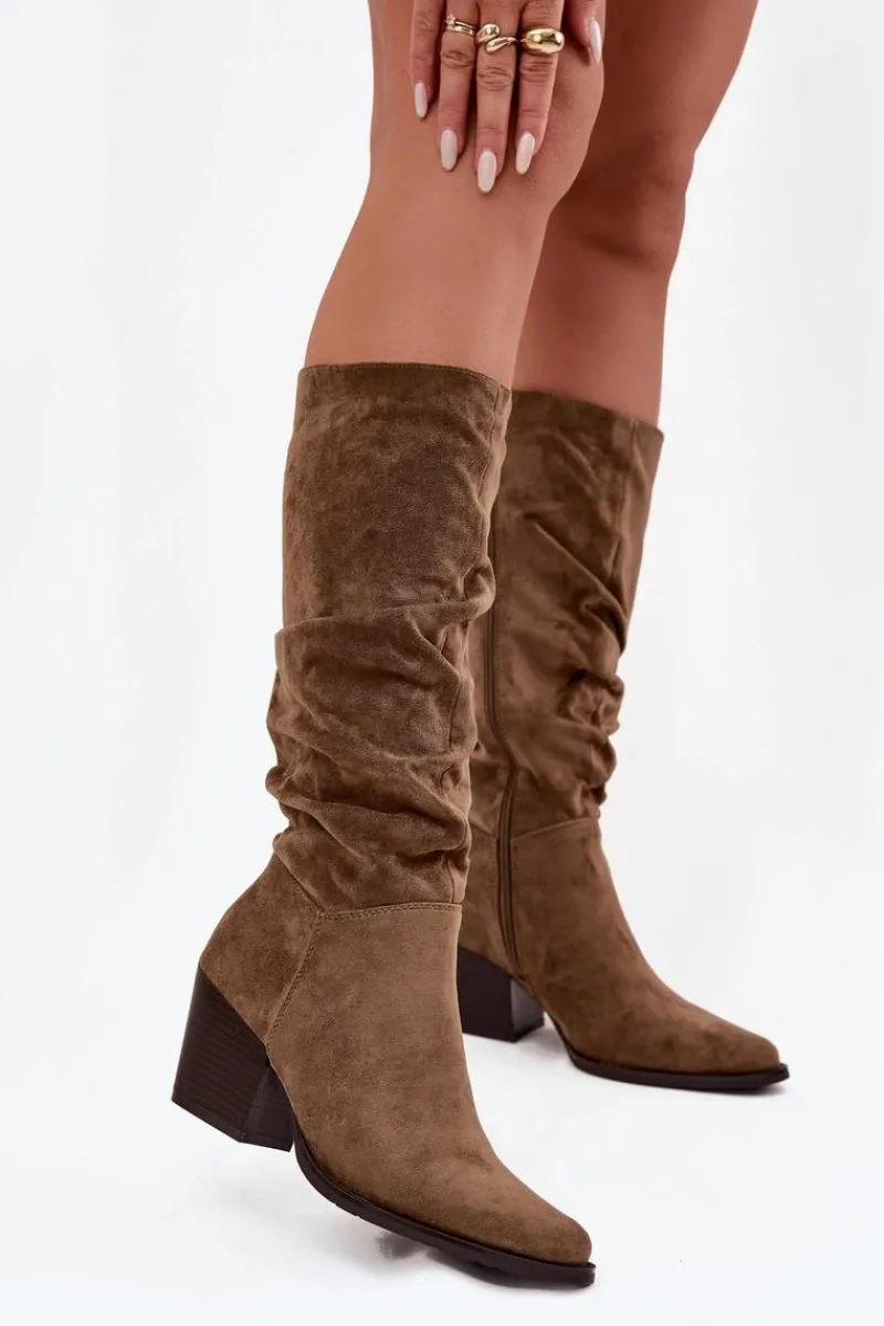 Kozaki damskie wykonane z eko zamszu to stylowa propozycja dla kobiet ceniących elegancję w modnym wydaniu. Model wyróżnia się marszczoną cholewką, która dodaje całości oryginalnego charakteru. Osadzone na stabilnym, ściętym obcasie typu słupek, subtelnie wysmuklają sylwetkę, zapewniając jednocześnie wygodę podczas noszenia. Szpiczaste noski podkreślają kobiecy styl, a praktyczne zapięcie na zamek ułatwia zakładanie. Wnętrze ocieplane miękkim kocem obuwniczym gwarantuje ciepło w chłodniejsze dni. To kozaki, które doskonale dopełnią zarówno eleganckie, jak i codzienne stylizacje. Przy wyborze rozmiaru prosimy sugerować się tabelą rozmiarów.